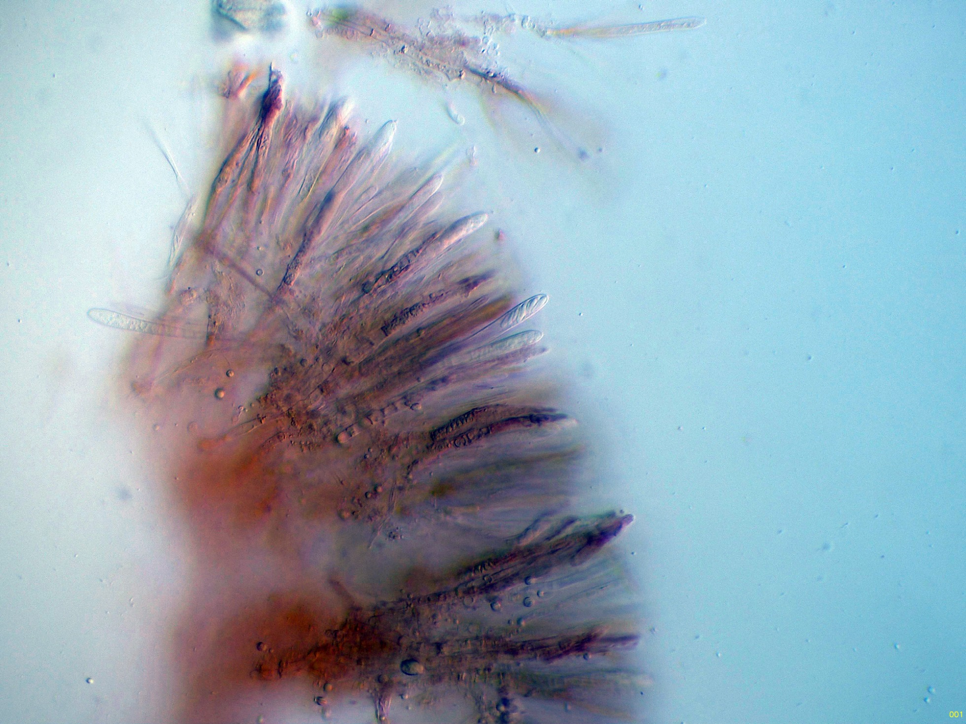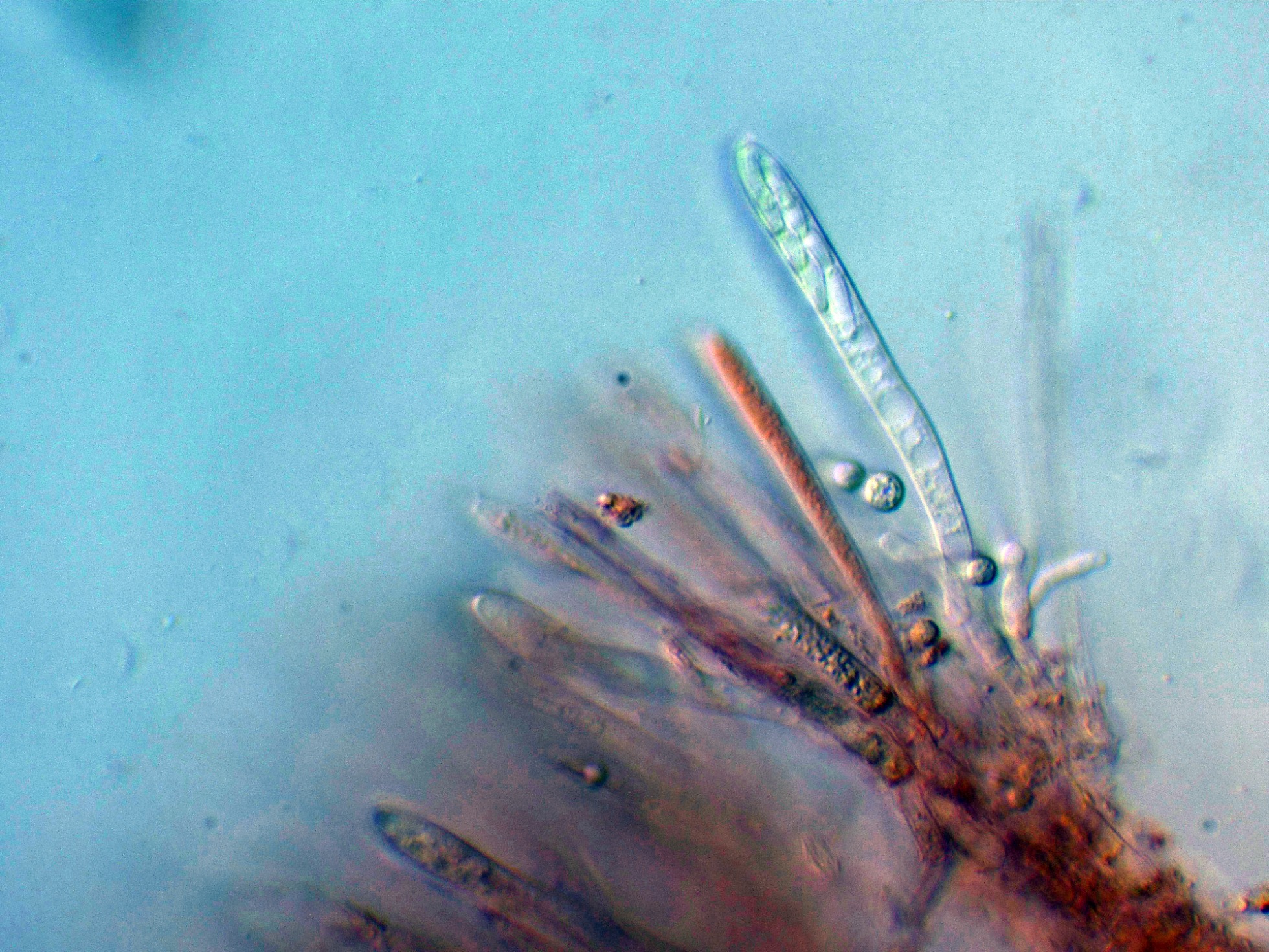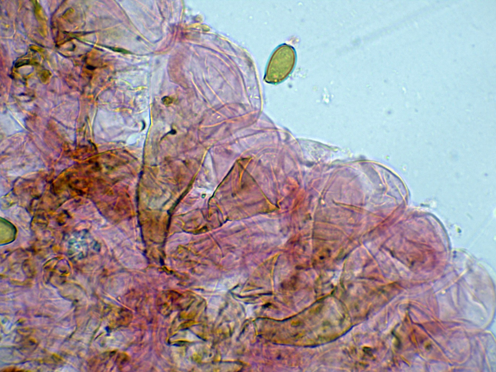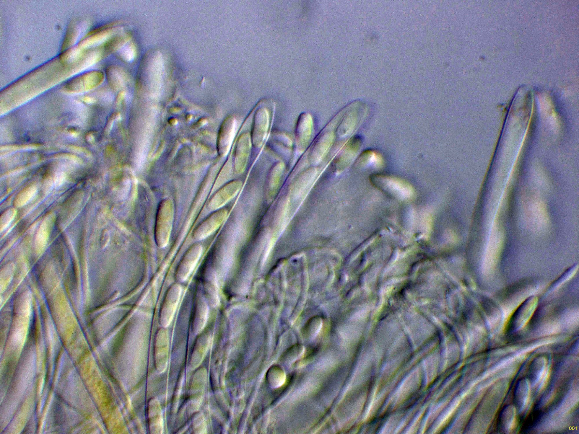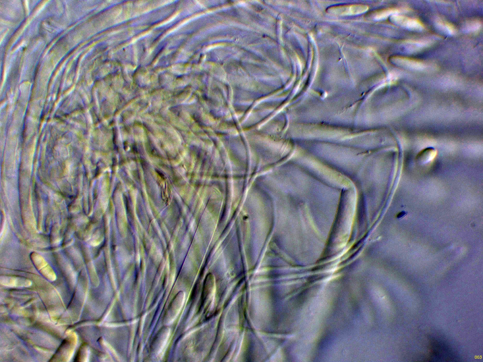 Los queilocistidios con unas medidas de (17.7) 19.3 - 22.2 (24.6), con un diámetro de su cabeza de (3.7) 4 - 4.4 (5) µm.