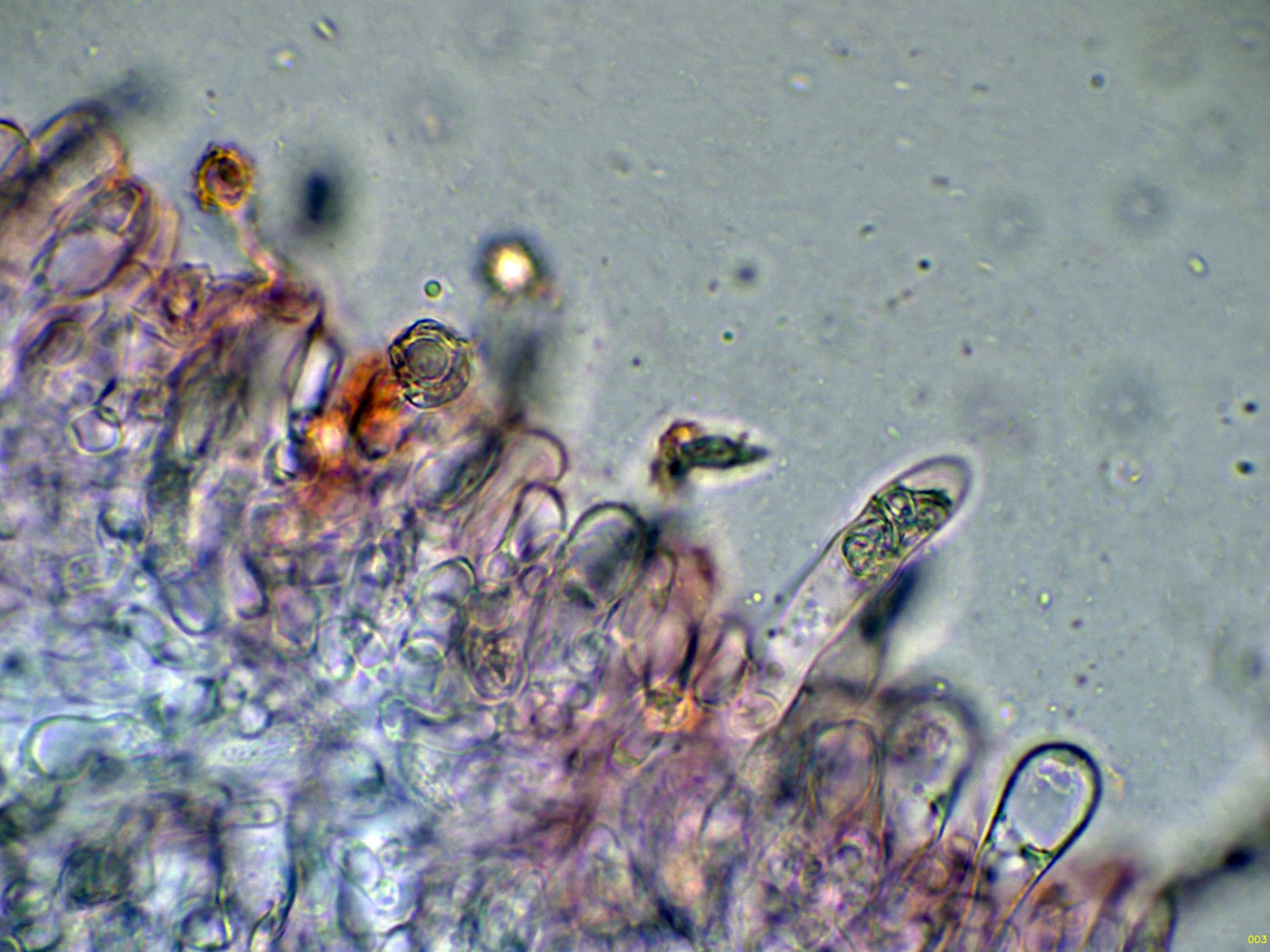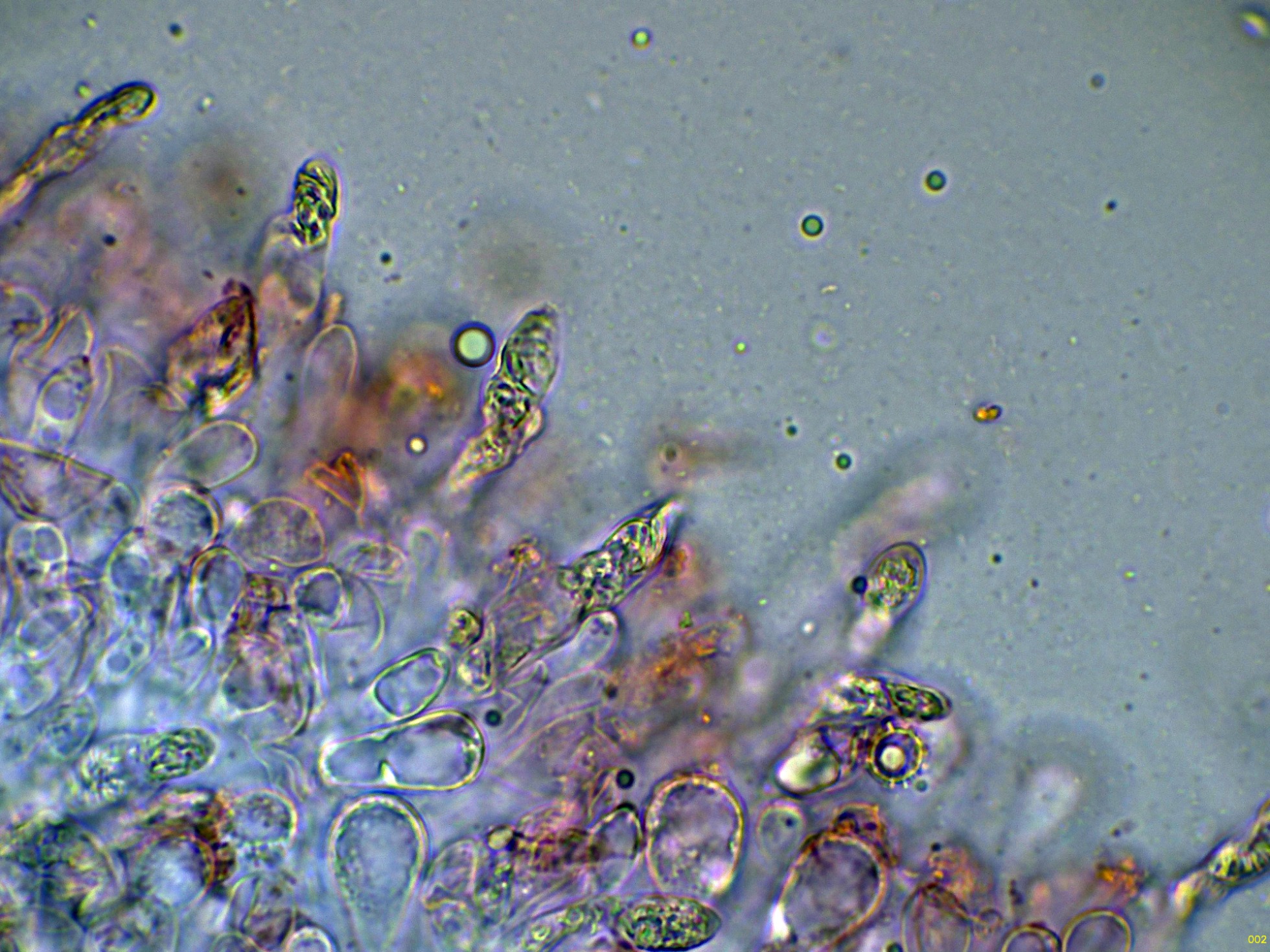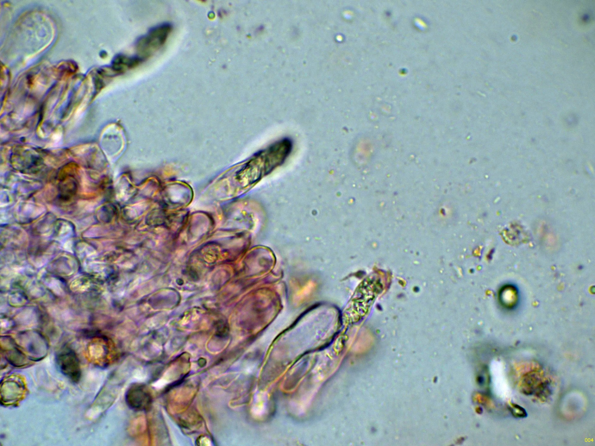 En la base de estos cistidios podemos observar los basidios: