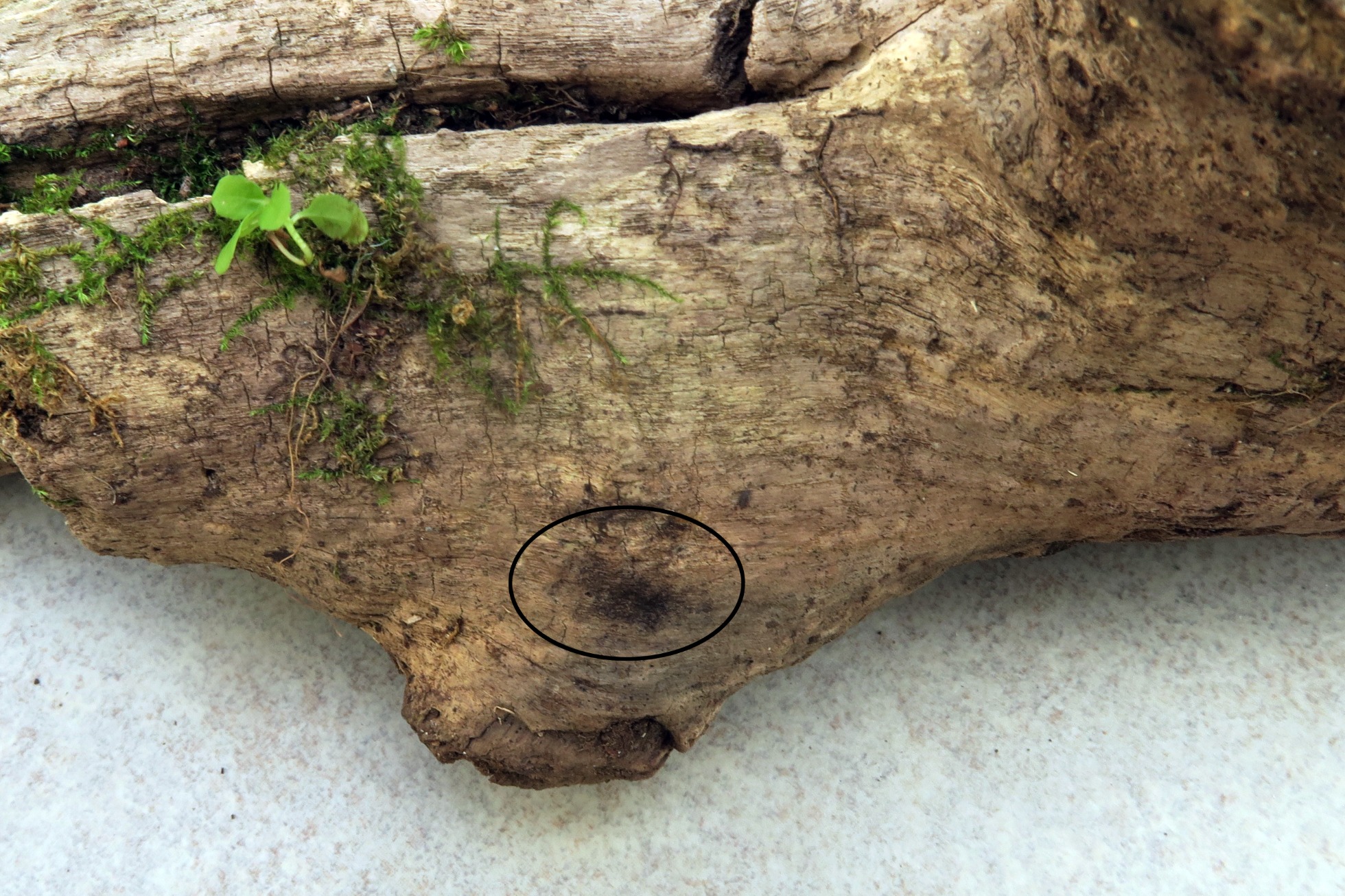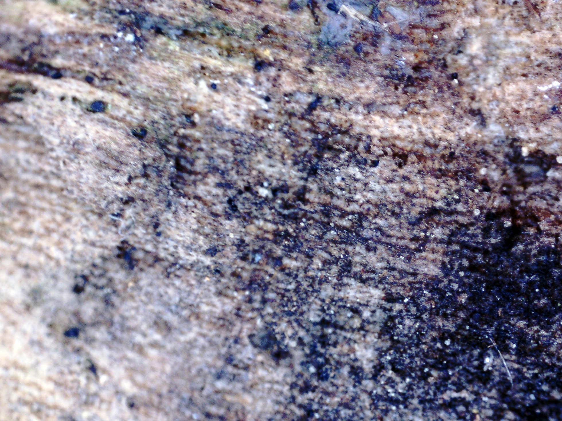Unos muy diminutos apotecios, brotando de manera dispersa, localizados sobre la superficie de un tronco semisumergido en agua limpia de Fraxinus sp.