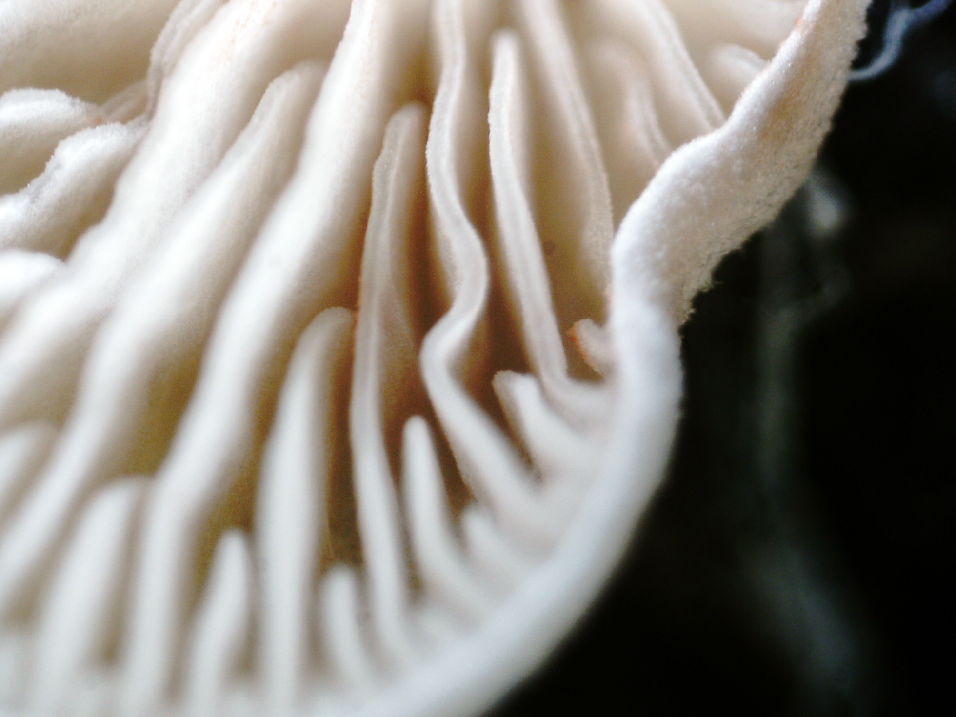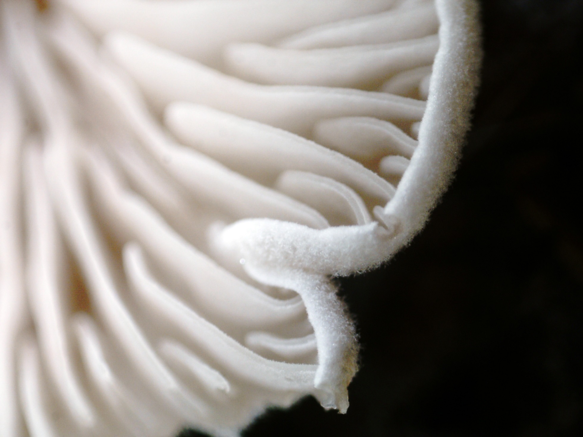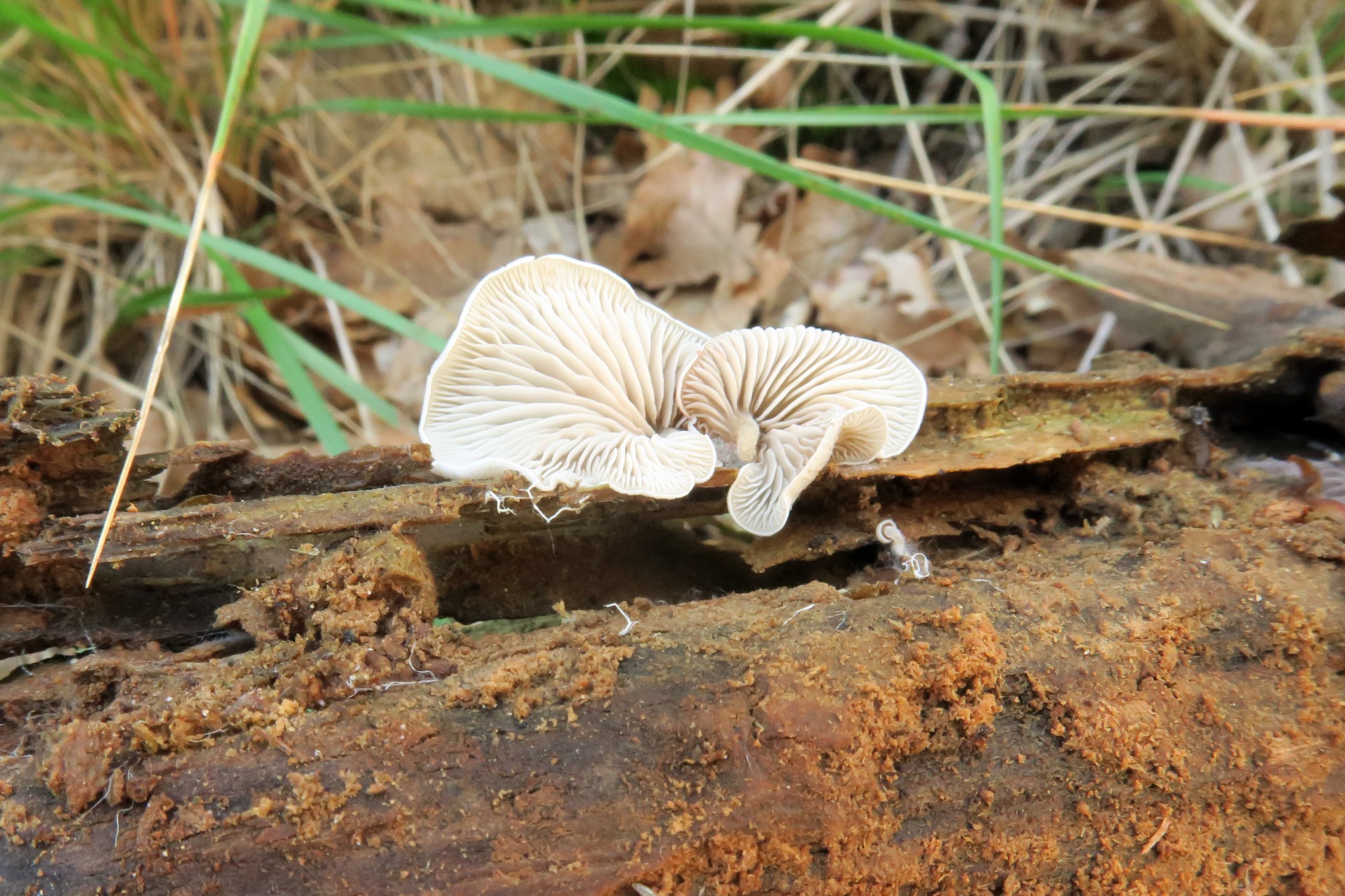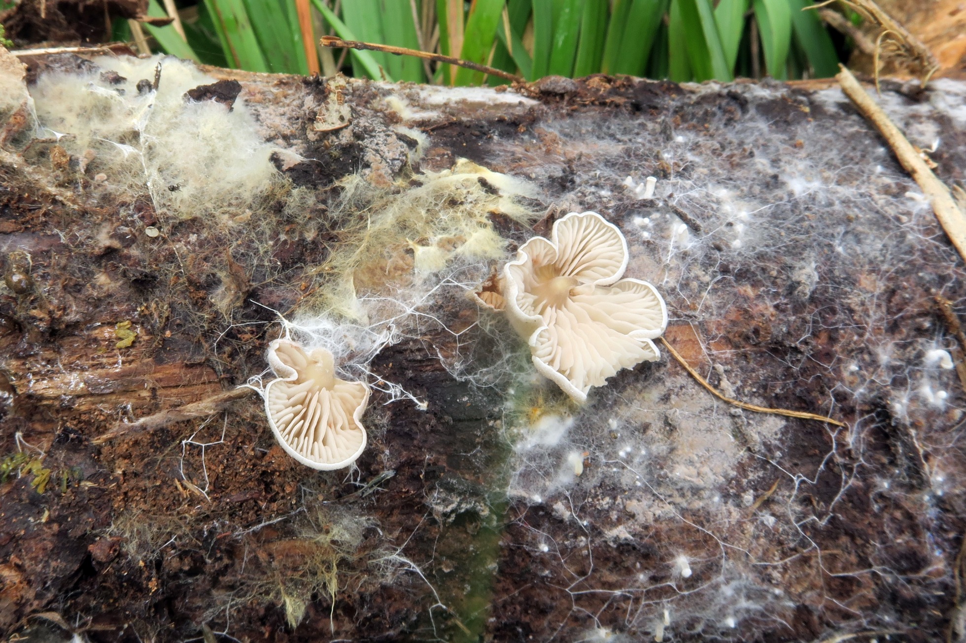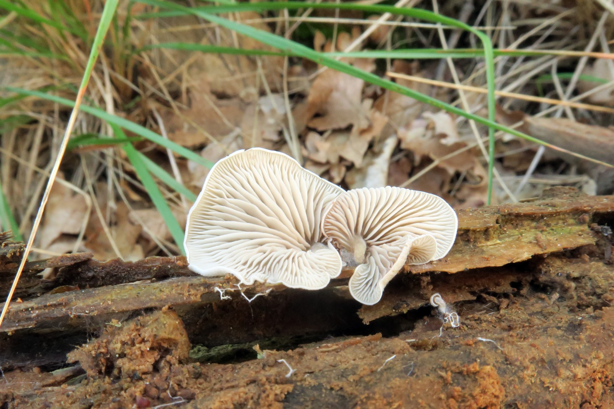 Un Entoloma con aspecto de Crepidotus, localizado el domingo 5 de octubre, bajo robles y brotando sobre la superficie de un tronco tumbado del suelo: