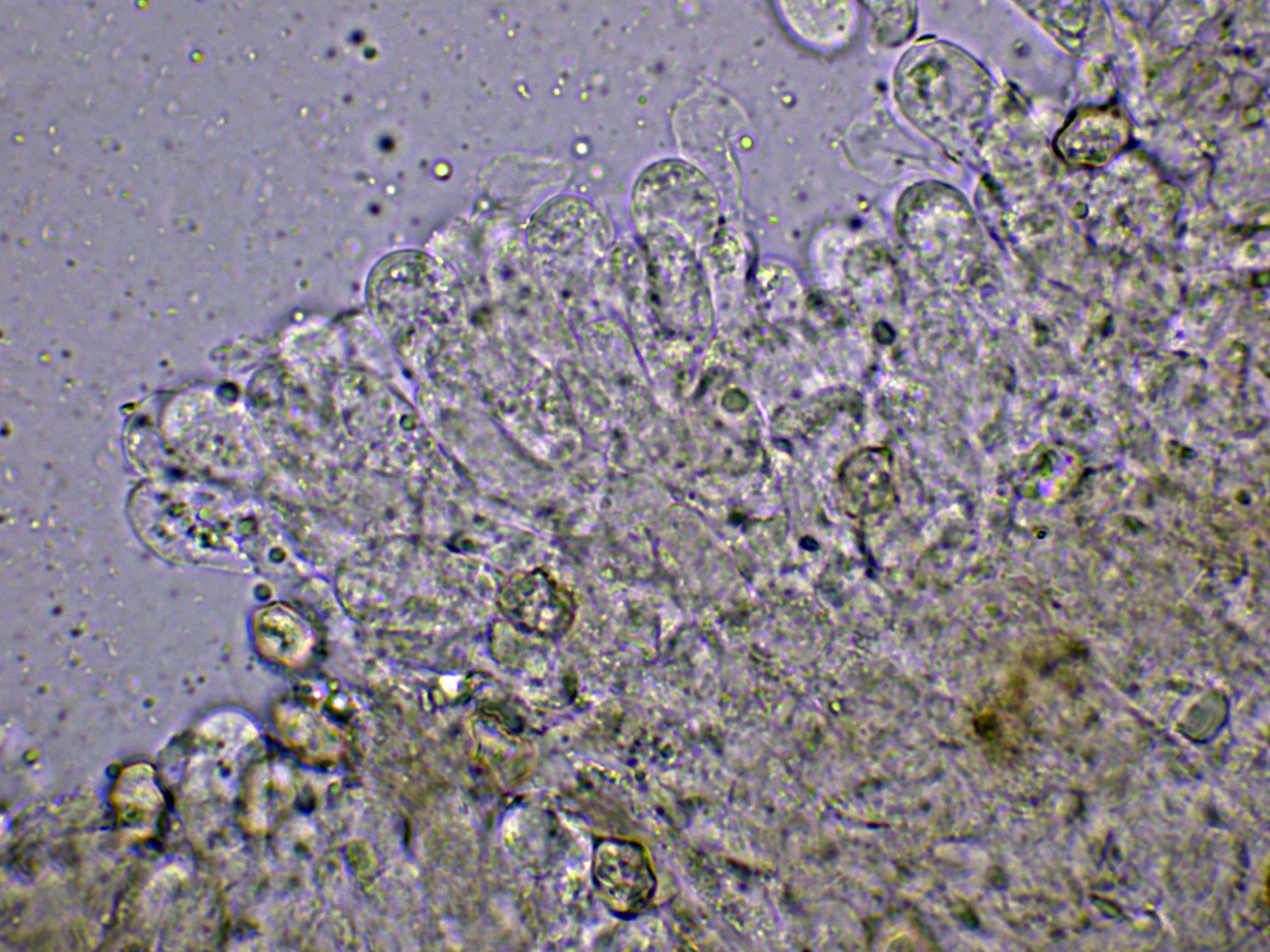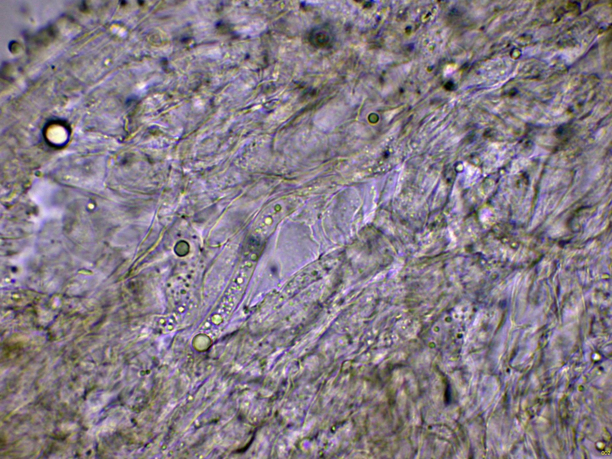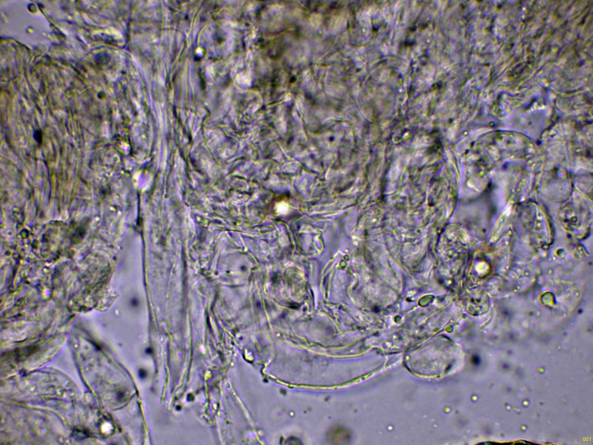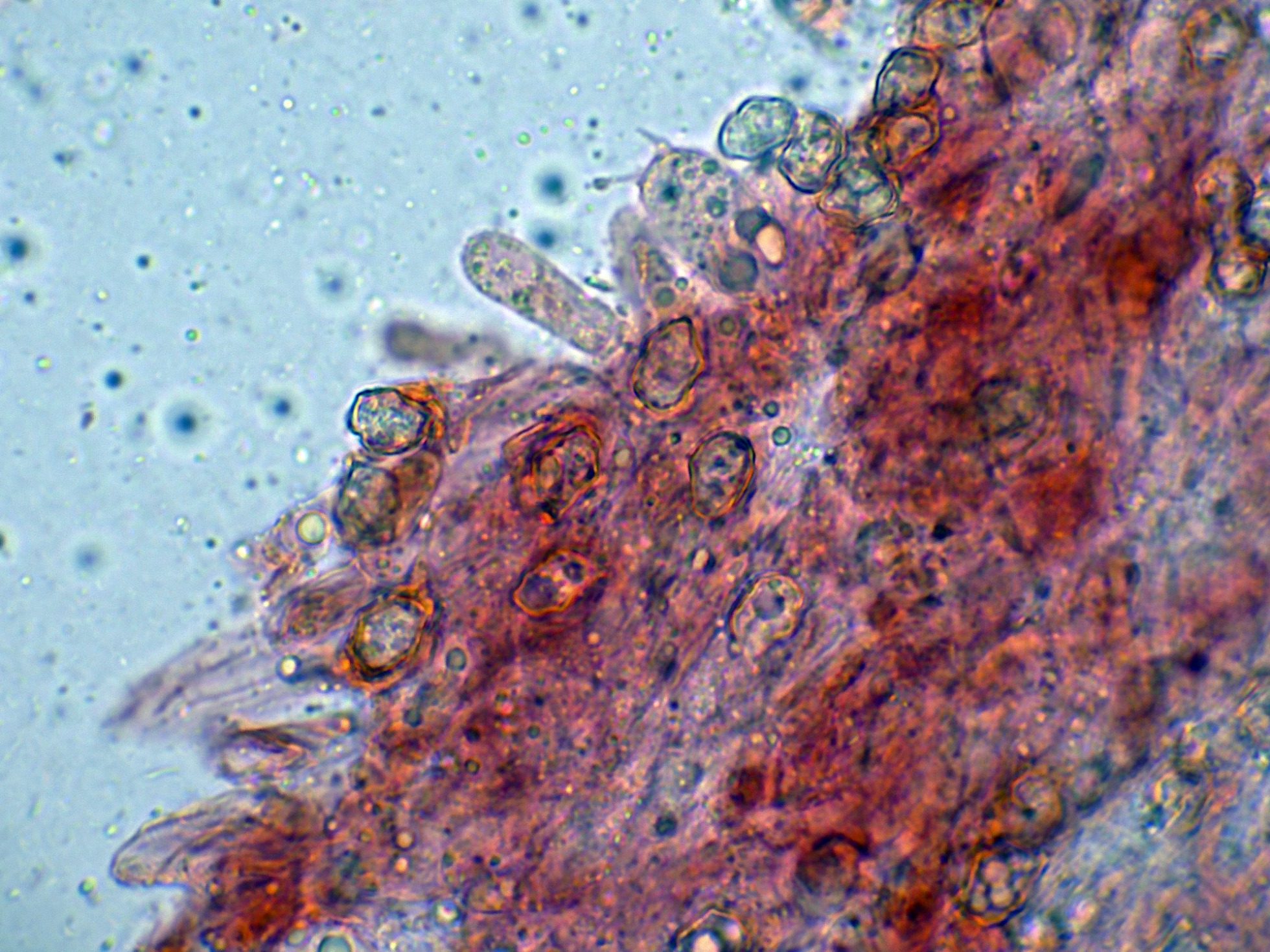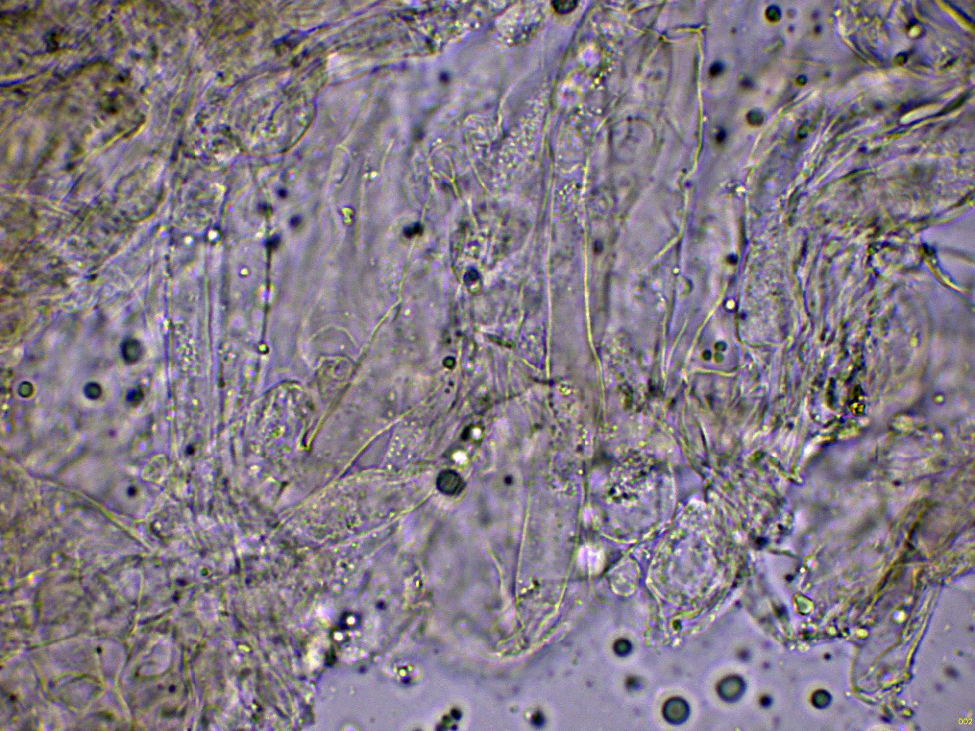 Arista laminar en solución de Rojo Congo, sin elementos diferenciados de los basidios o basidiolos: