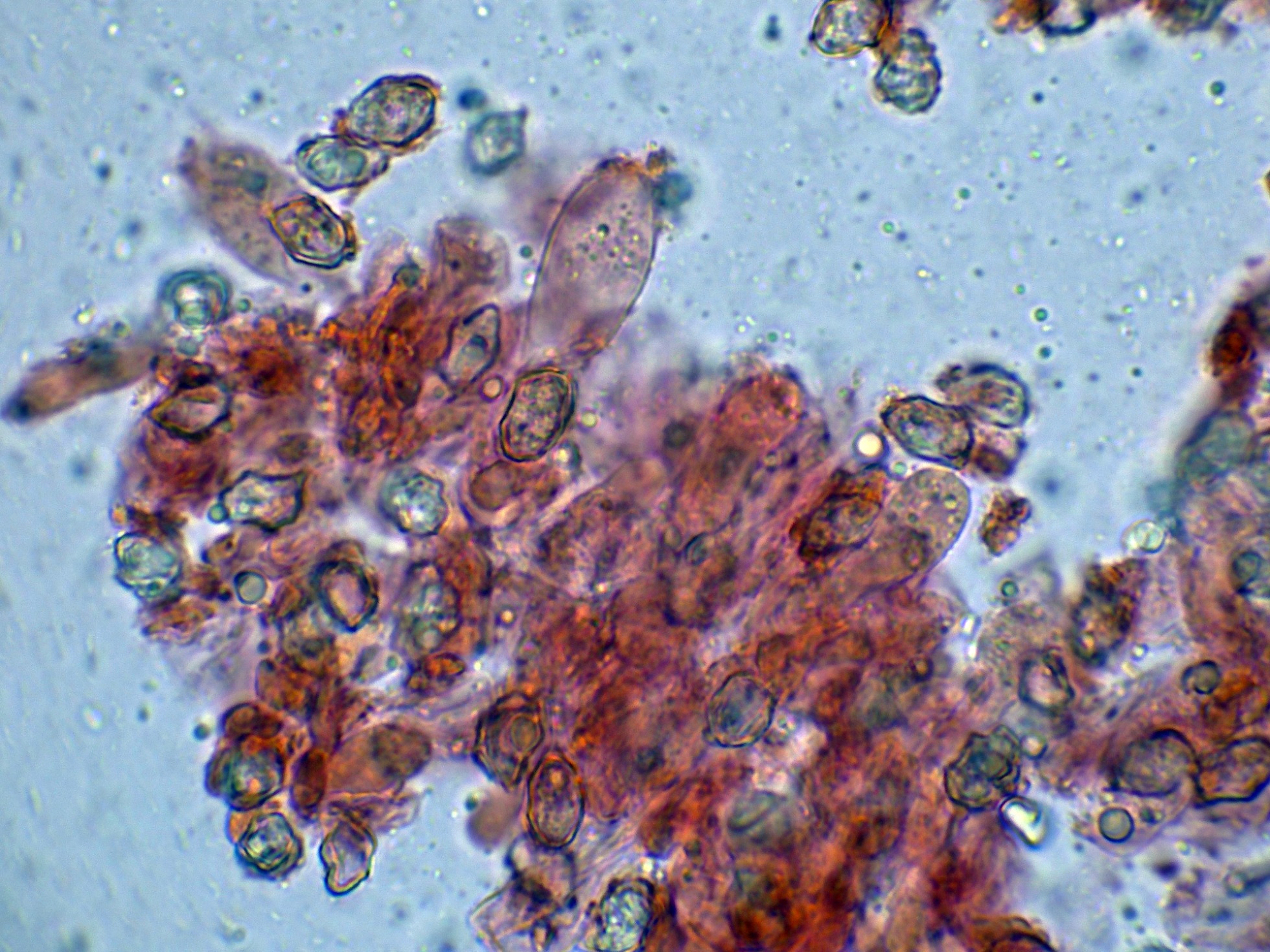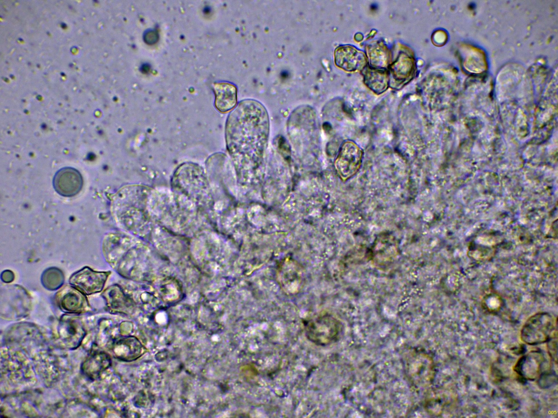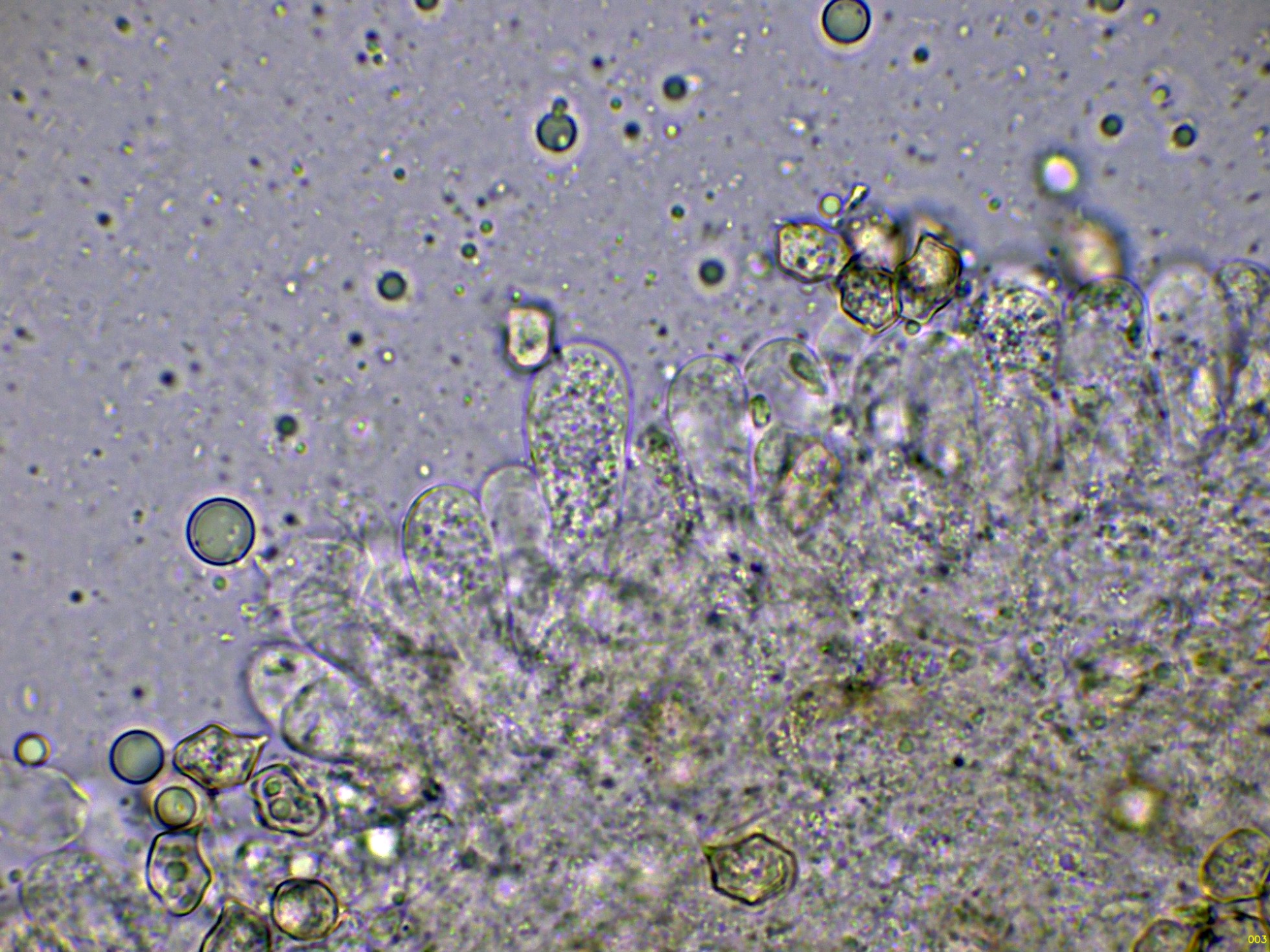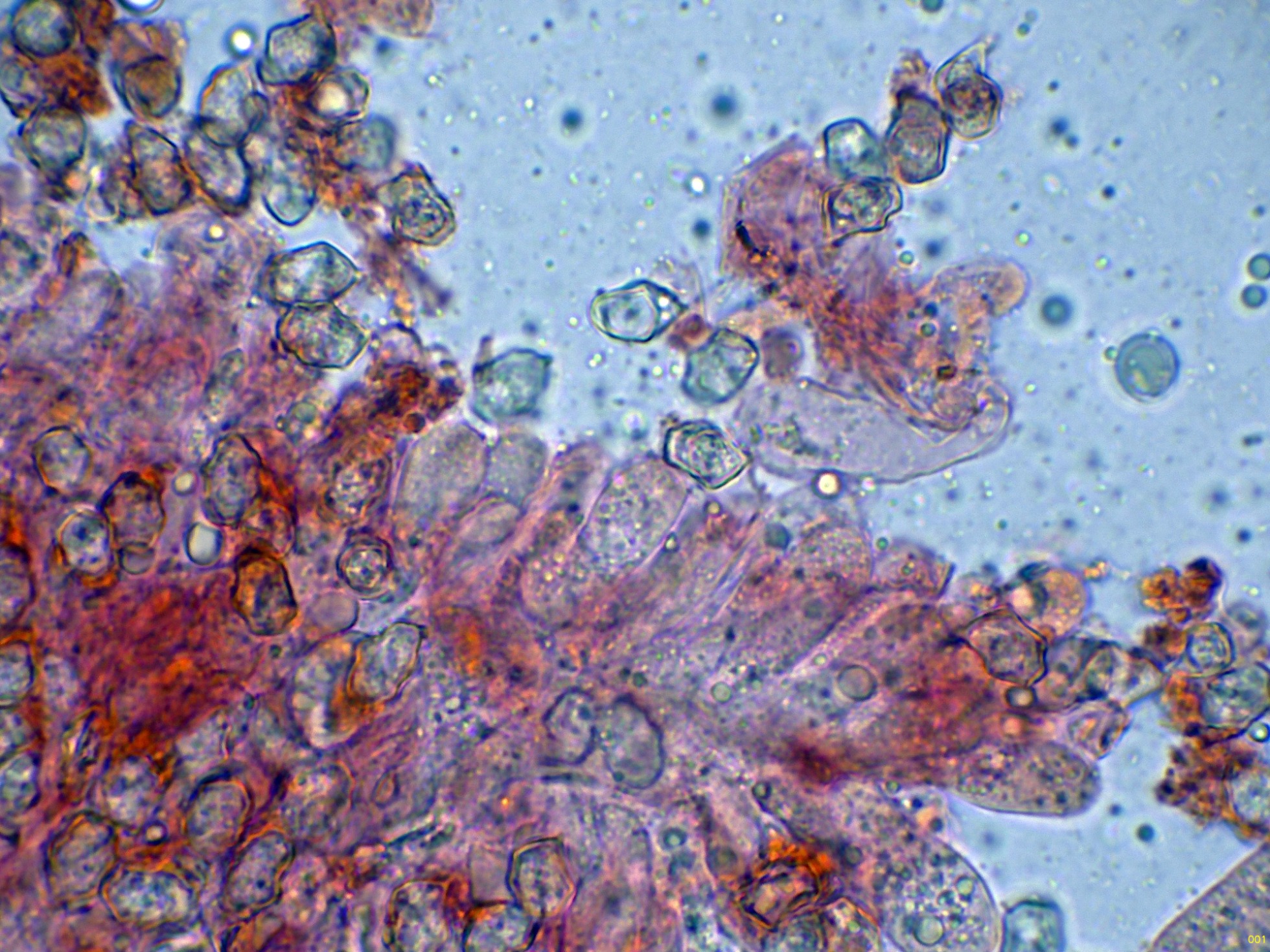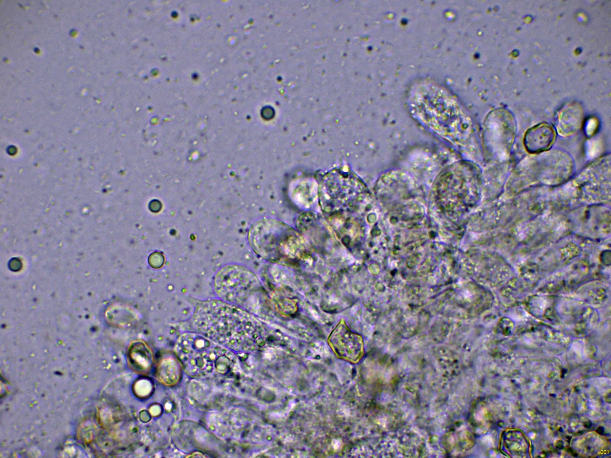 Arista laminar en solución de Rojo Congo, sin elementos diferenciados de los basidios o basidiolos: