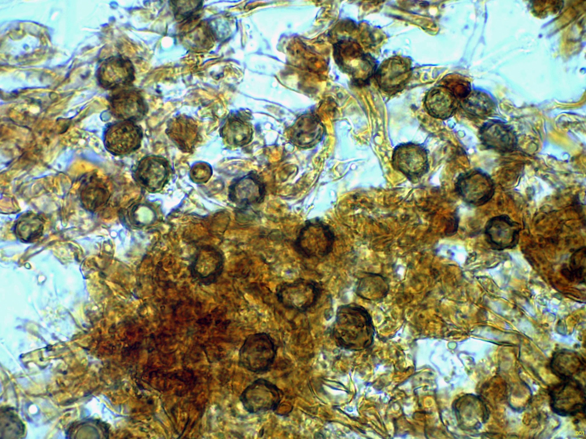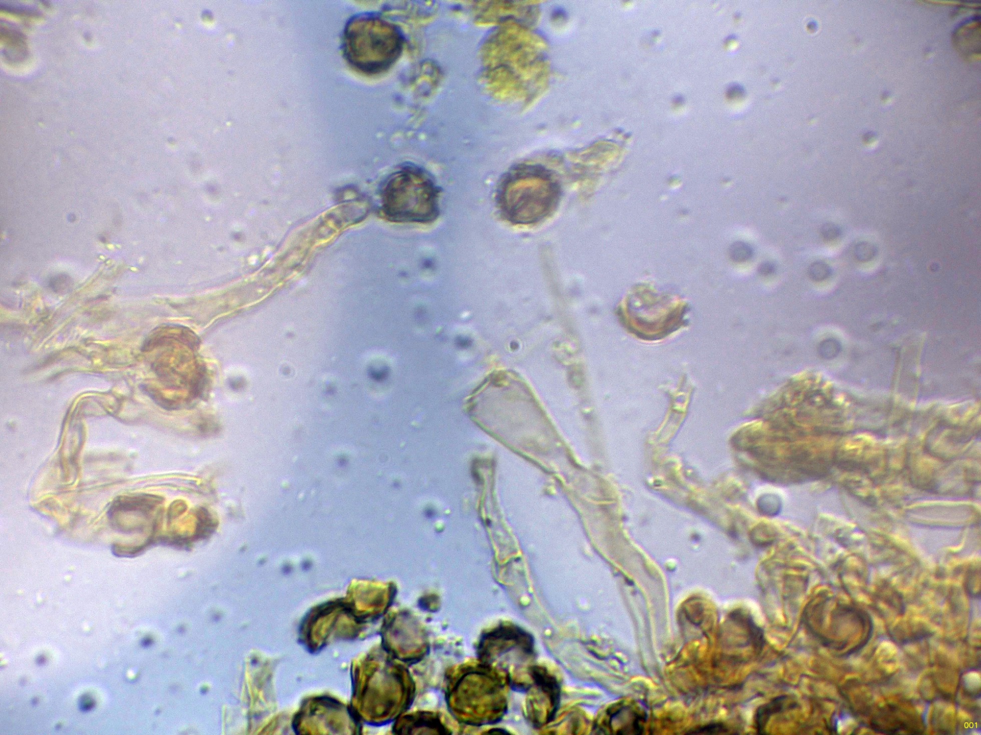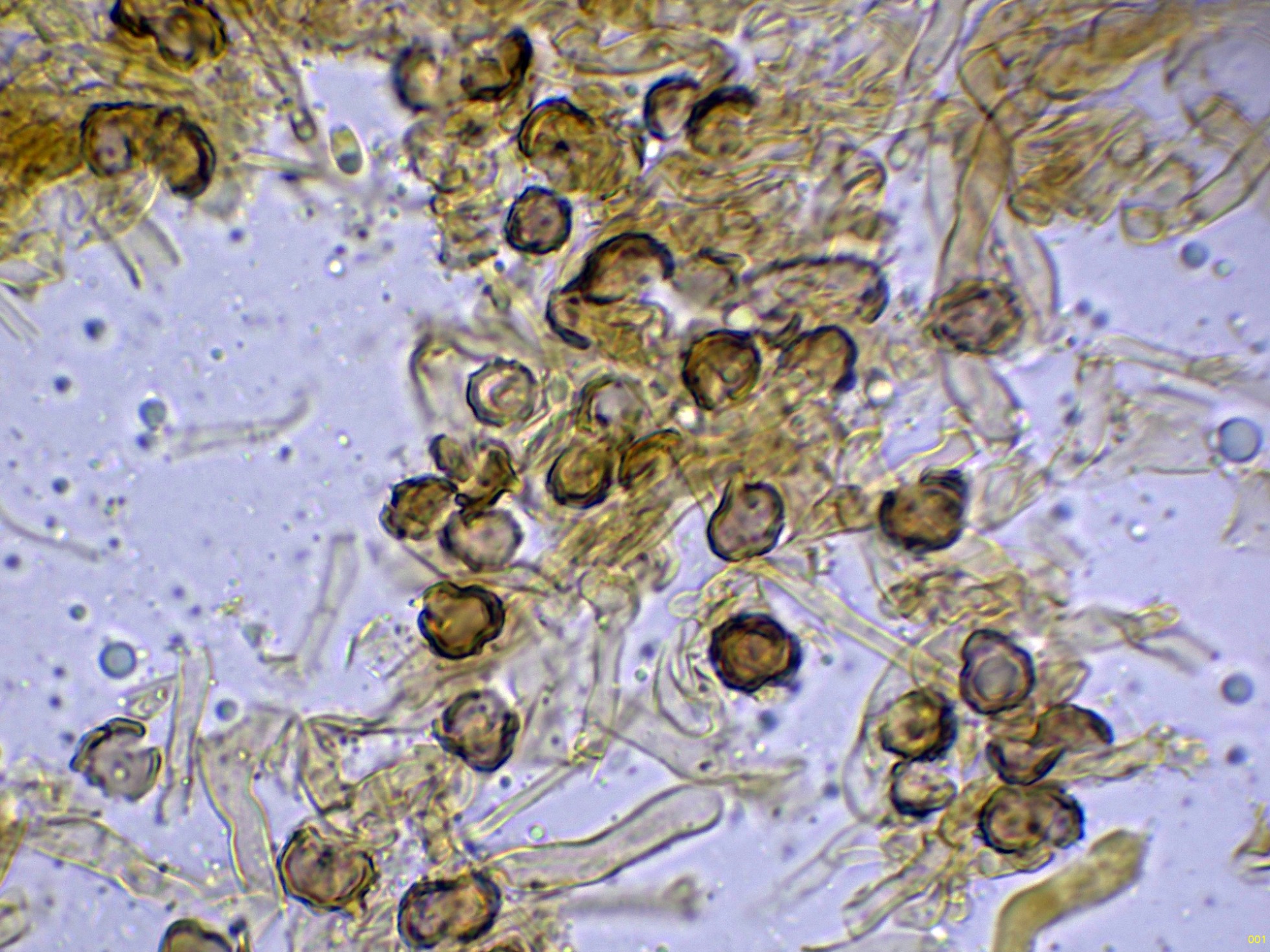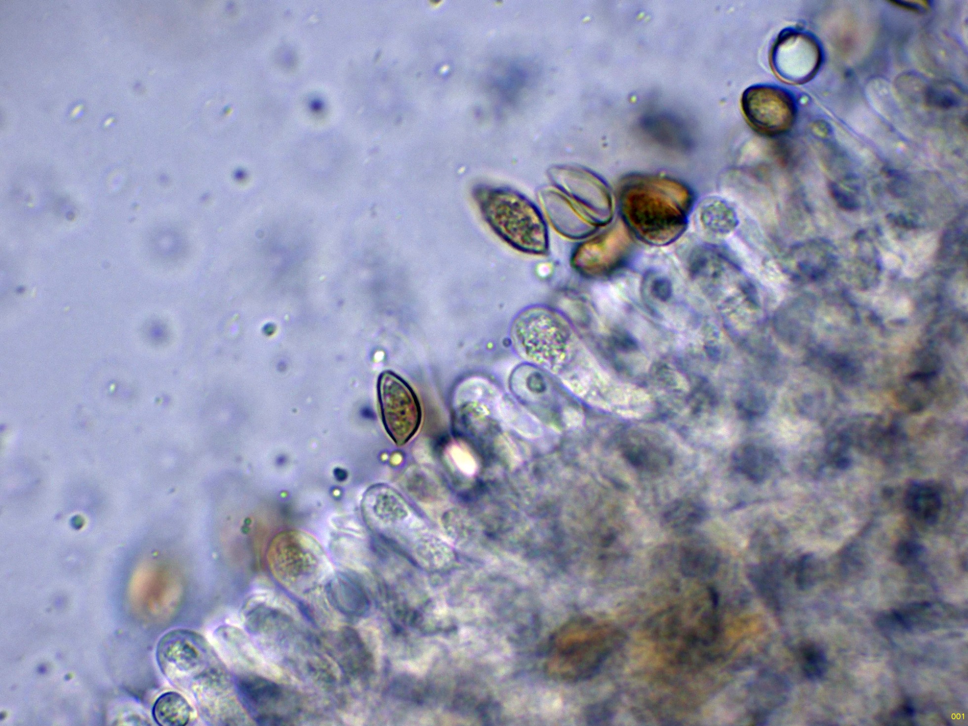 Las esporas en Reactivo de Melzer, con la apícula inamiloide: