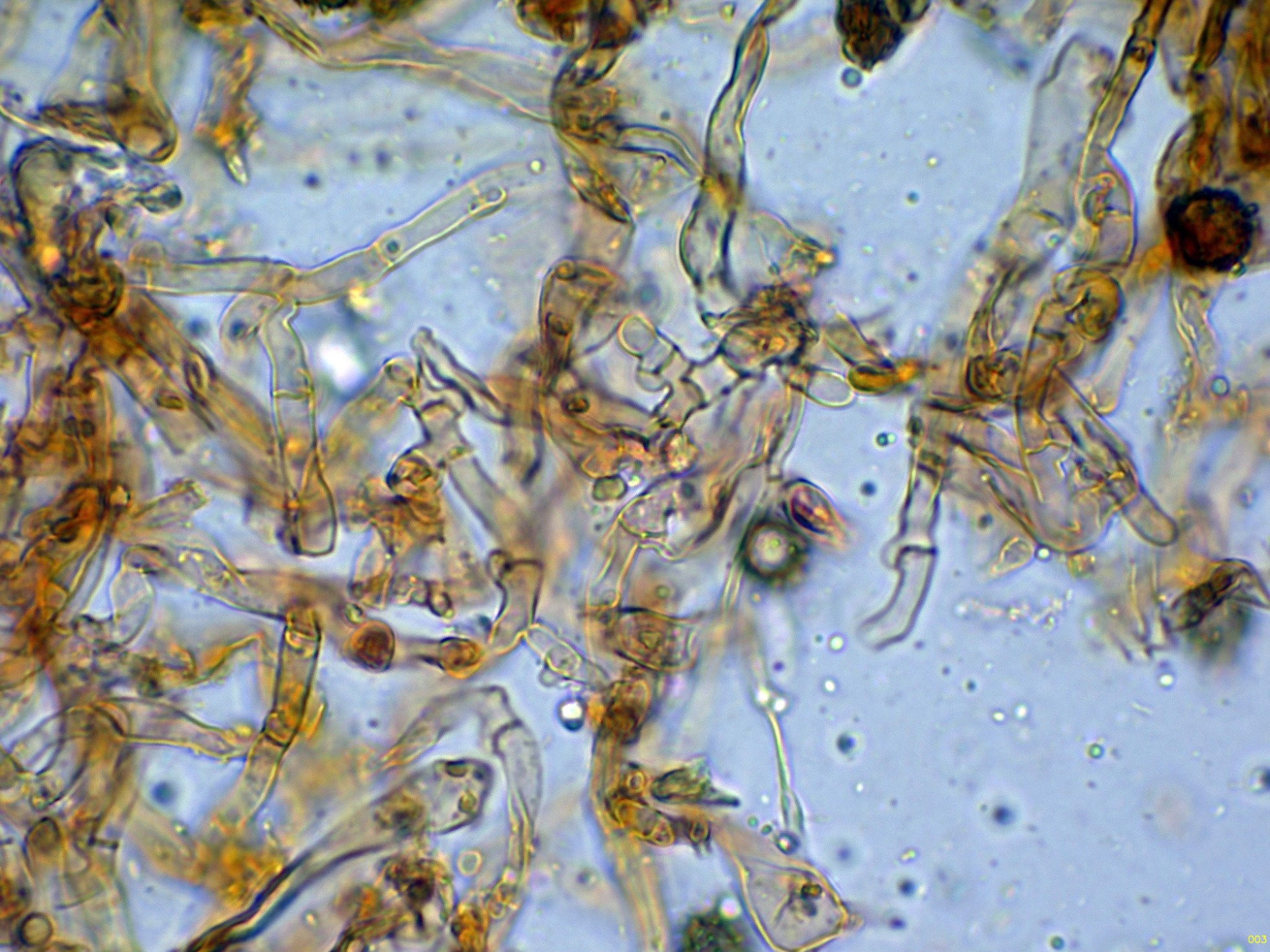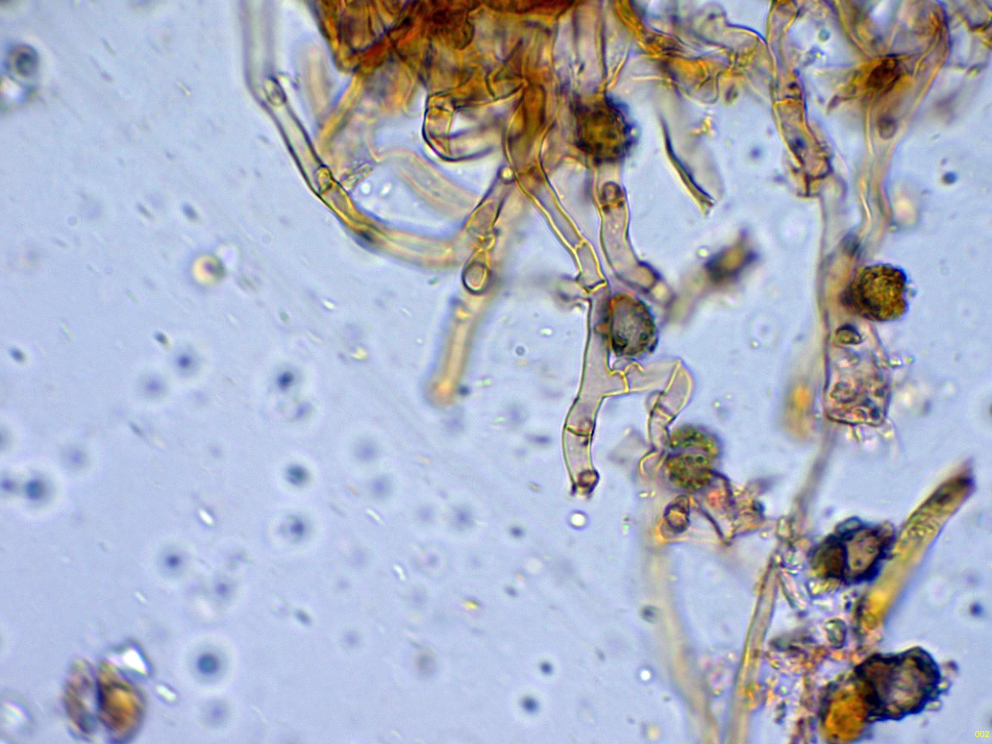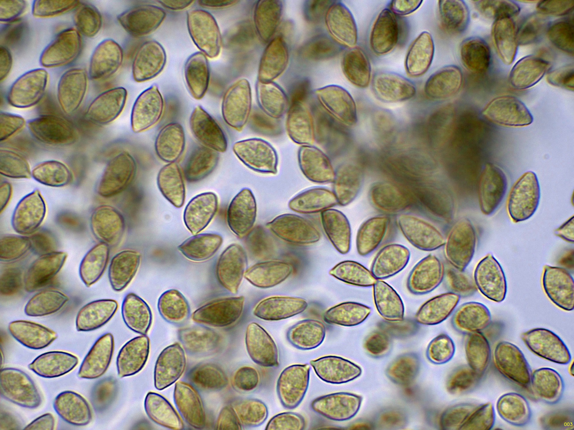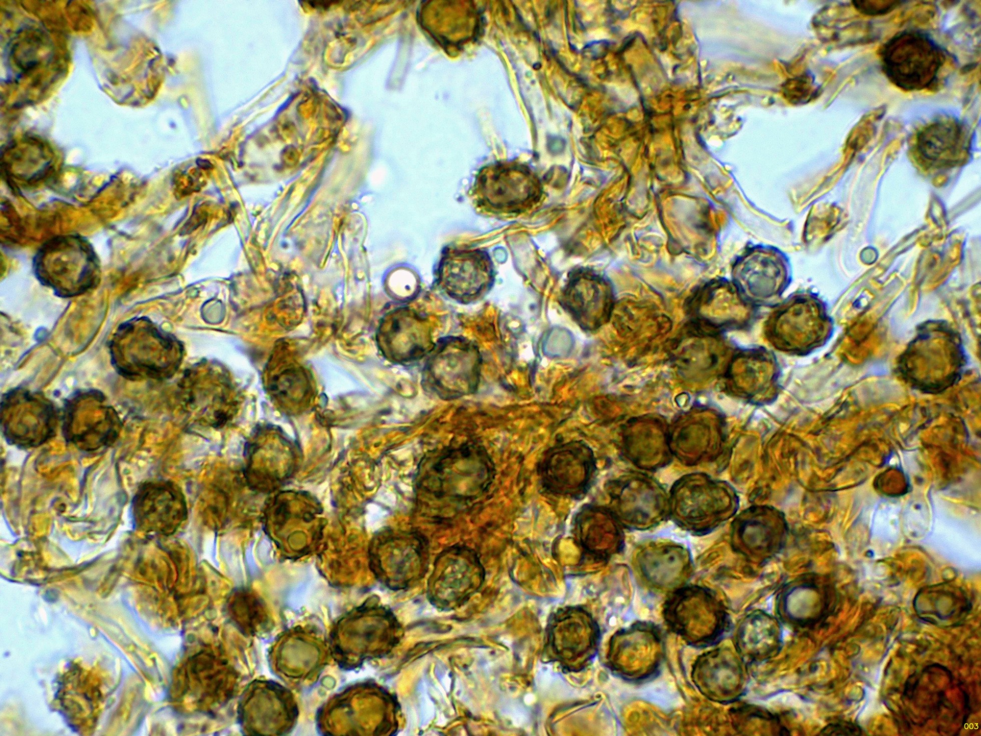 Las esporas en Reactivo de Melzer, con la apícula inamiloide: