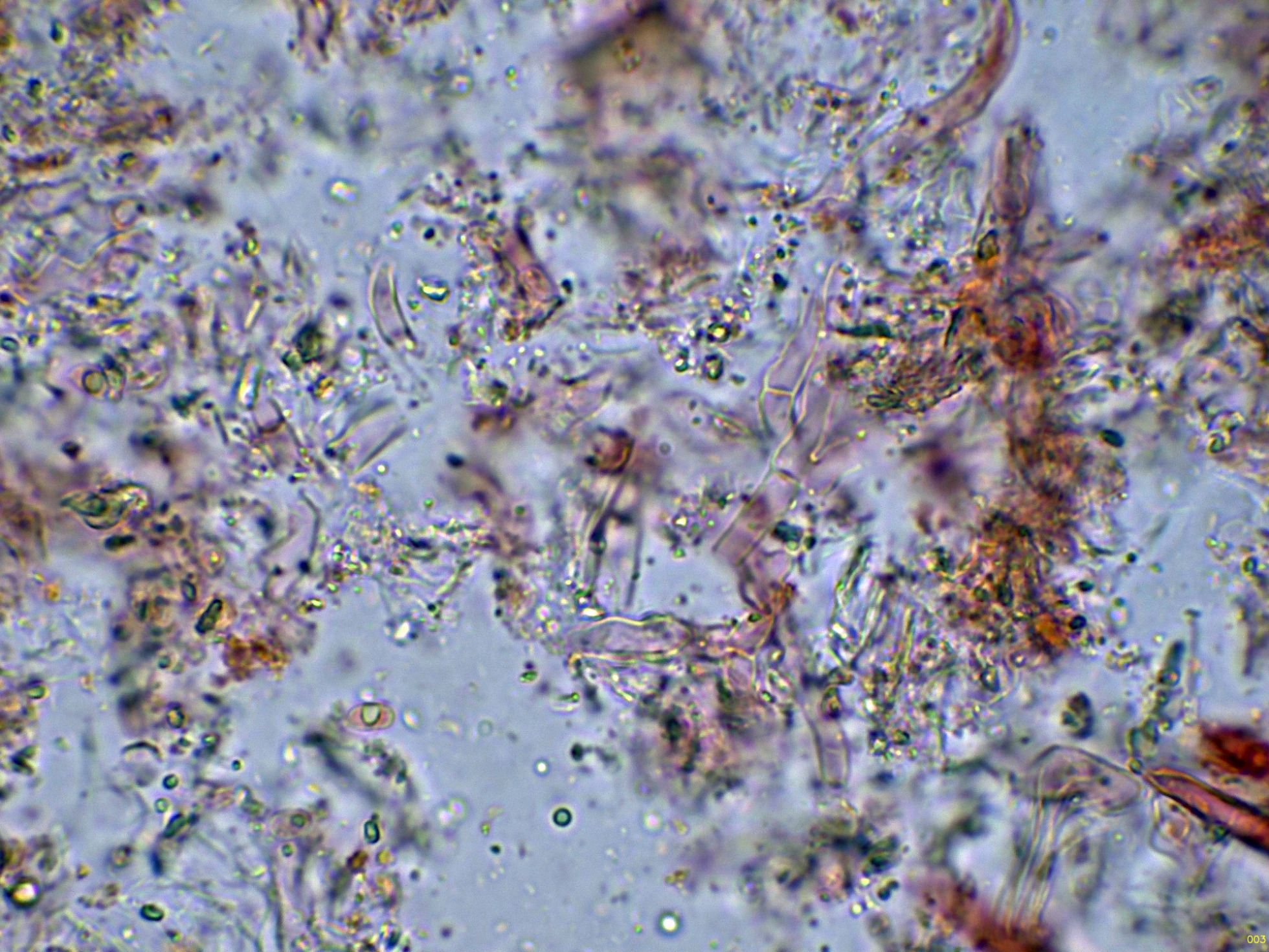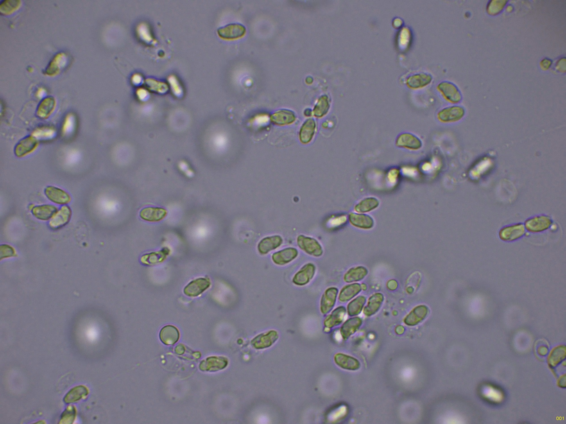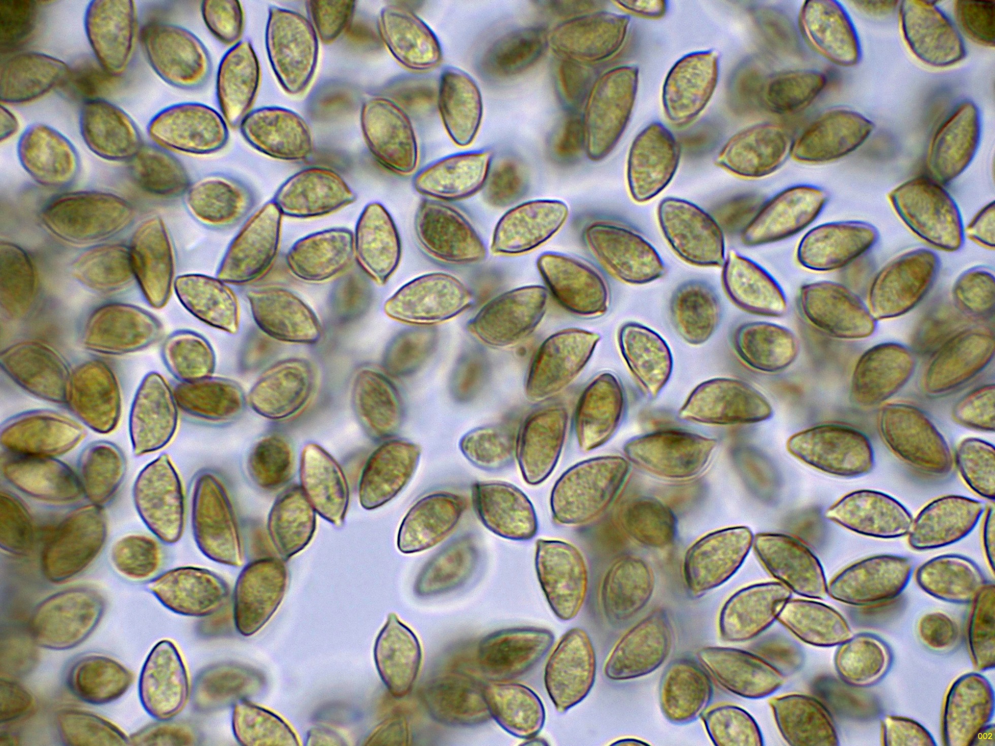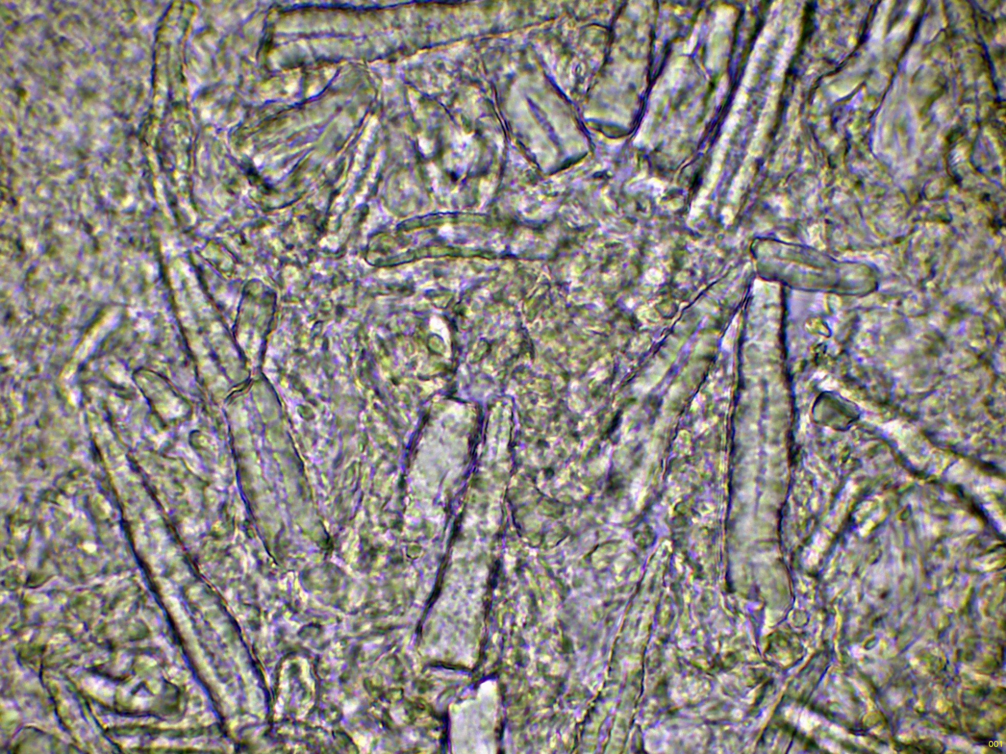 Las esporas en Reactivo de Melzer, con la apícula inamiloide:
