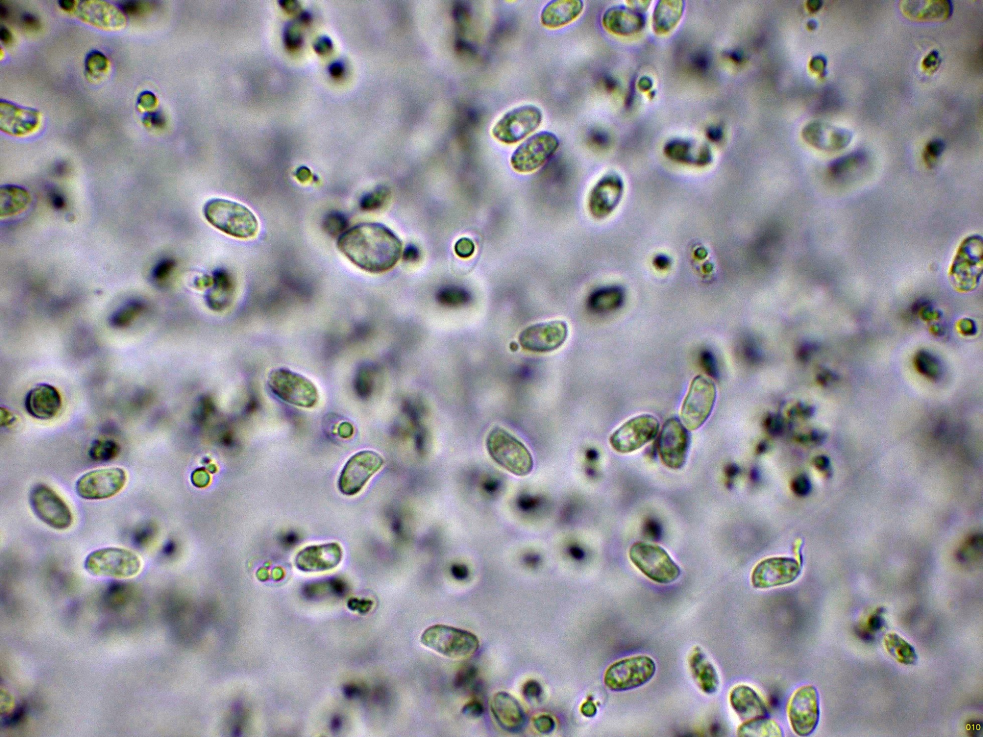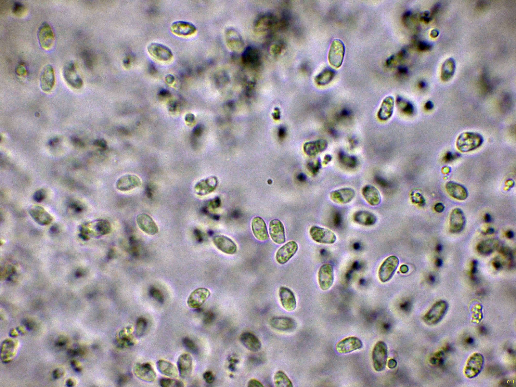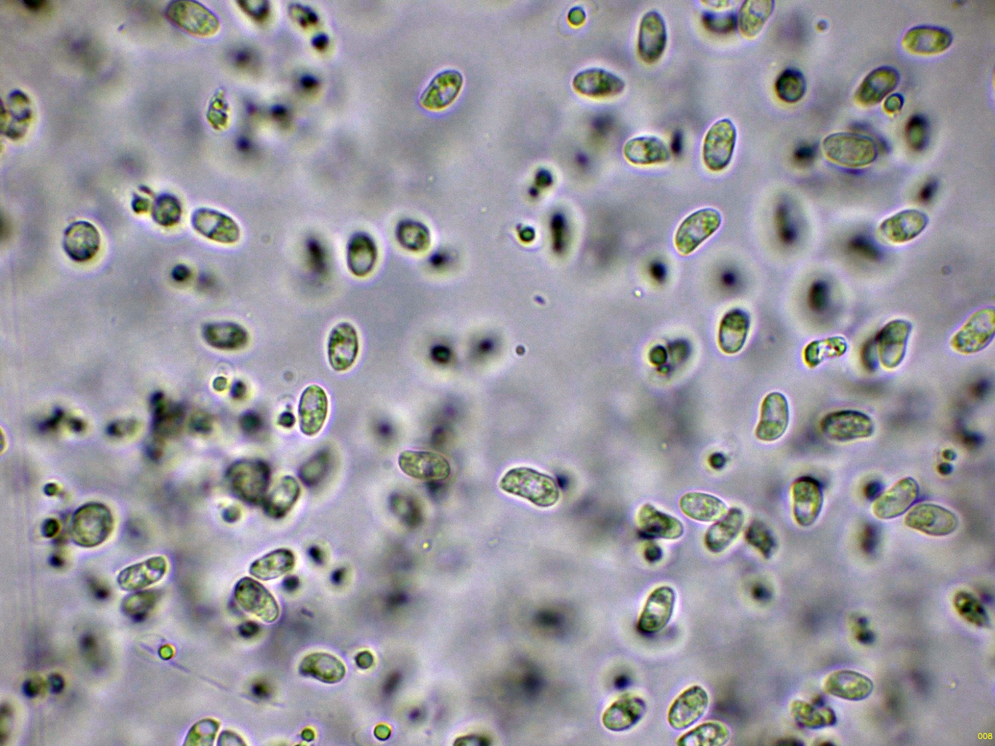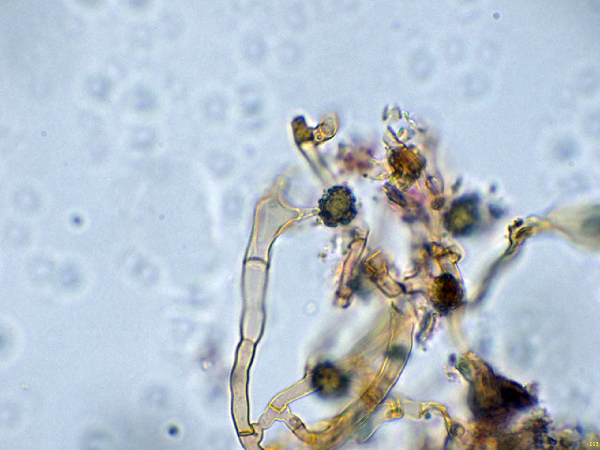 Las esporas en Reactivo de Melzer, con la apícula inamiloide: