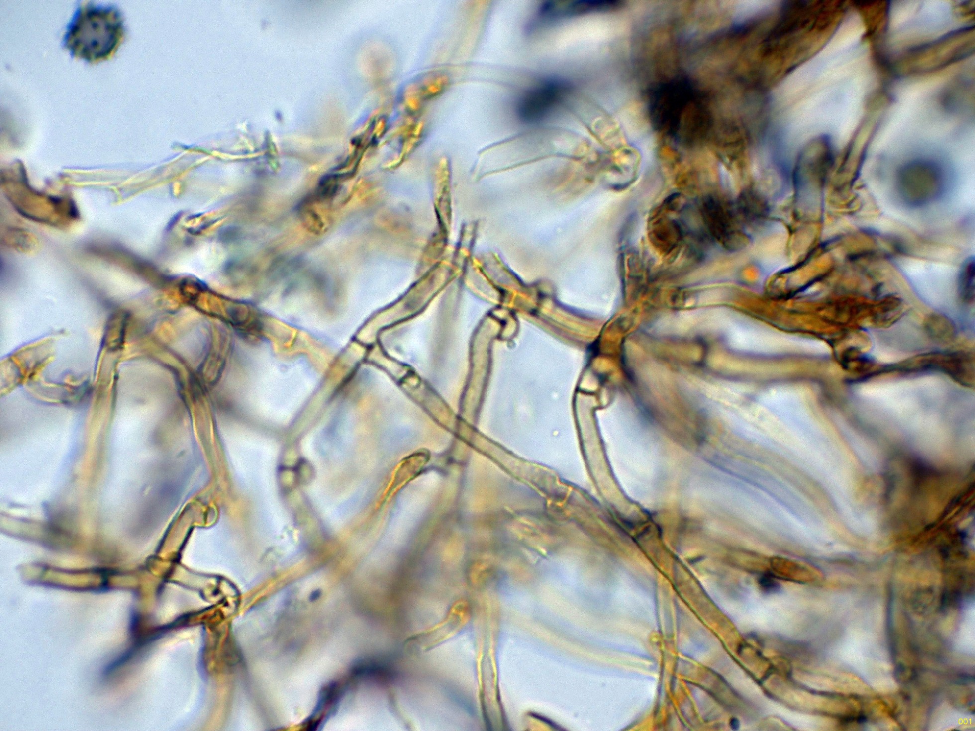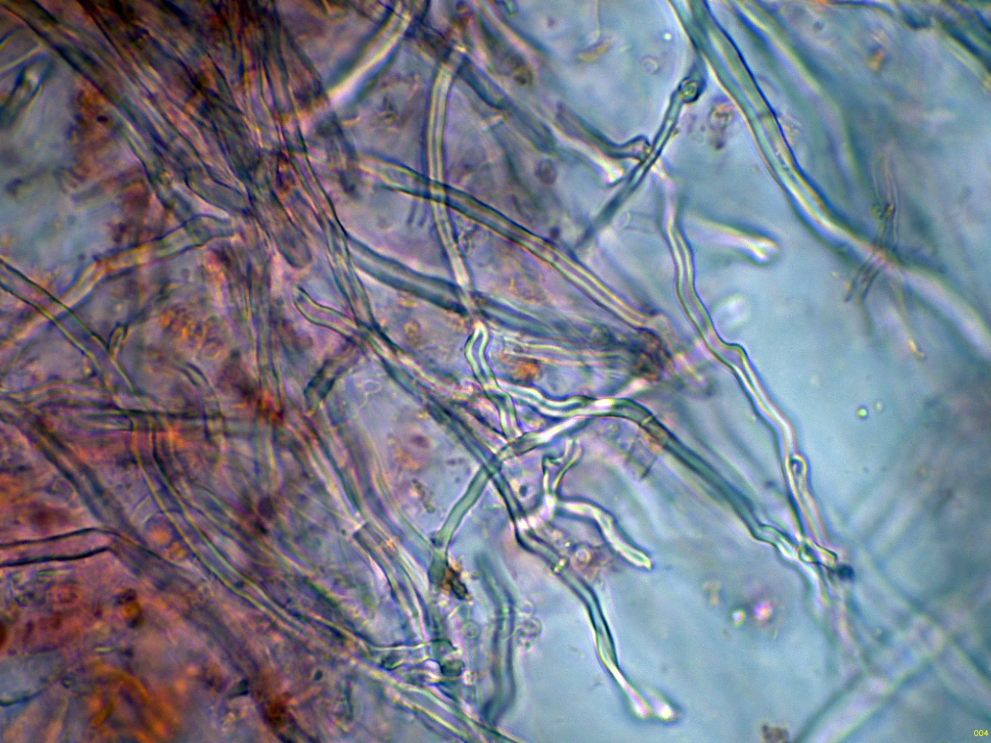Las hifas subhimeniales en solución de Rojo Congo, fibuladas:
