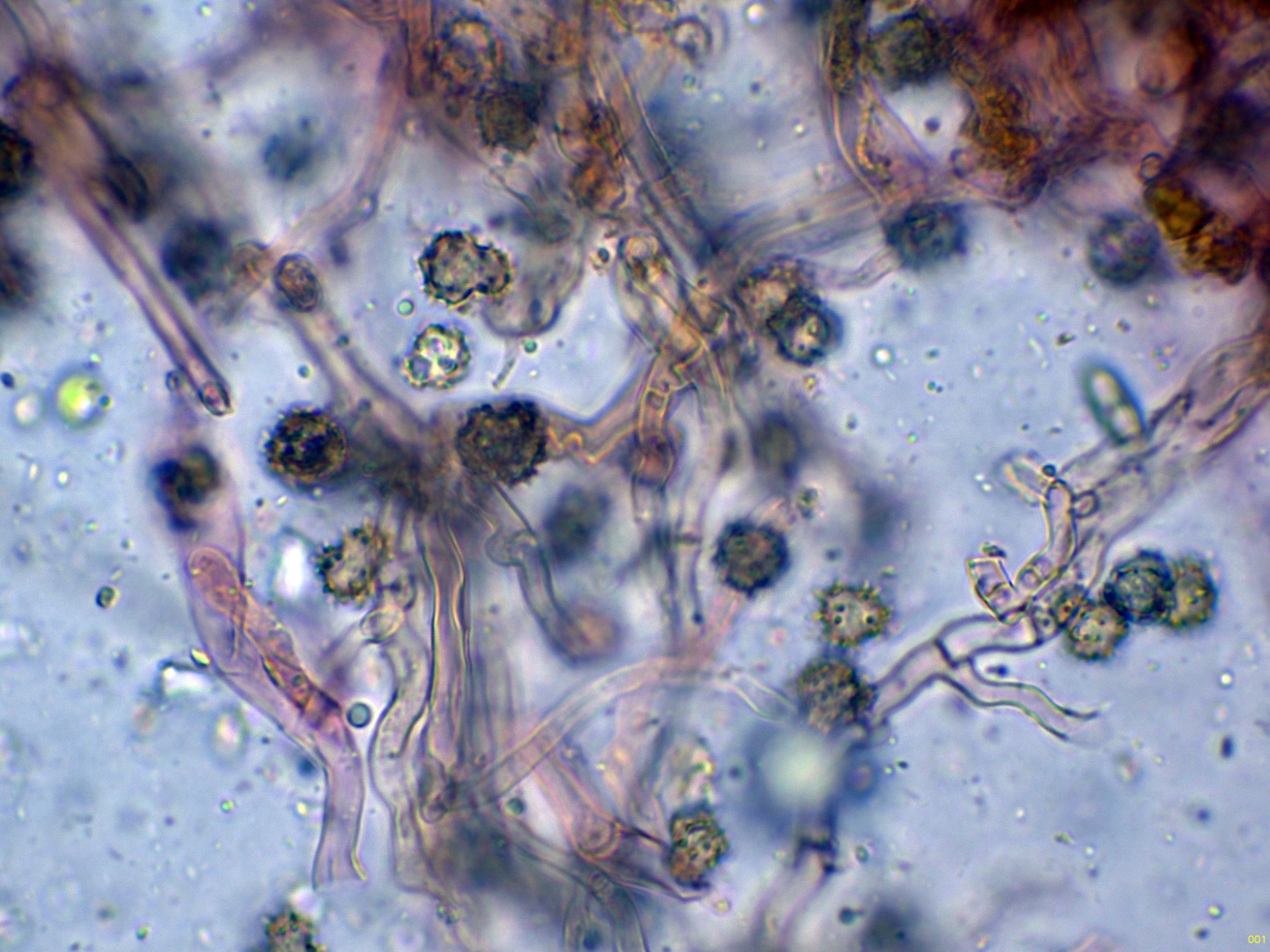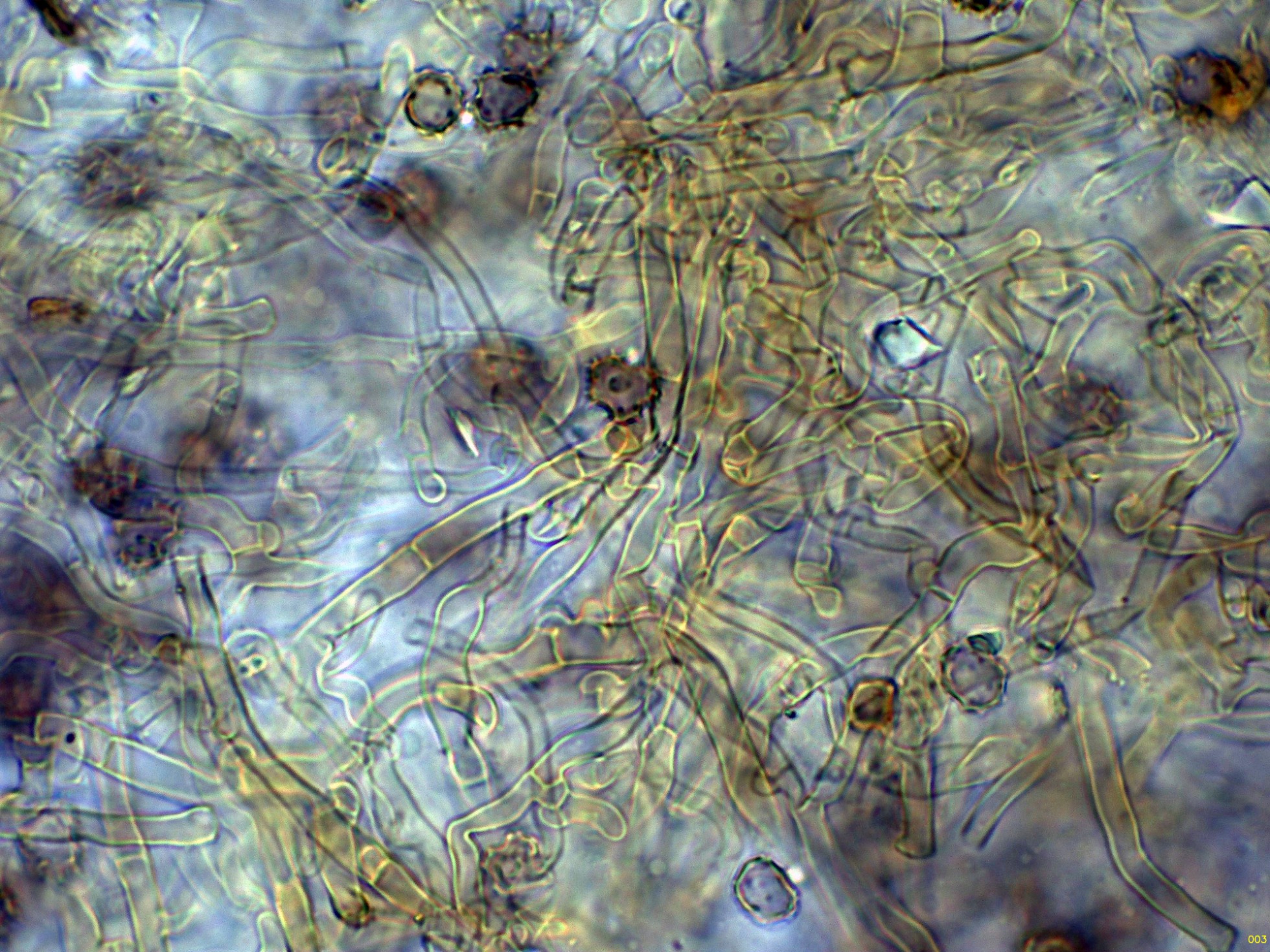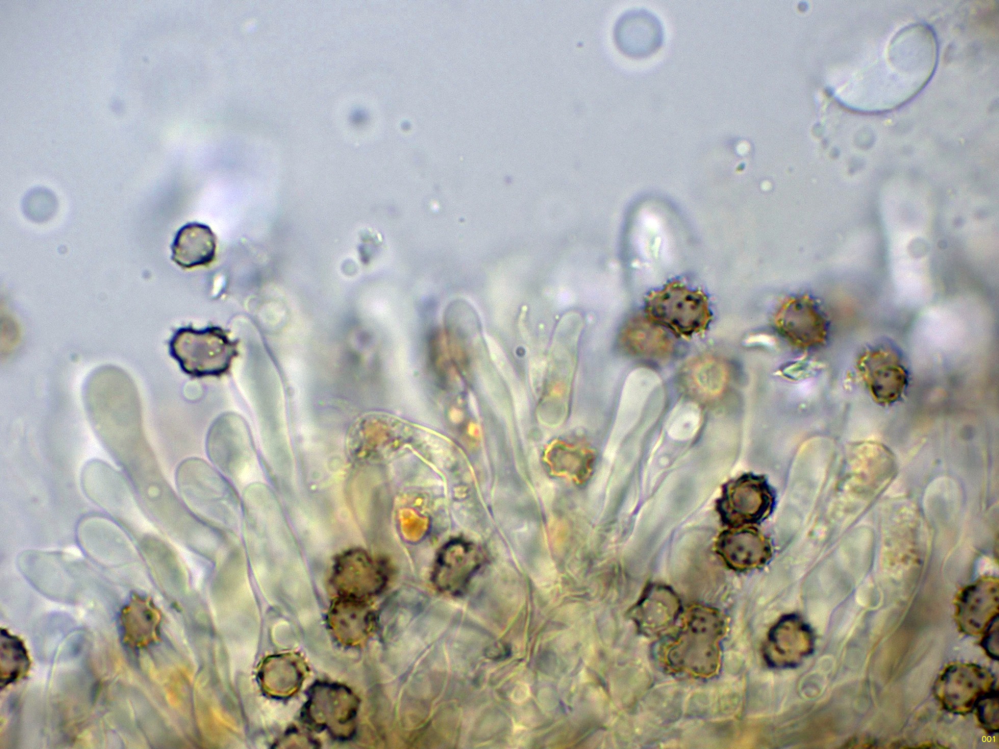 - Tomentella testaceogilva Bourdot & Galzin. Microscopía.