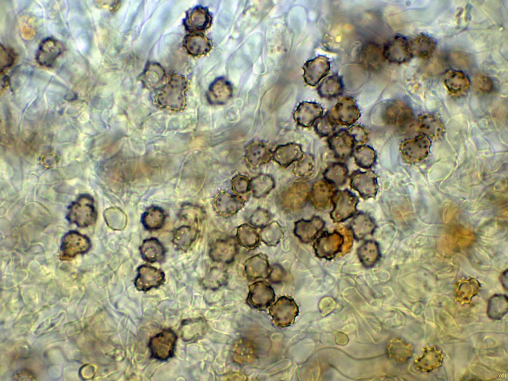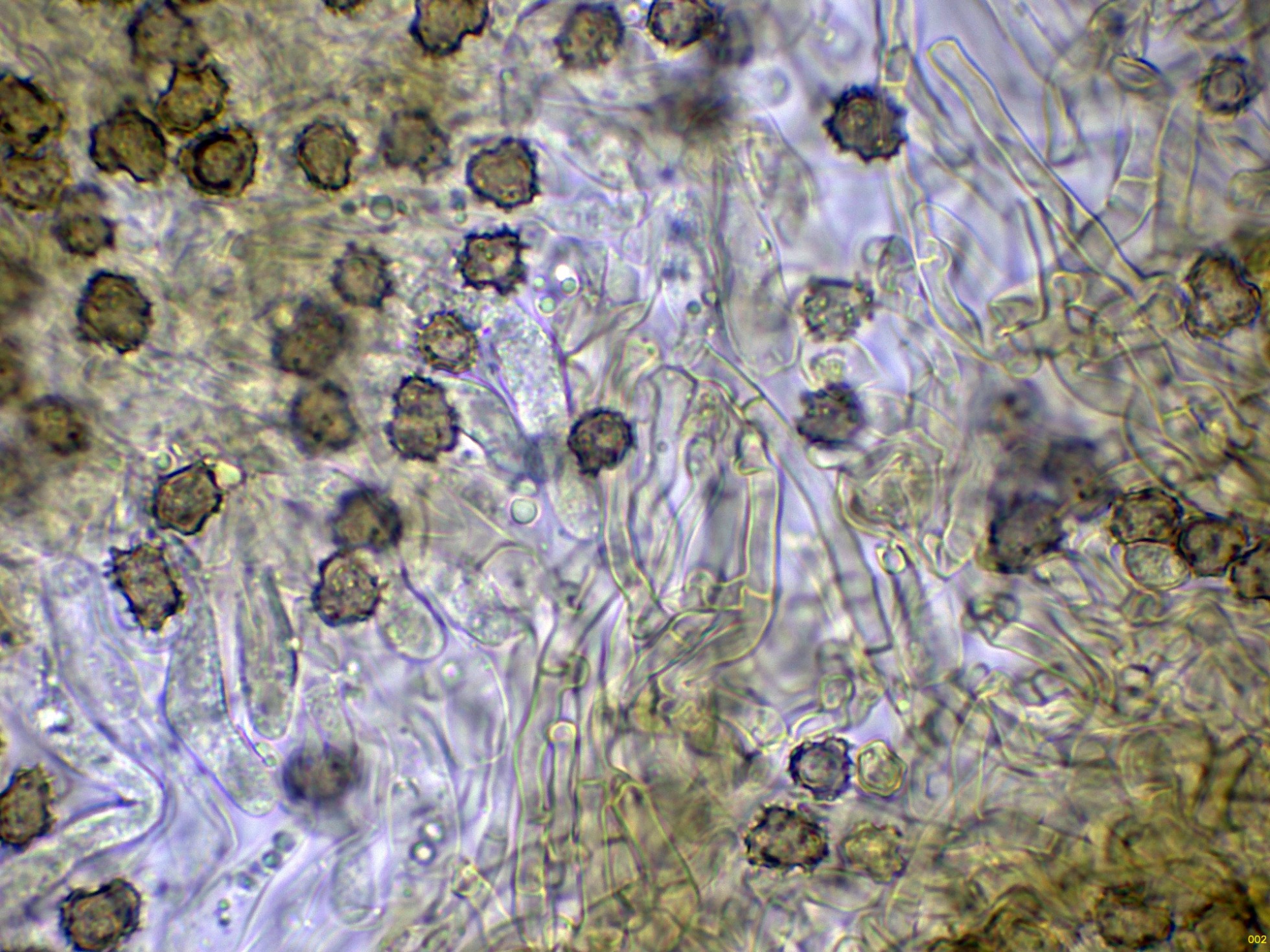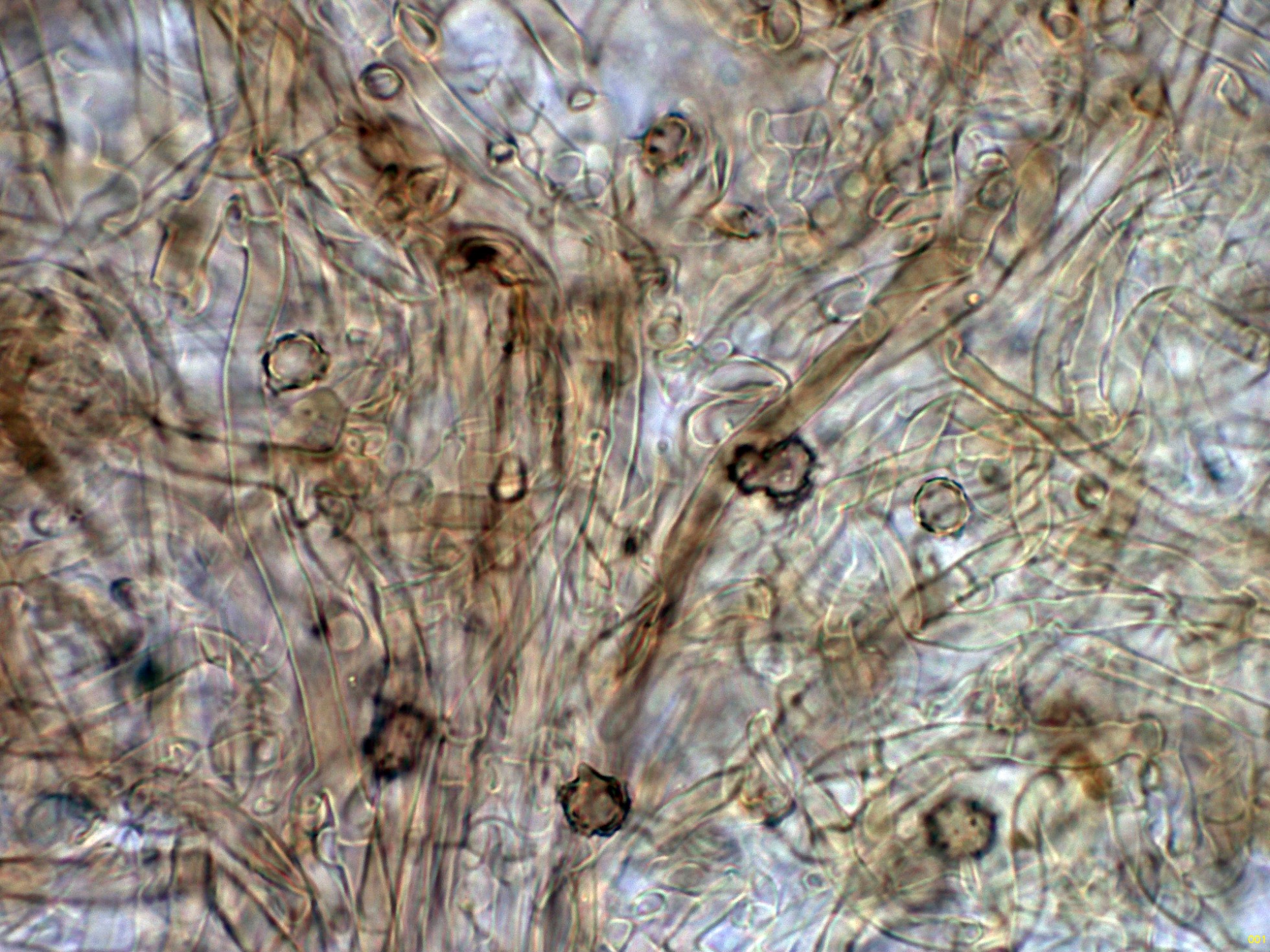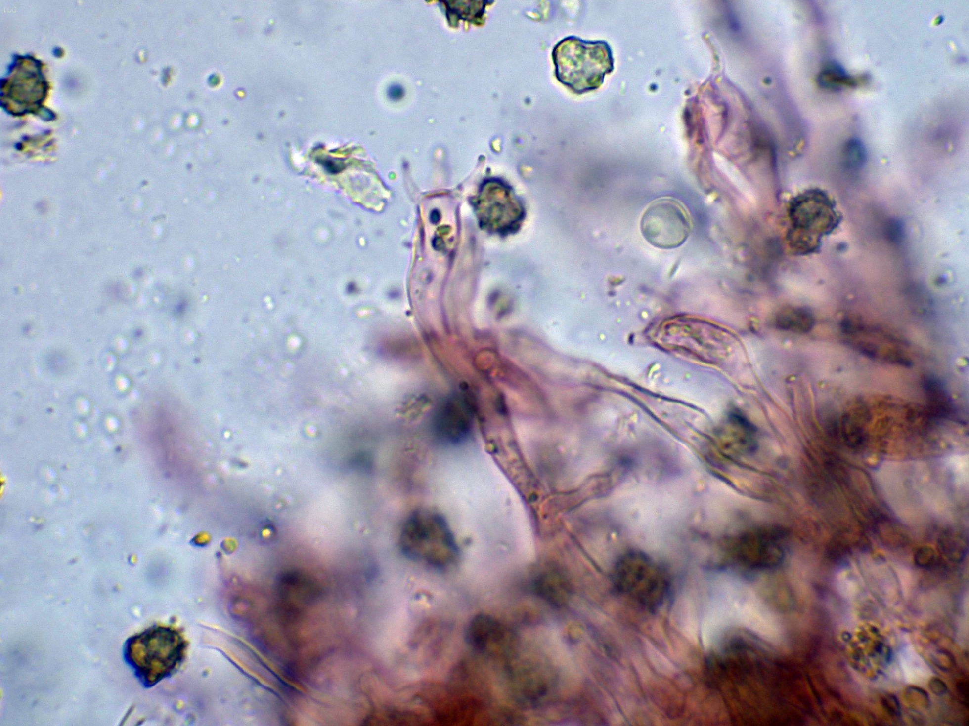 - Tomentella testaceogilva Bourdot & Galzin. Microscopía.