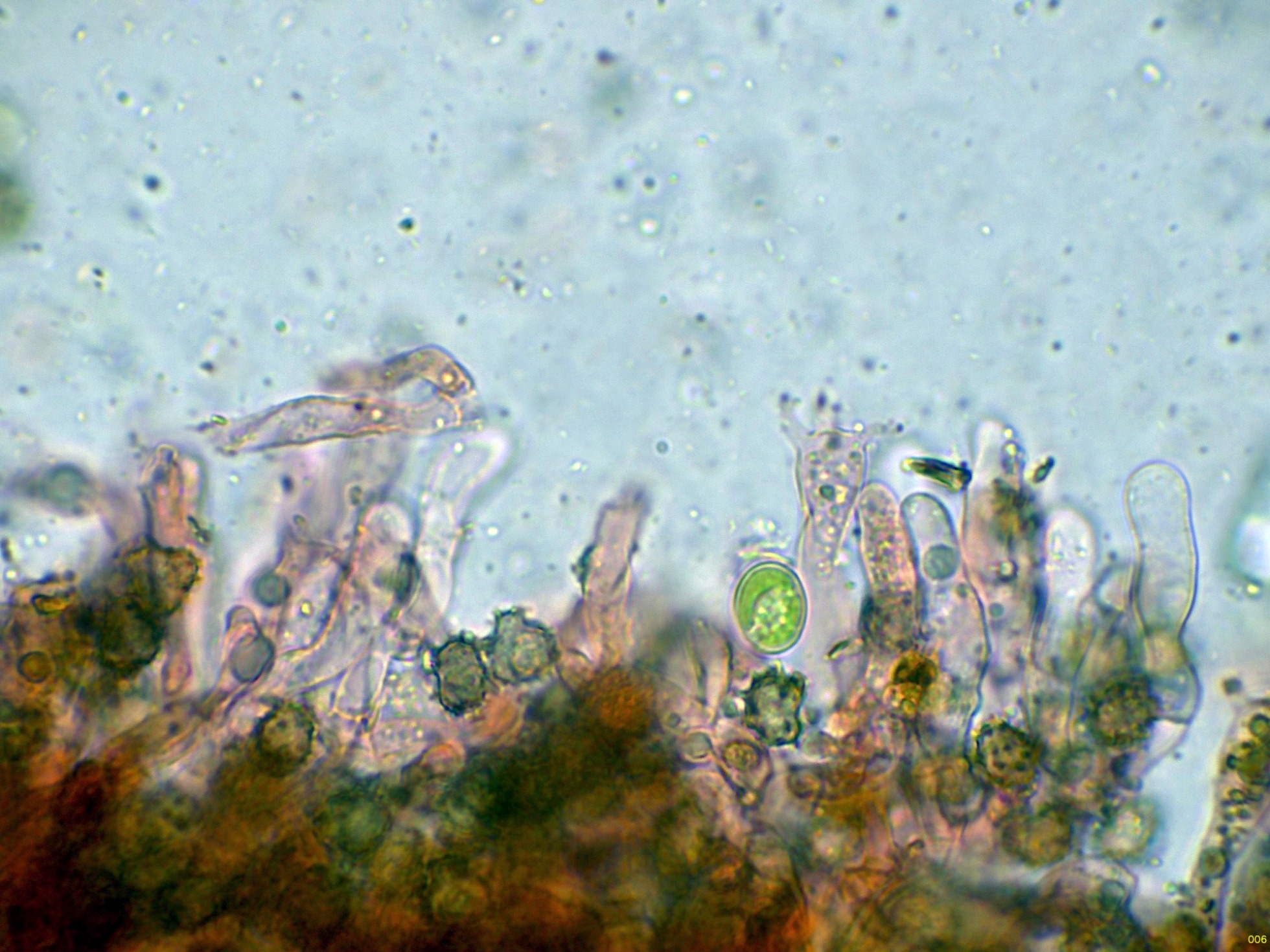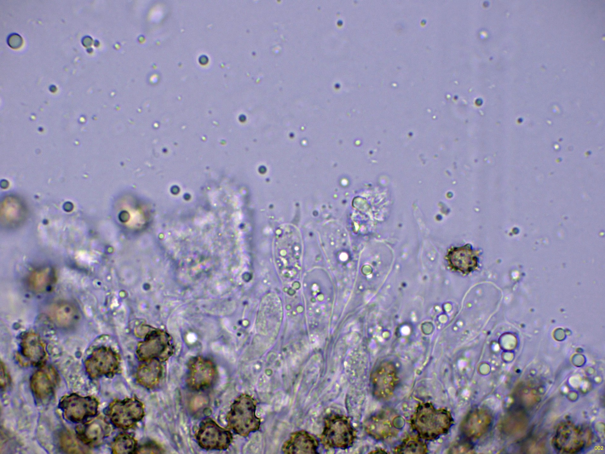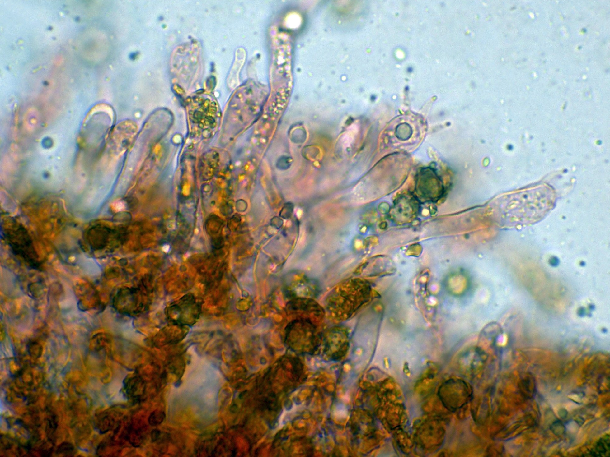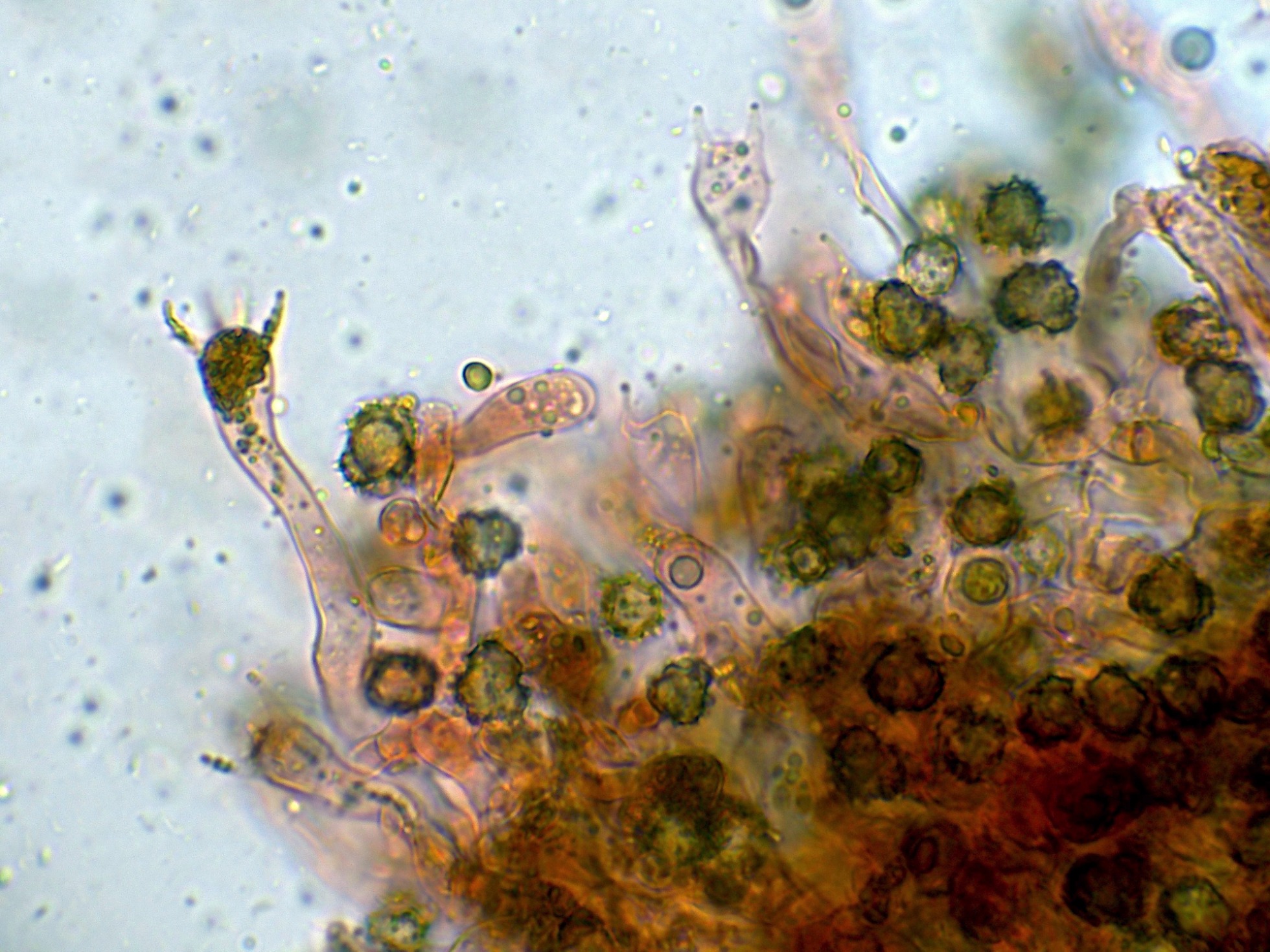 Los basidios en solución de KOH, sin ninguna coloración significativa: