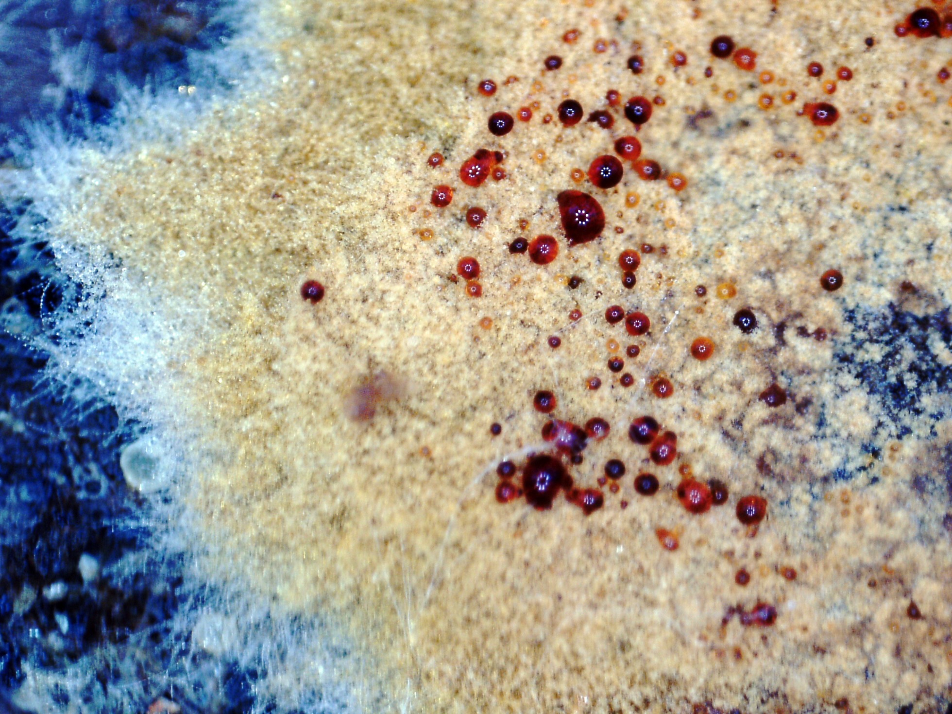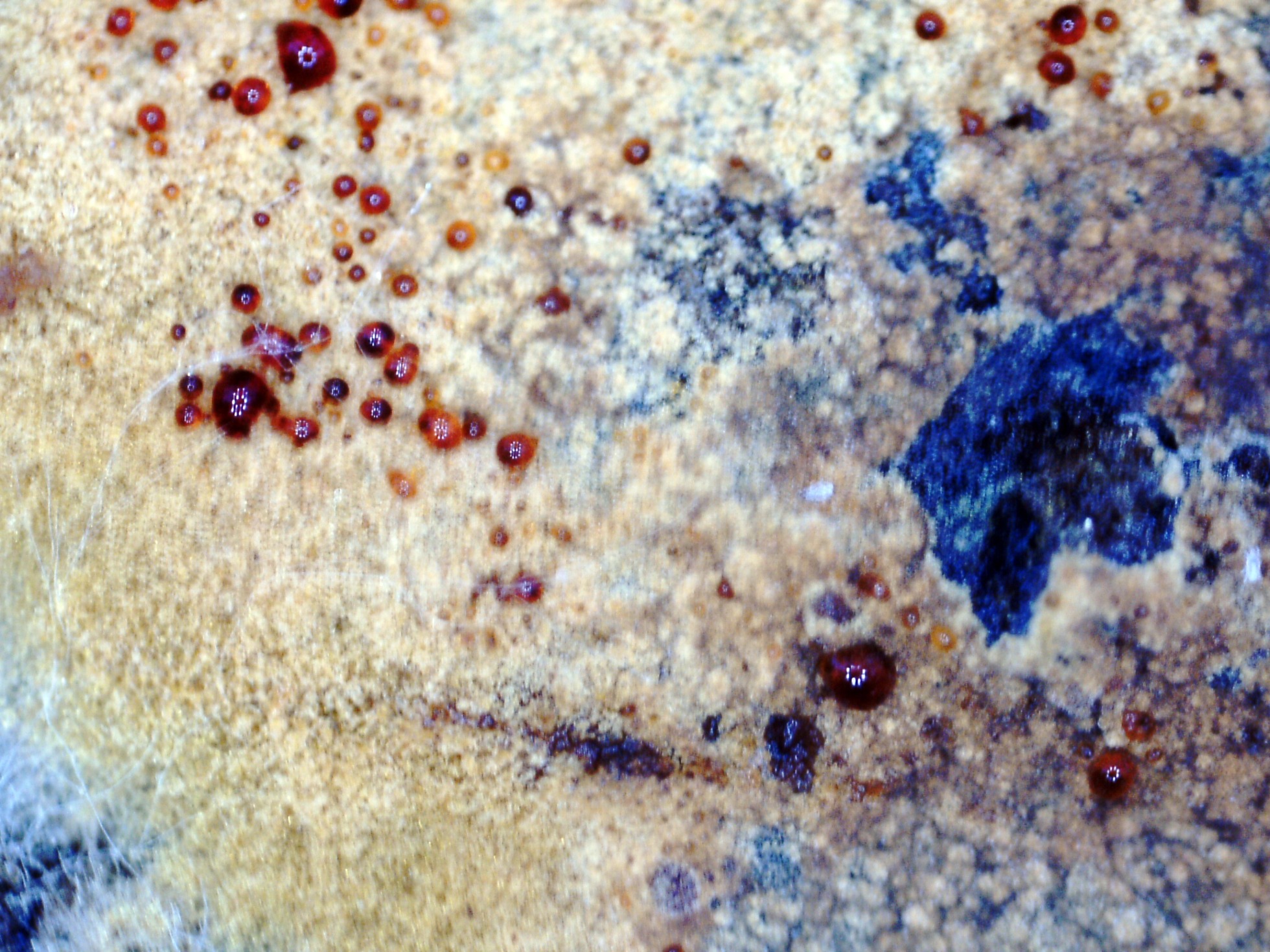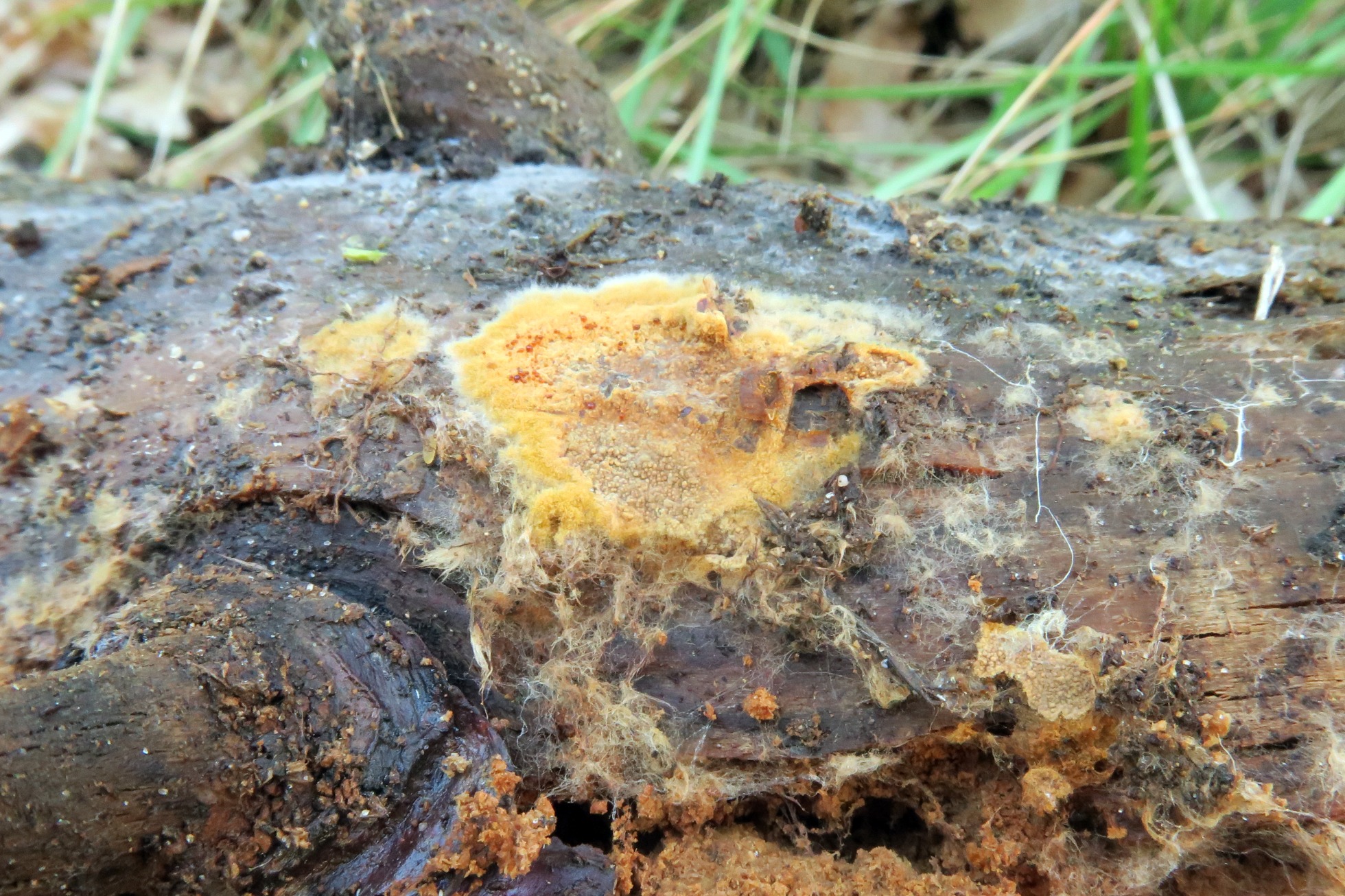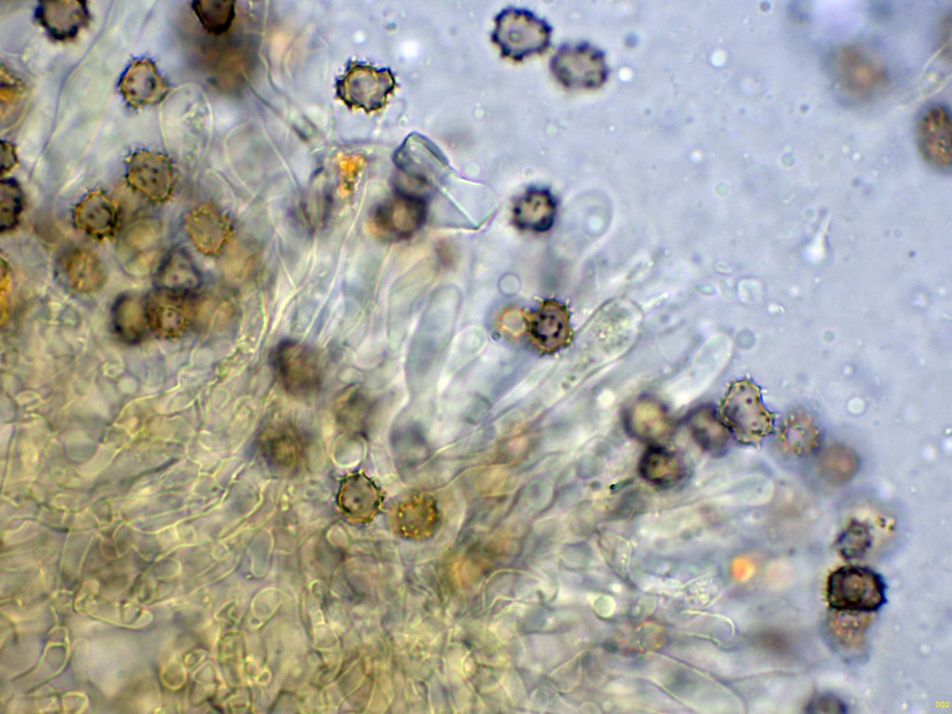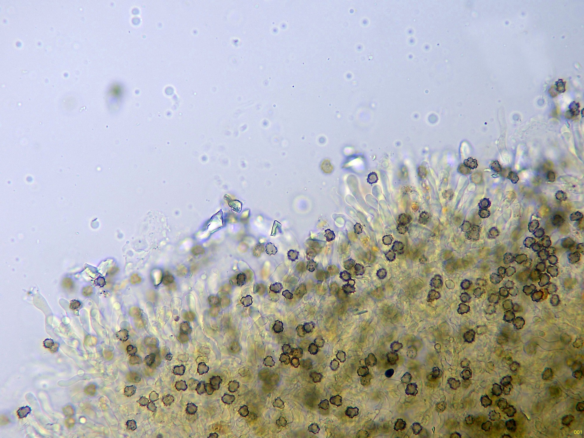 Una Tomentella del 5 de octubre, brotando sobre la superficie de un tronco tumbado, por la parte que está en contacto con el suelo, con un aspecto que me recuerda a la Tomentella umbrinospora, pero que atendiendo a las características microscópicas, todo parece apuntar a una Tomentella que aún no me había encontrado hasta ahora la:
