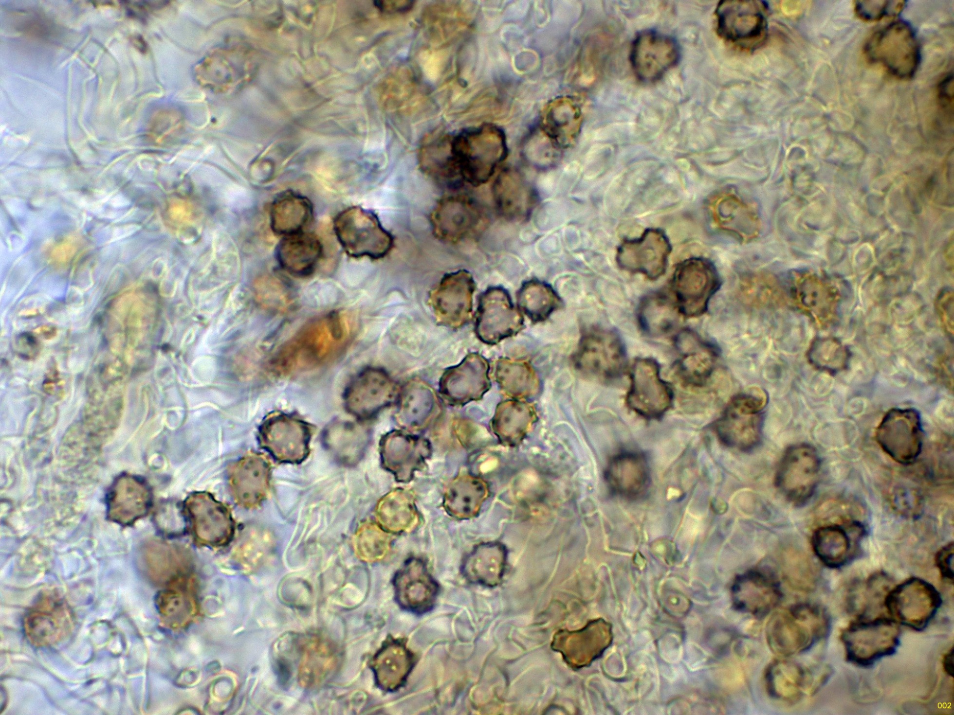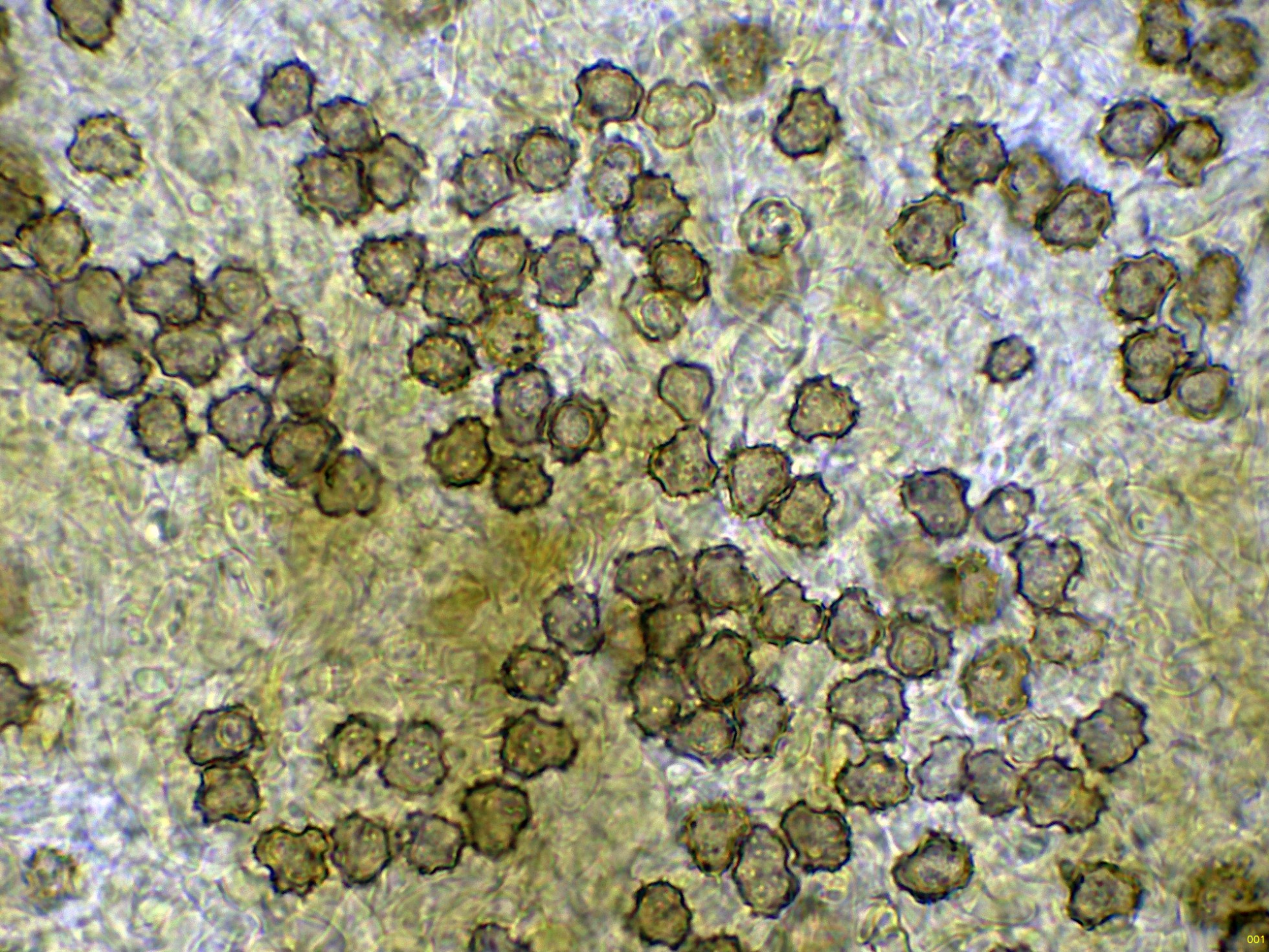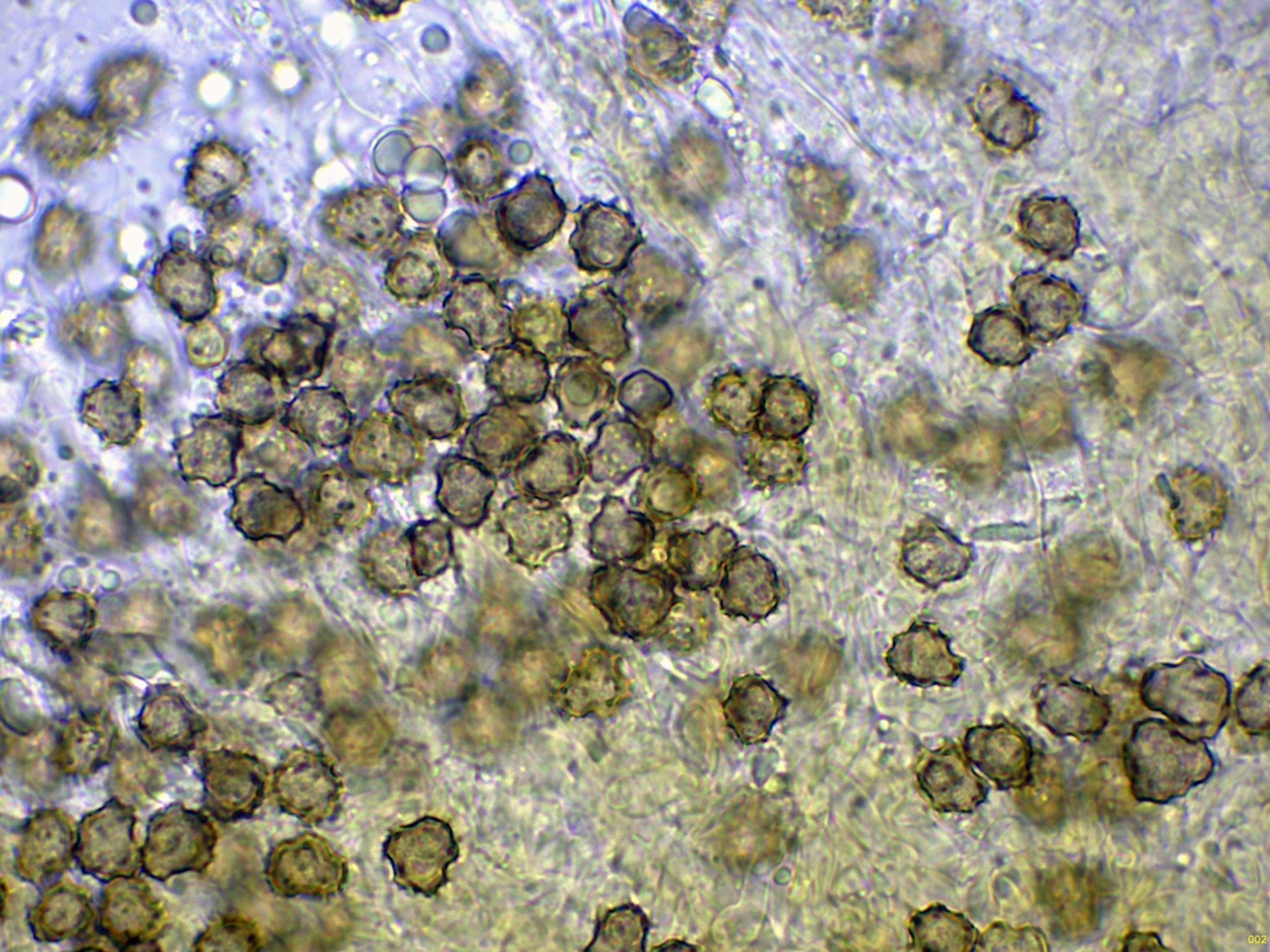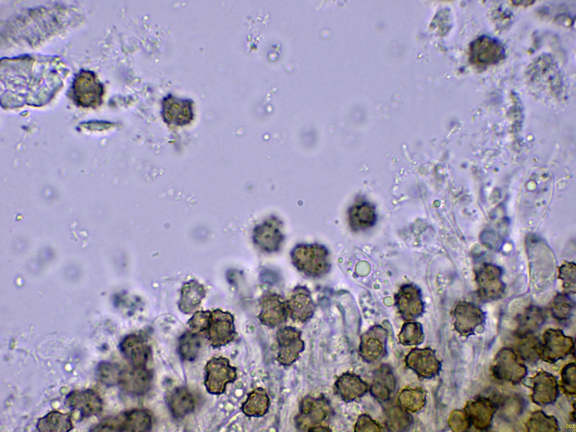 Las esporas en Reactivo de Melzer, sin ninguna reacción amiloide de su apícula:
