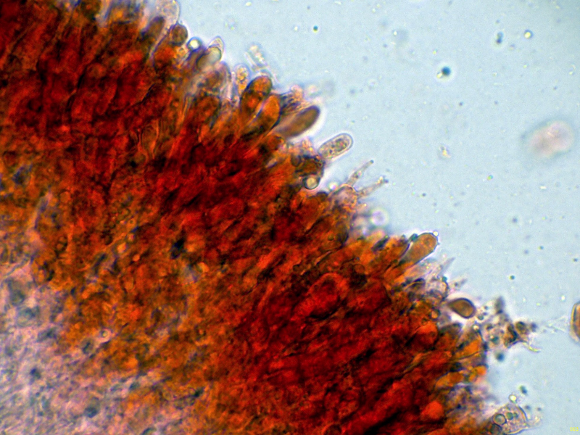 Himenio a 100 aumentos en Reactivo de Melzer, aunque no he podido encontrar en la bibliografía de la especie información al respecto, si que pude observar una reacción amiloide de las hifas subhimeniales y en especial de las subiculares.