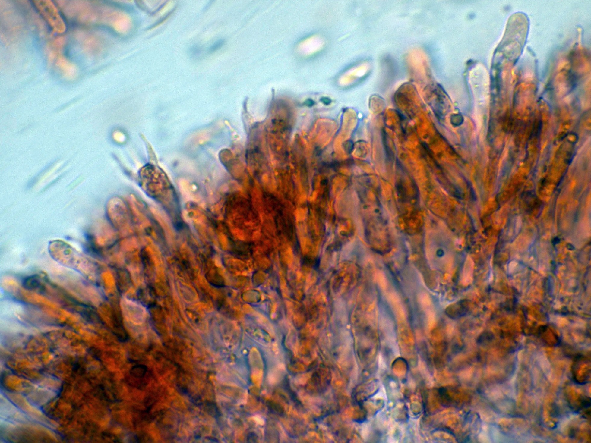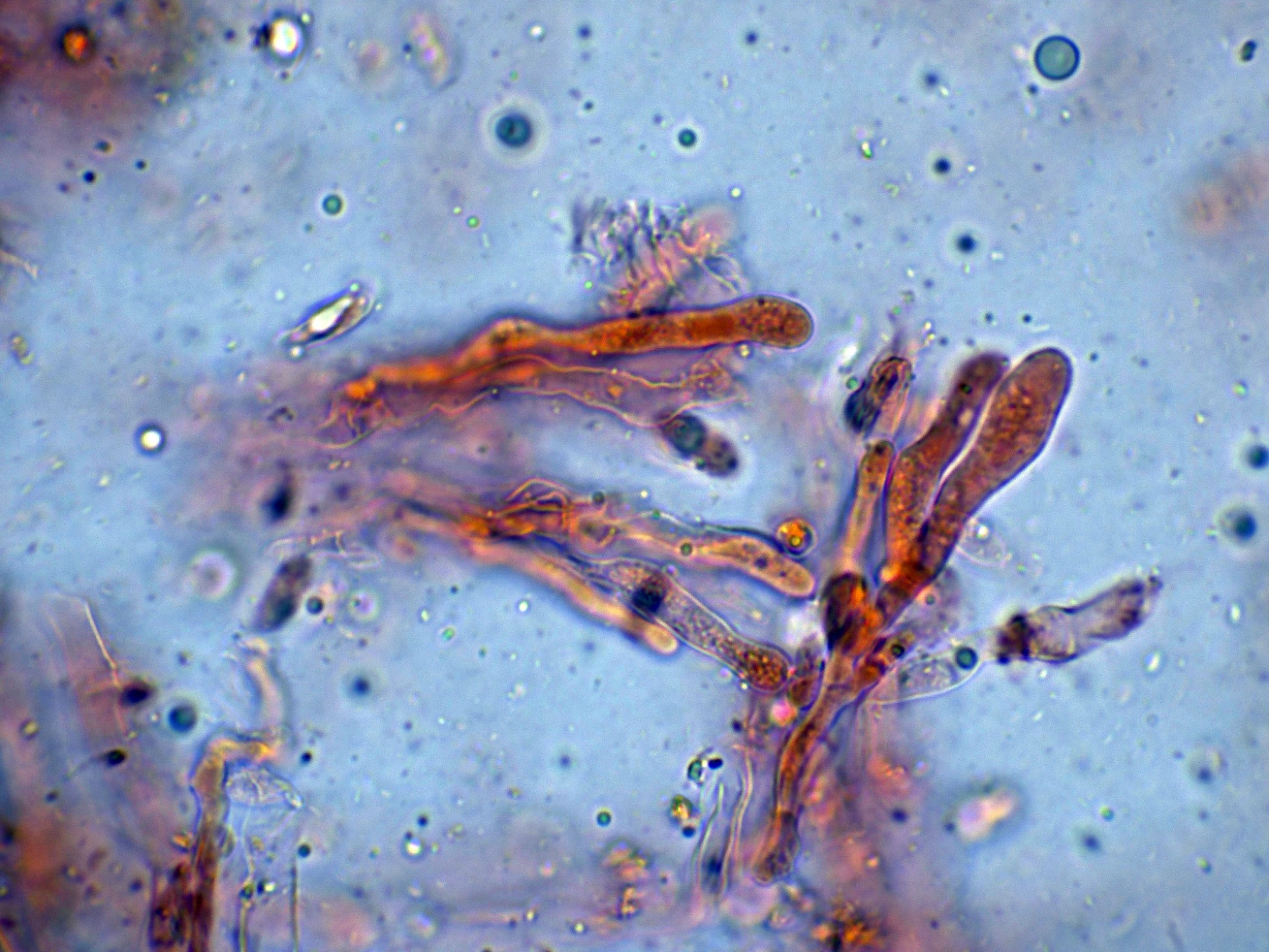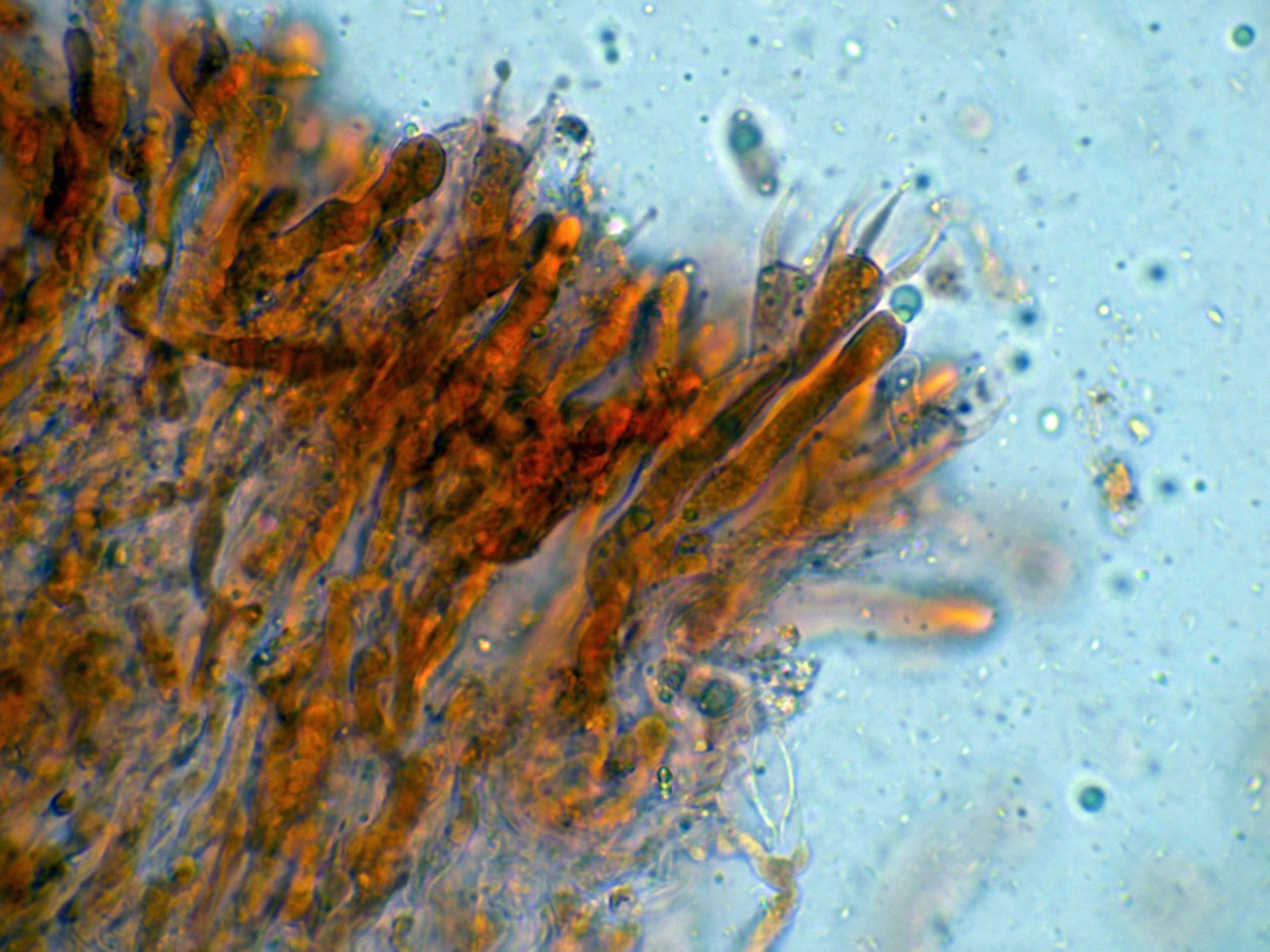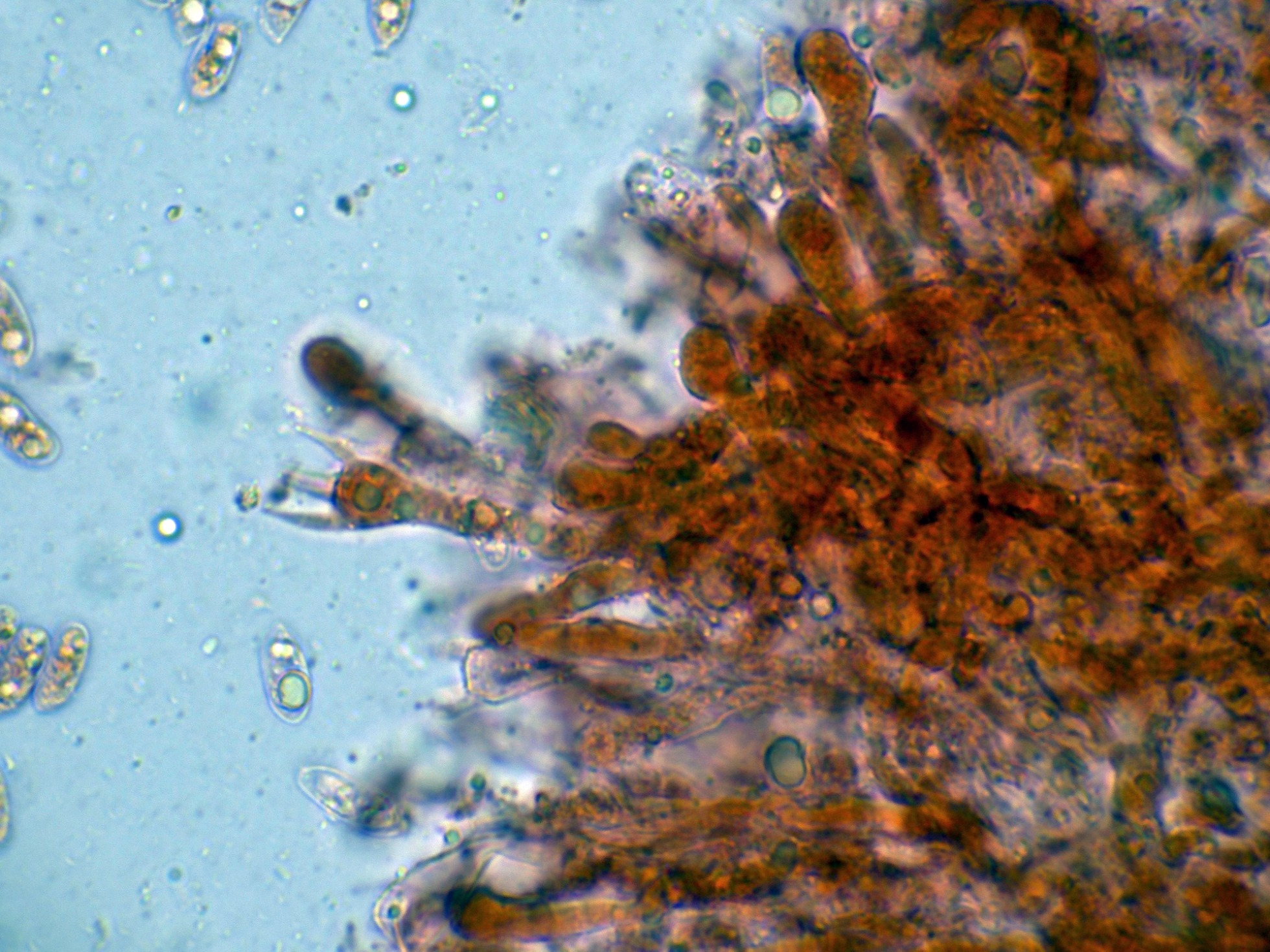 En este medio se puede observar alguna estructura que se correspondería a unos cistidios muy incrustados y hundidos en el himenio que no sobresalen por encima del nivel de los basidios: