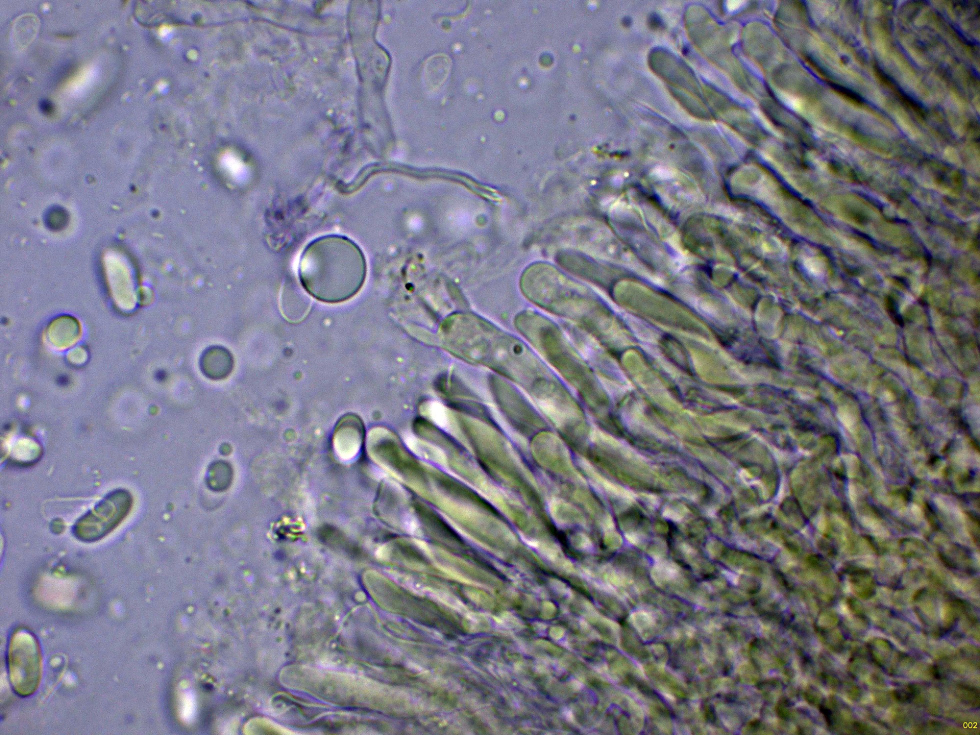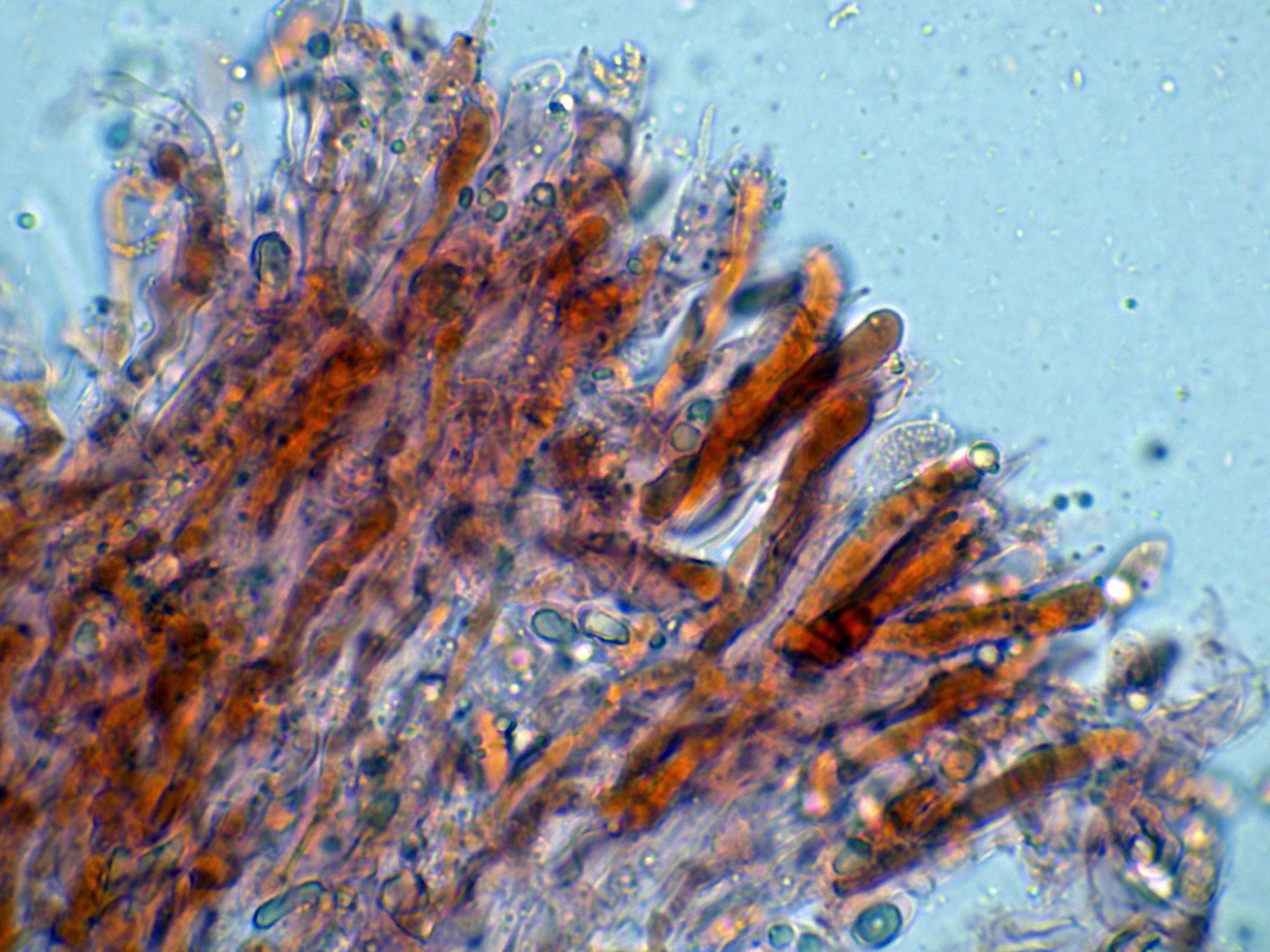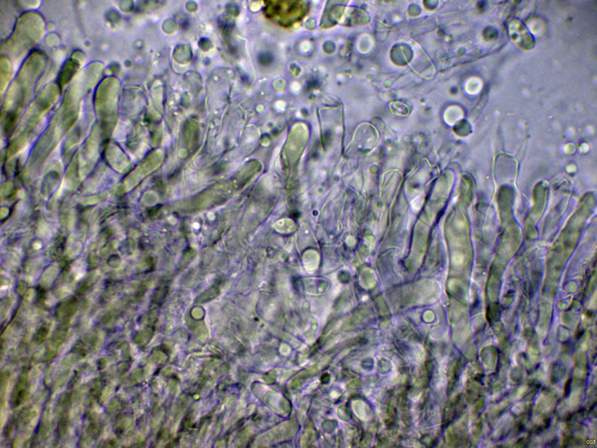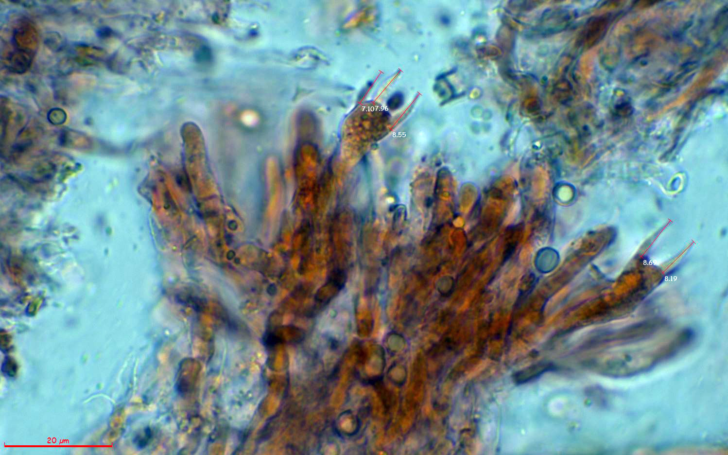 En este medio se puede observar alguna estructura que se correspondería a unos cistidios muy incrustados y hundidos en el himenio que no sobresalen por encima del nivel de los basidios: