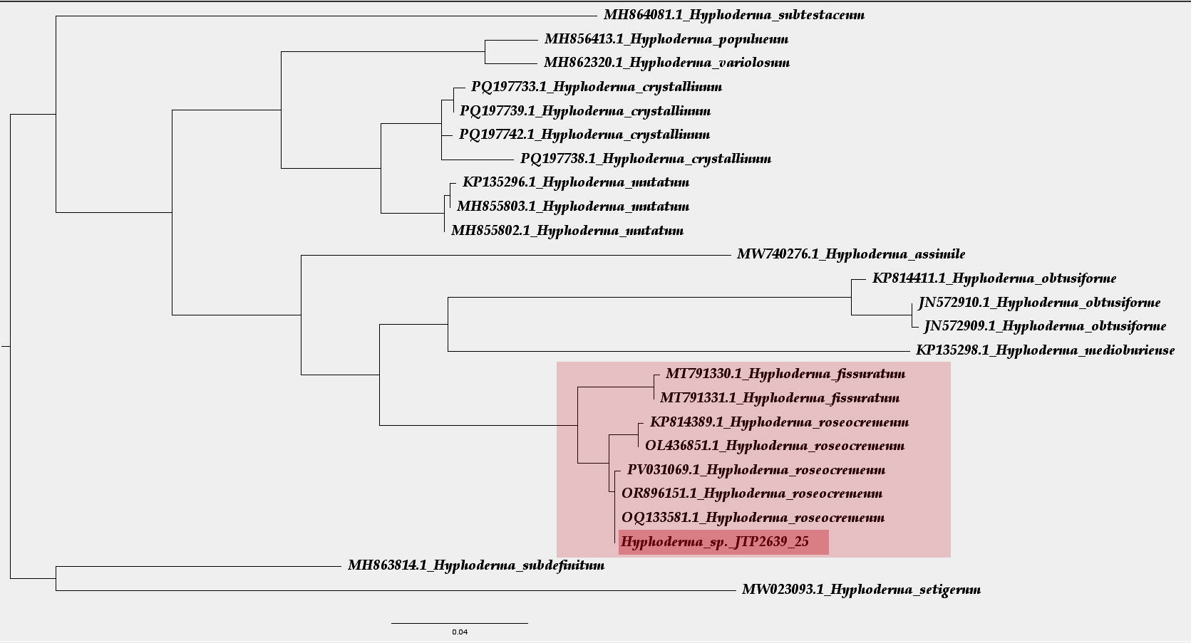 Aquí mi especie, la especie Hyphoderma sp. JTP2639/25, se encuadra perfectamente bien dentro del Clado de lo que molecularmente se puede considerar como Hyphoderma roseocremeum, y muy cercano, aunque ya en otro Clado, al Hyphoderma fissuratum.