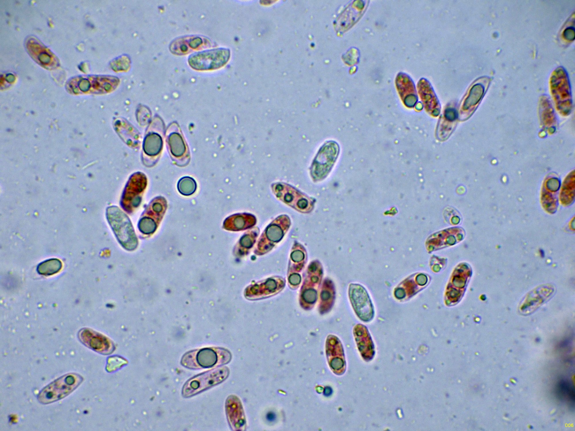 Basidios en Reactivo de Melzer, con esporas inamiloides: