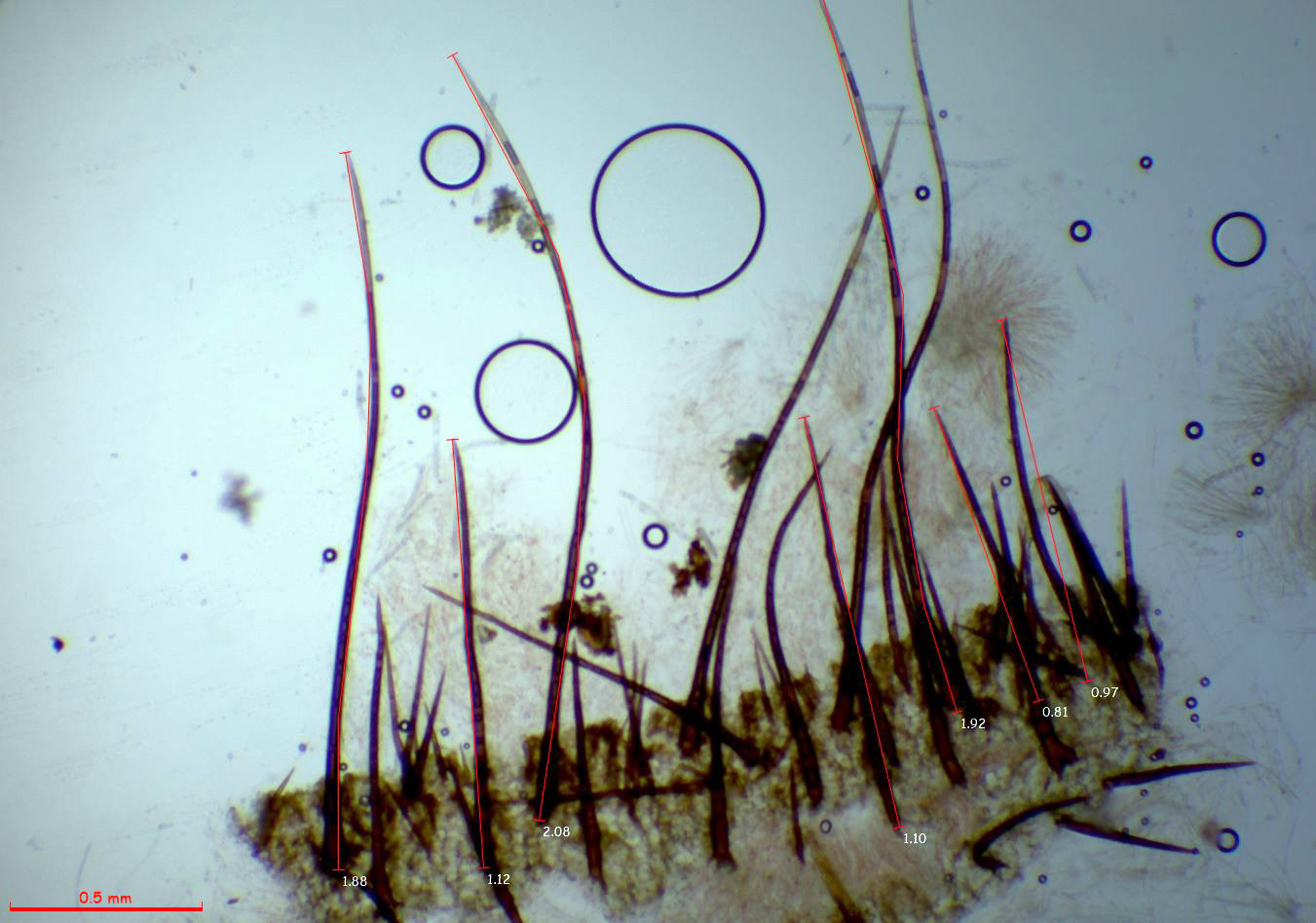 Pelos marginales a 40 aumentos, con unas medidas de entre 0,8 a 2,1 mm.
