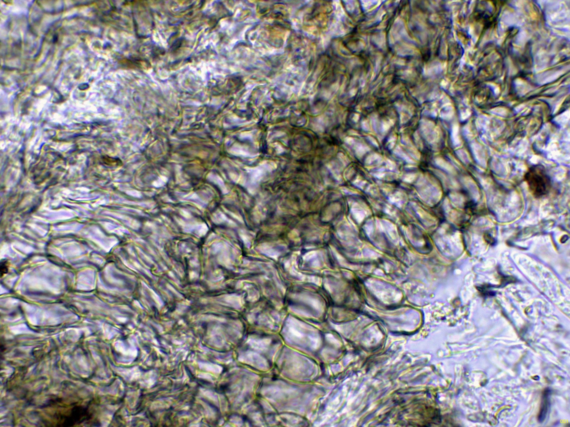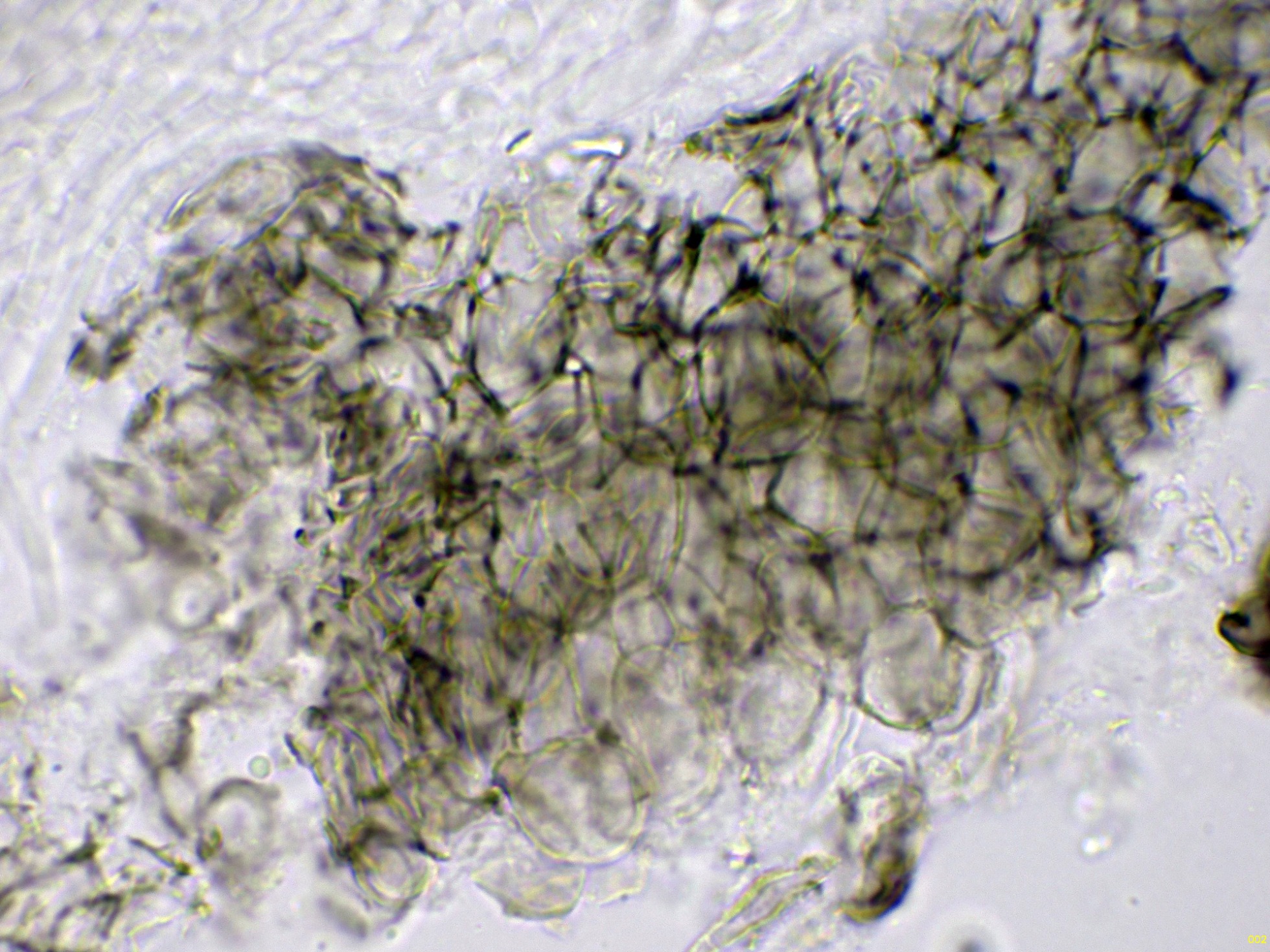 Las hifas del excípulo en solución de Melzer, previo tratamiento con KOH: