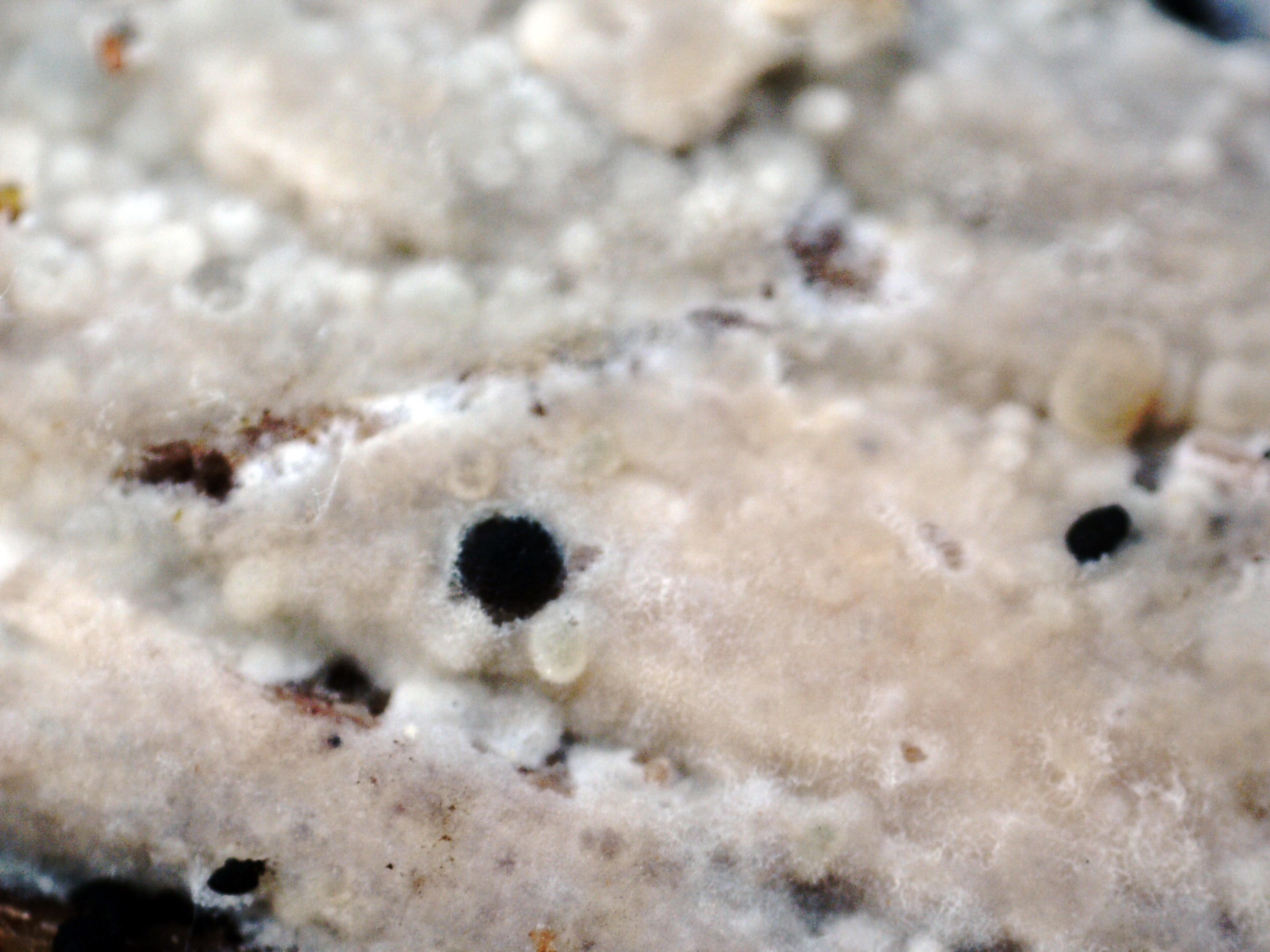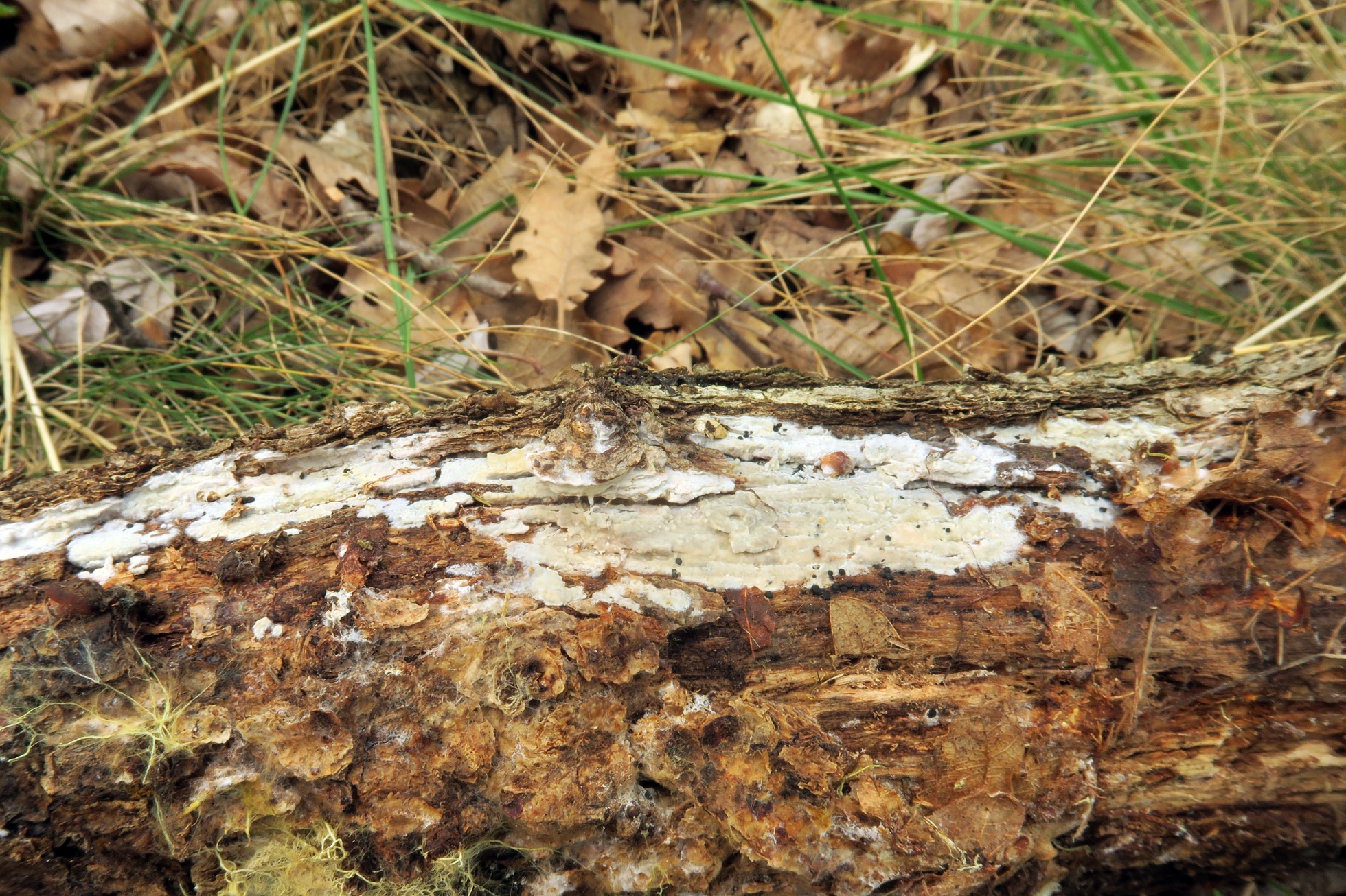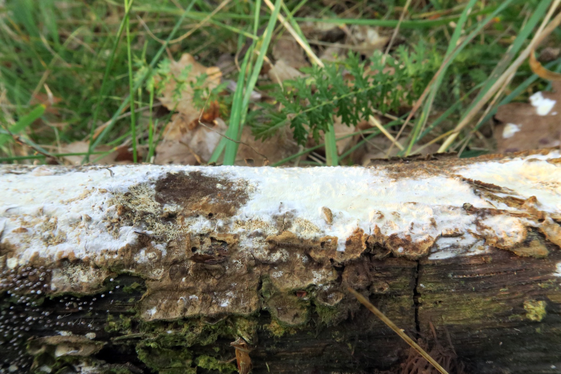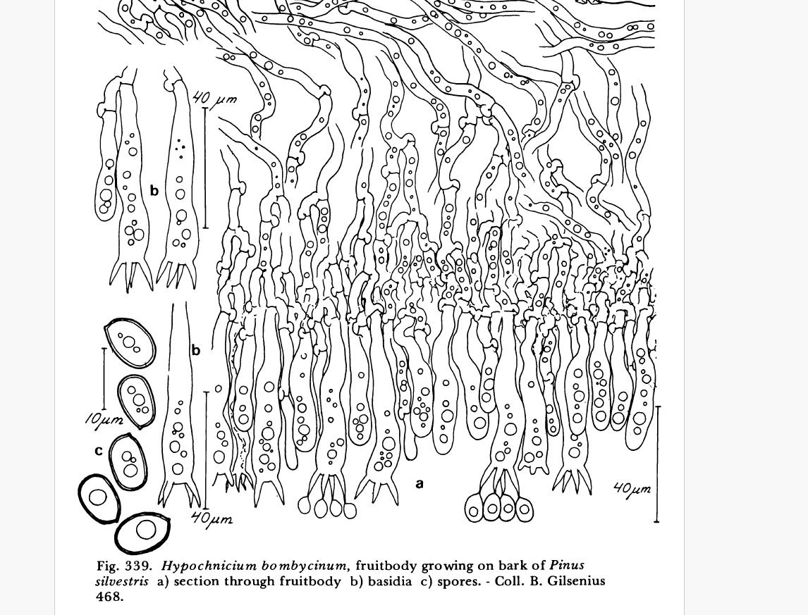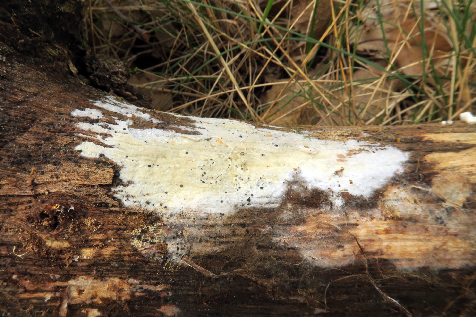 Seguimos con otro Corticial, muy parecido tanto en el aspecto macro como a nivel microscópico al anterior pero sin gloeocistidios, sobre un tronco tumbado de Pinus sylvestris, probablemente el Hypochnicium bombycinum: