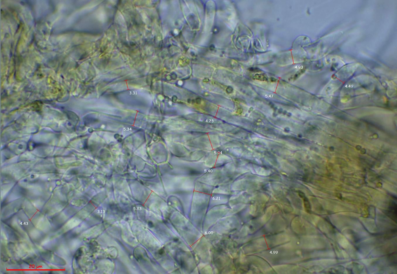 Una imágen con las medidas en anchura de las hifas de la pileipellis: