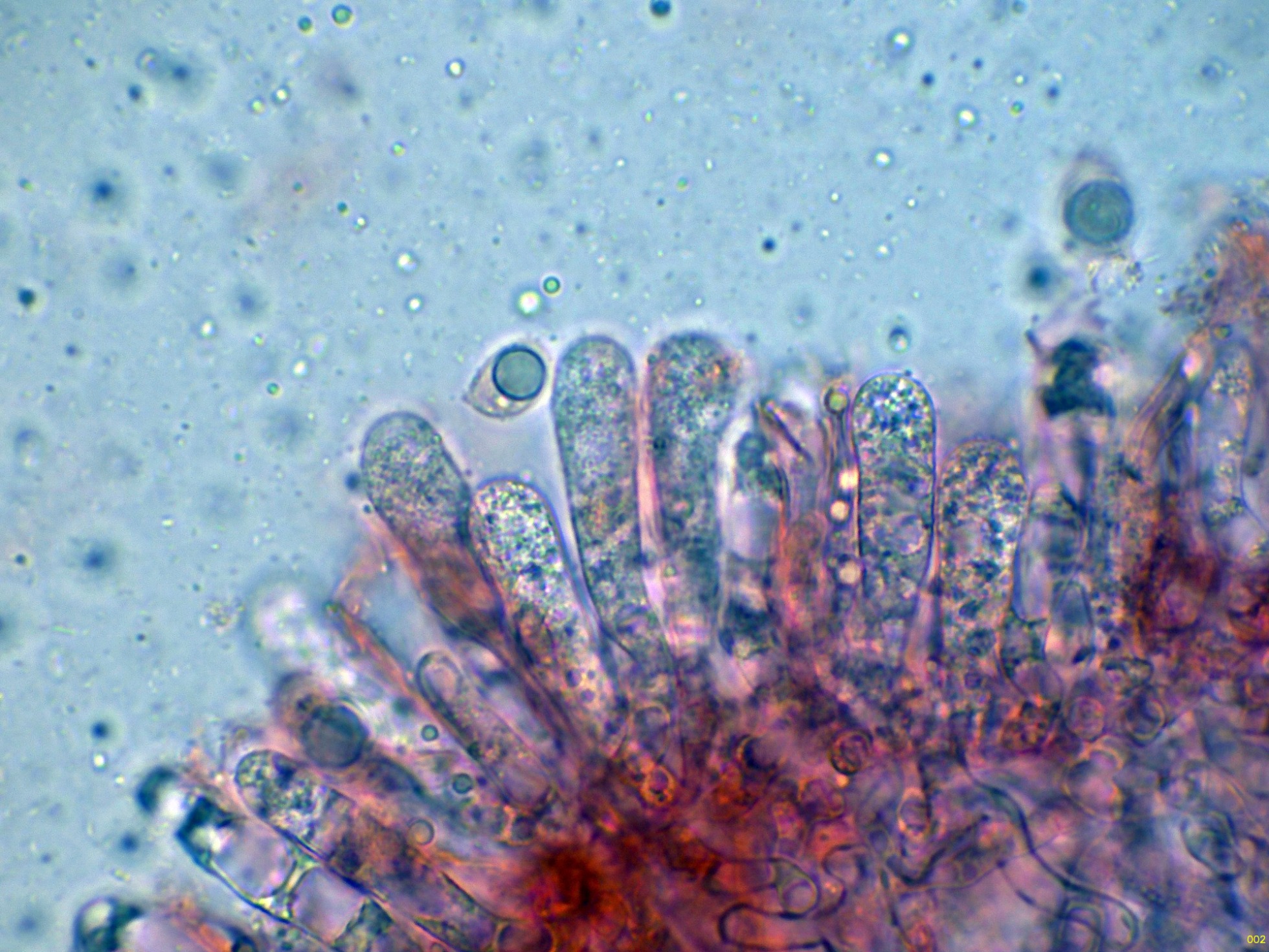 Los basidios de la cara laminar en solución de Rojo Congo, con unas medidas de (27.1) 30.6 - 38.2 (38.5) × 7.1 - 9 (9.1) µm.: