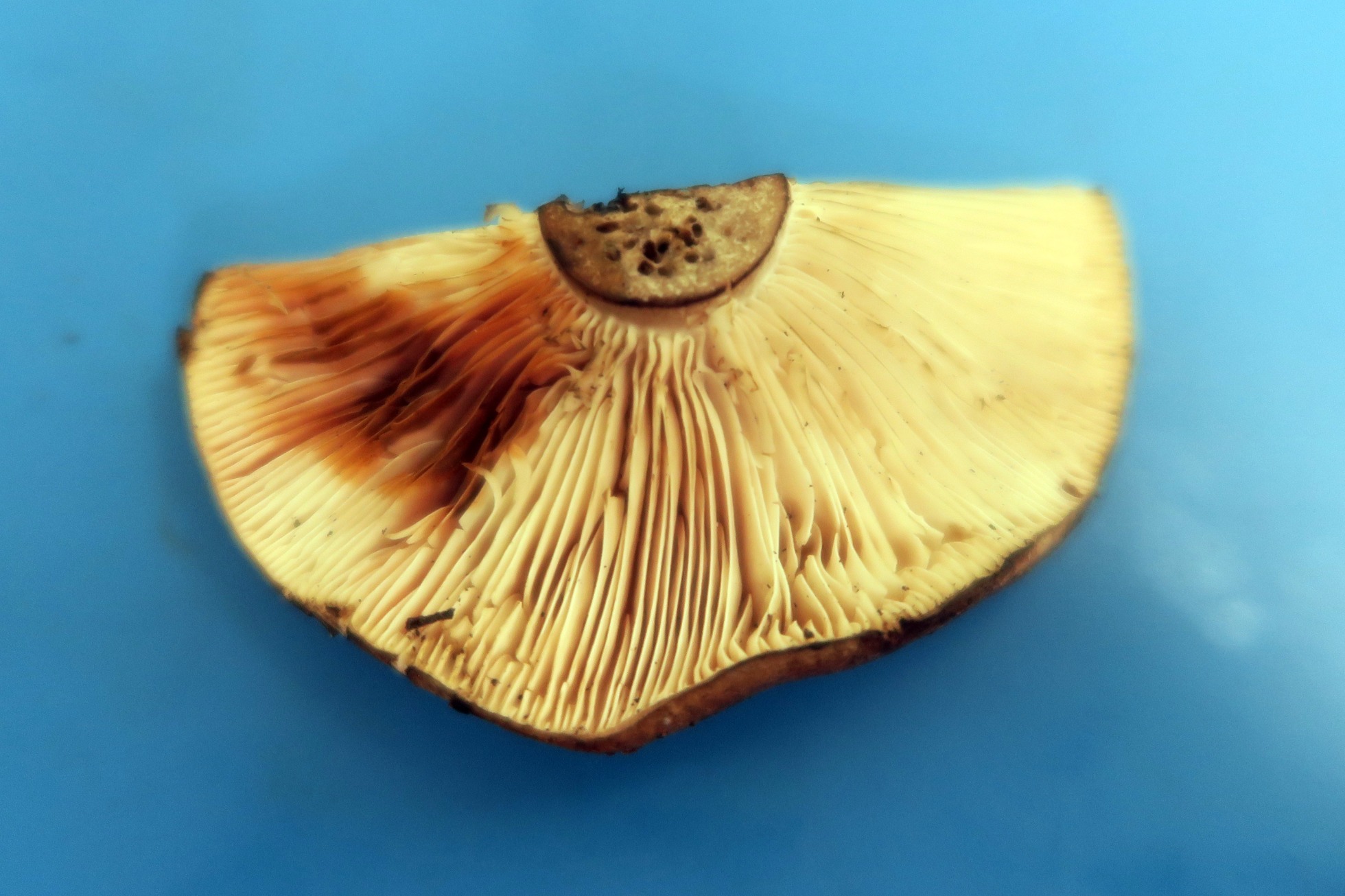 Detalle de las láminas adnatas, de color amarillo y muchas de ellas bifurcadas: