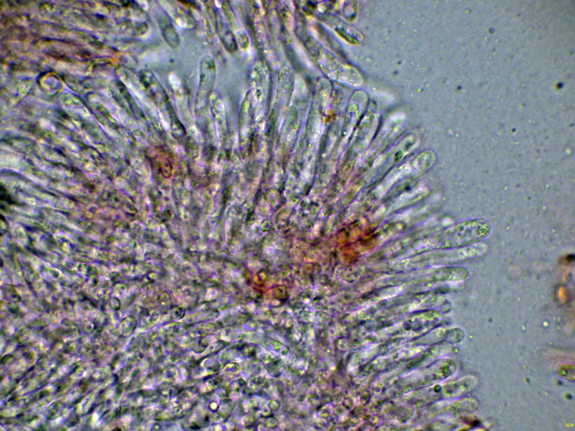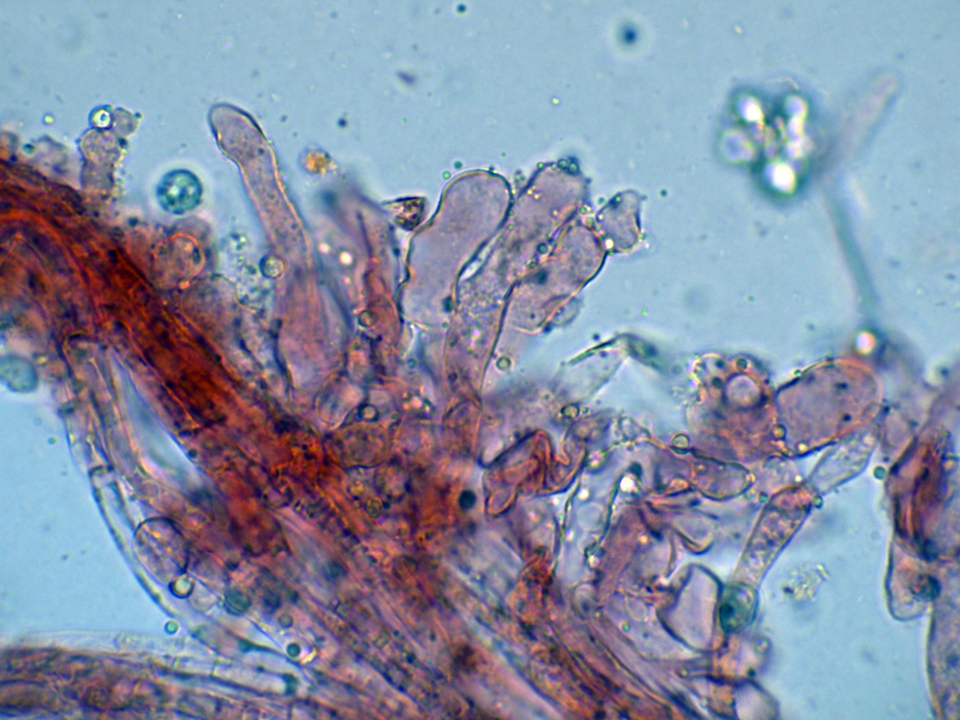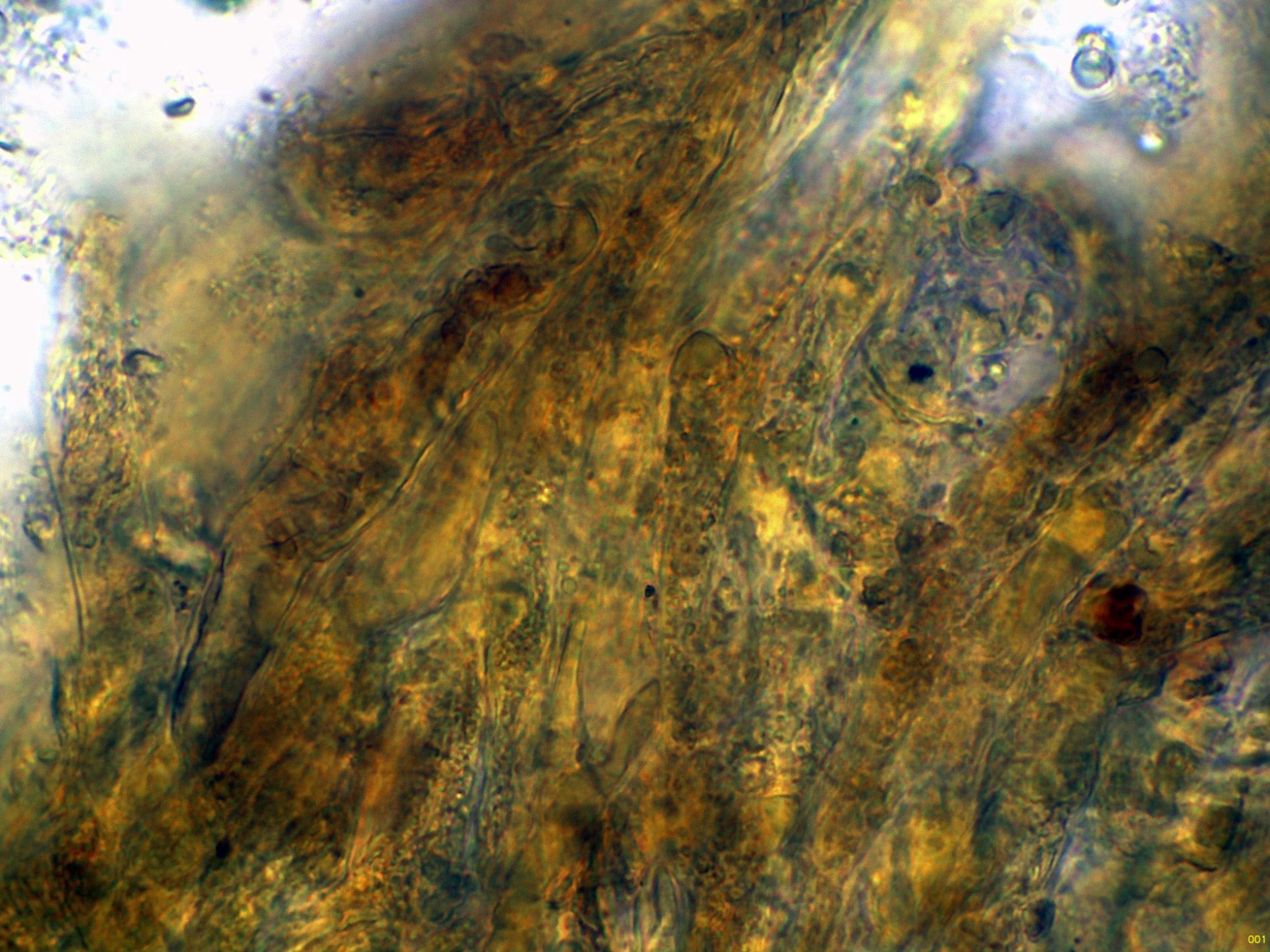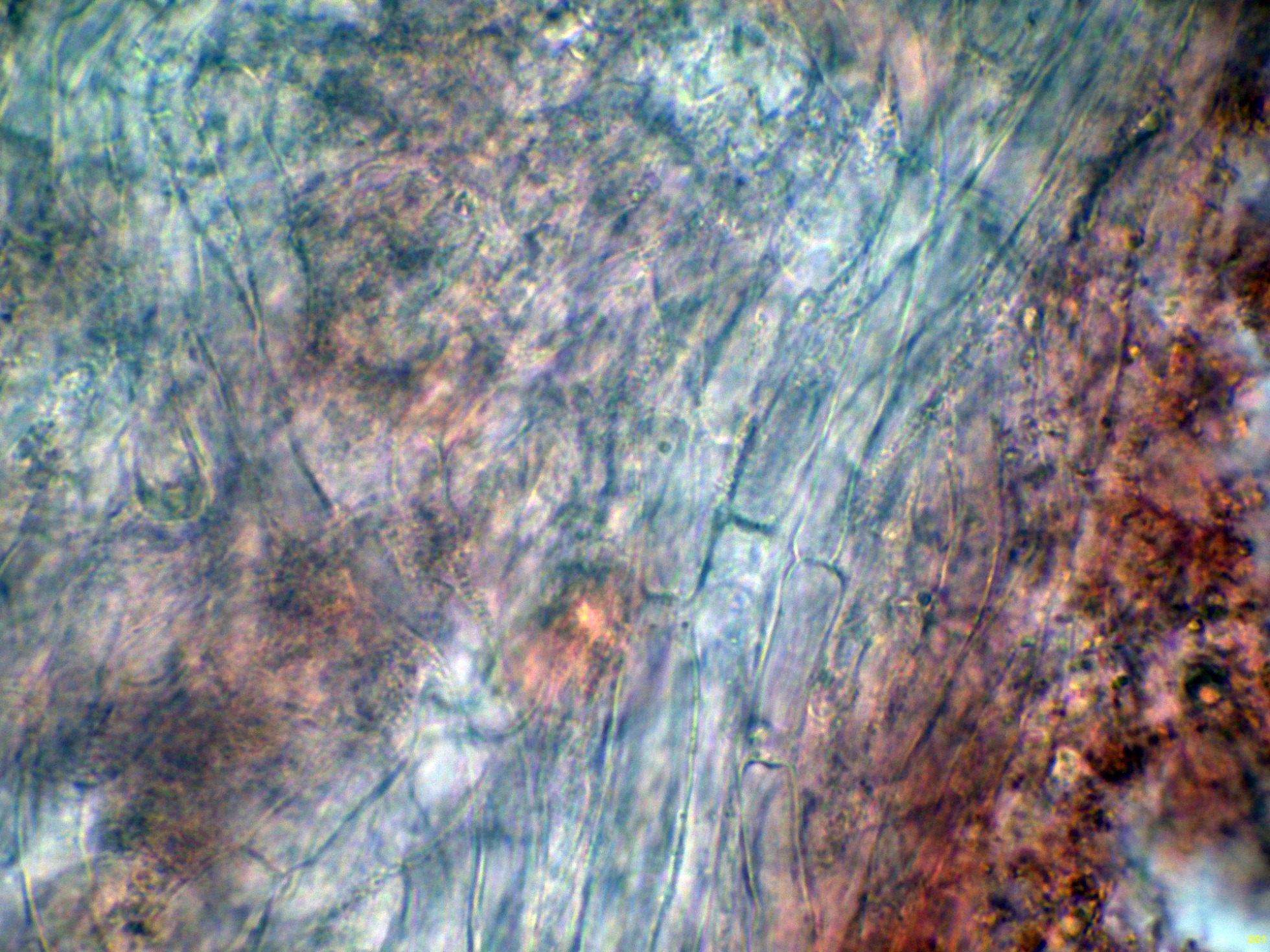 Para terminar con las microscopías, uno que aunque parecía brotar del suelo, lo hacía sobre un resto de tocón enterrado de pino, ya un poco desmejorada, tenemos la Tricholomopsis rutilans: