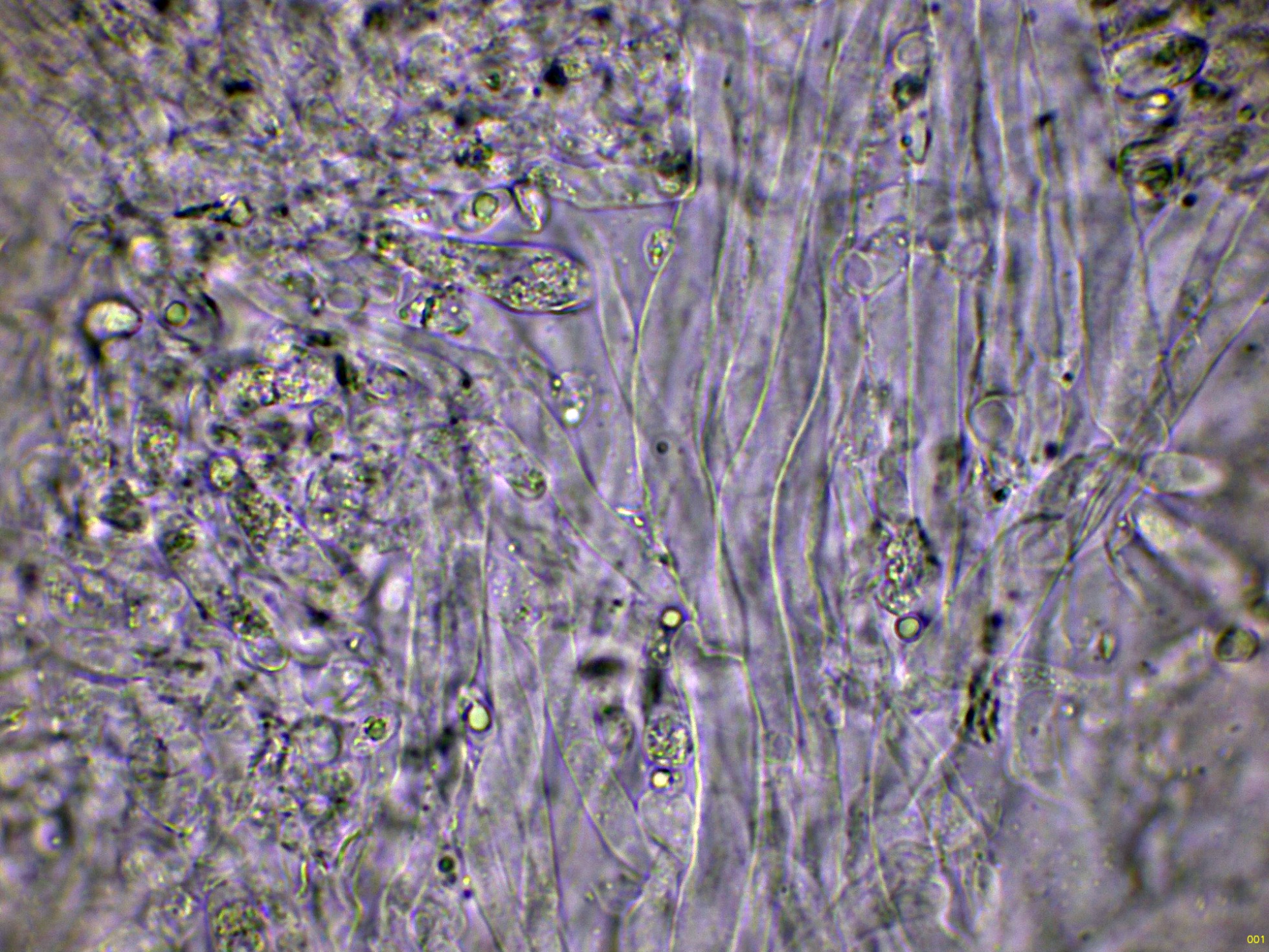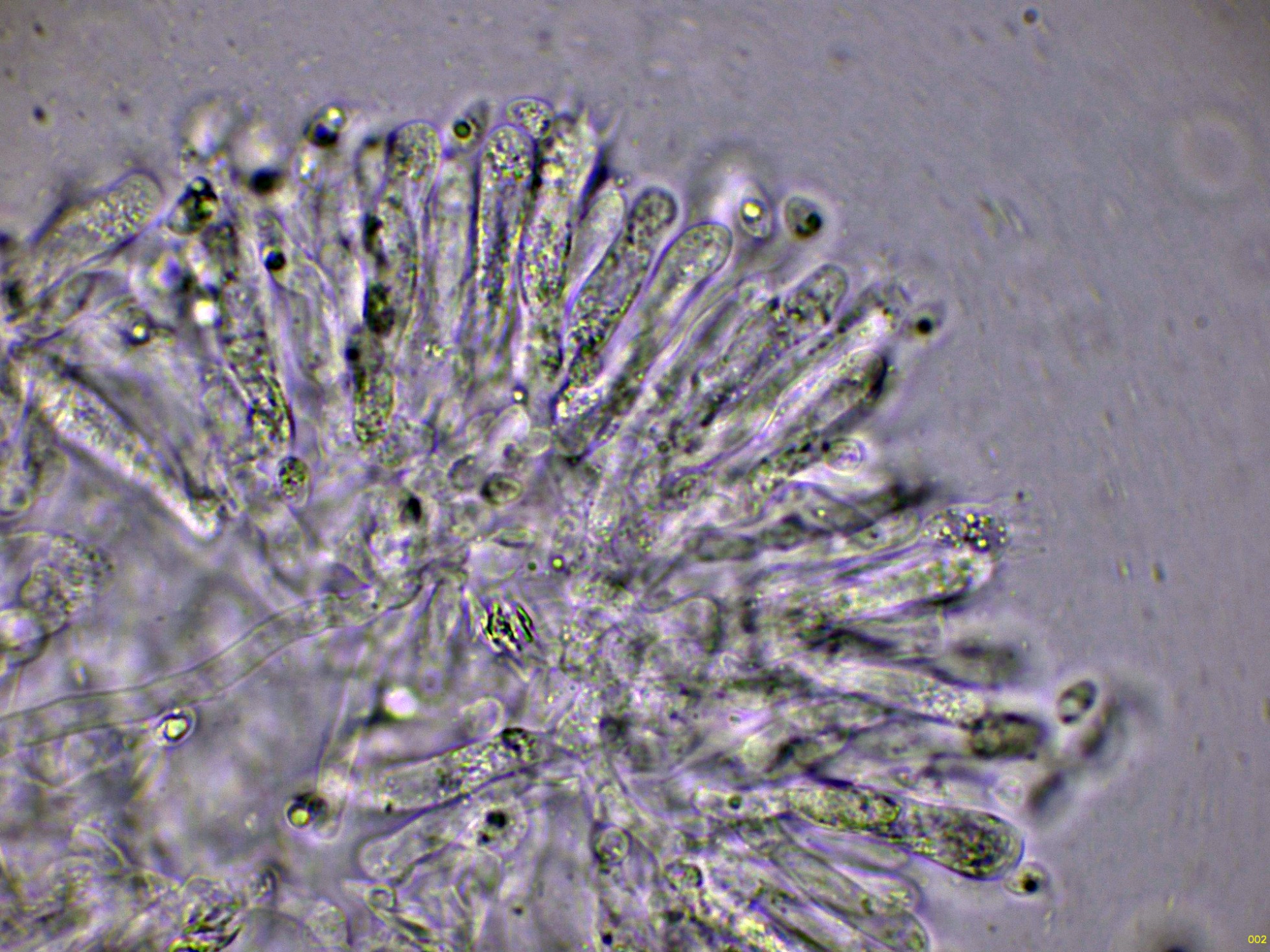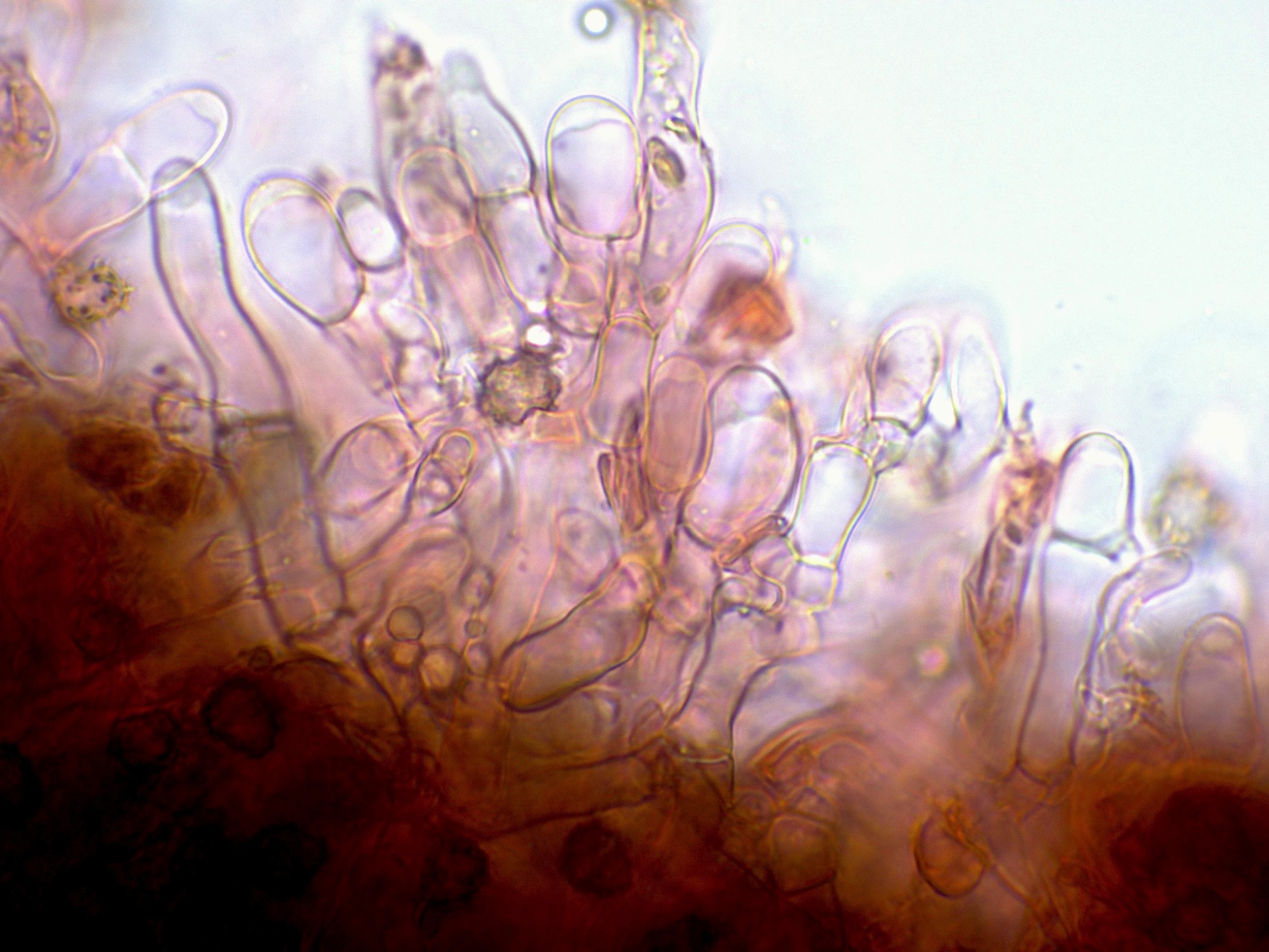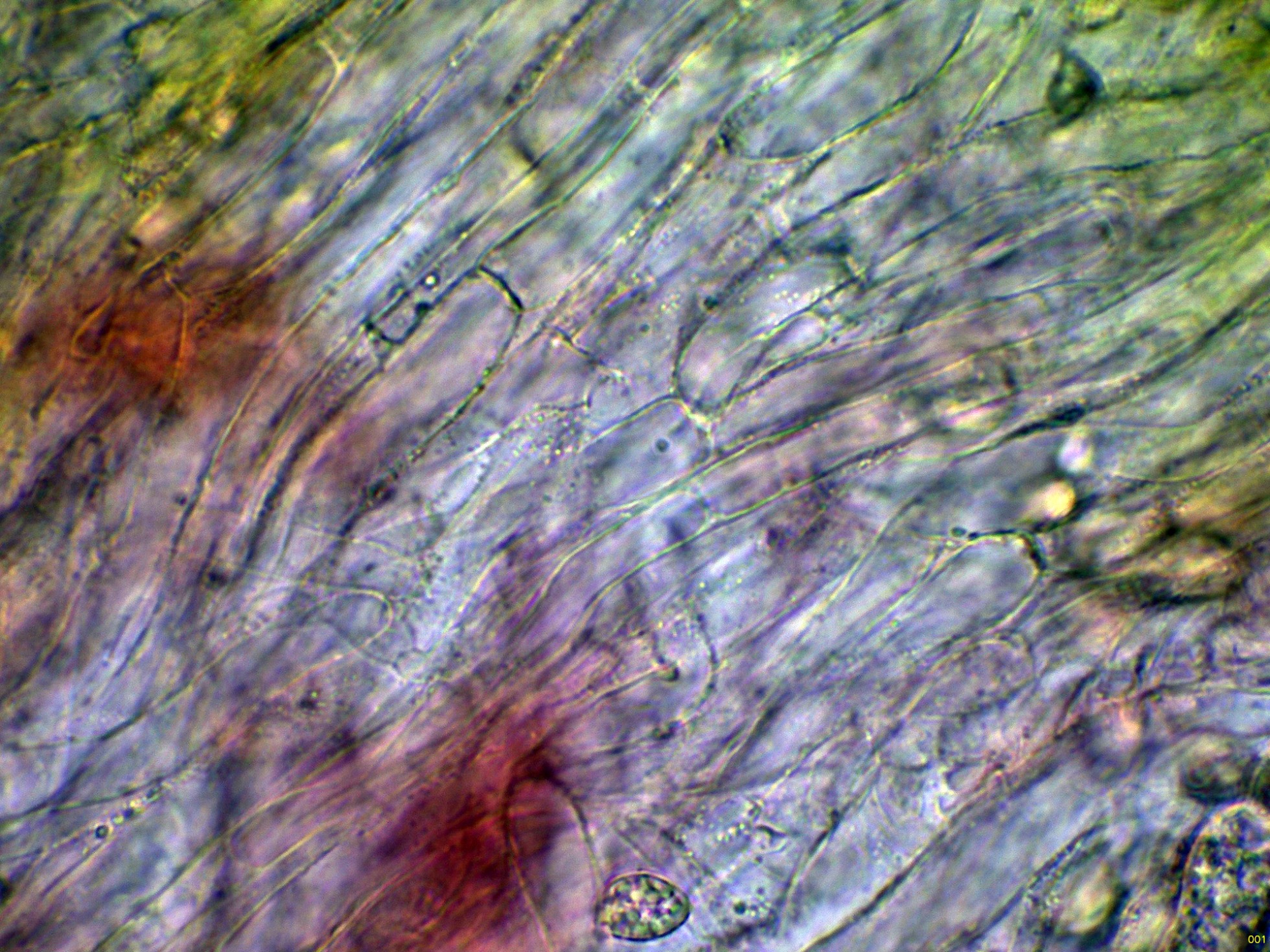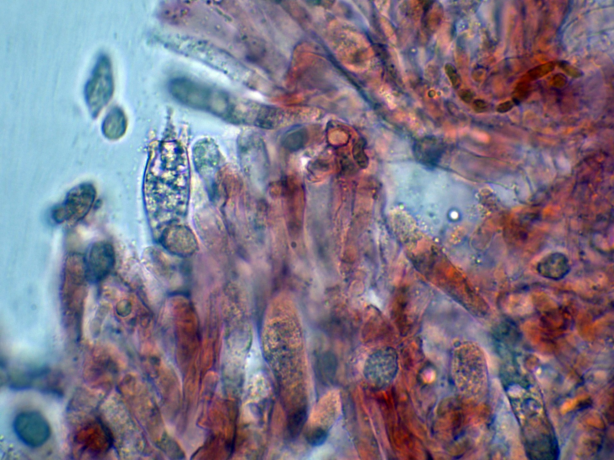 Para terminar con las microscopías, uno que aunque parecía brotar del suelo, lo hacía sobre un resto de tocón enterrado de pino, ya un poco desmejorada, tenemos la Tricholomopsis rutilans: