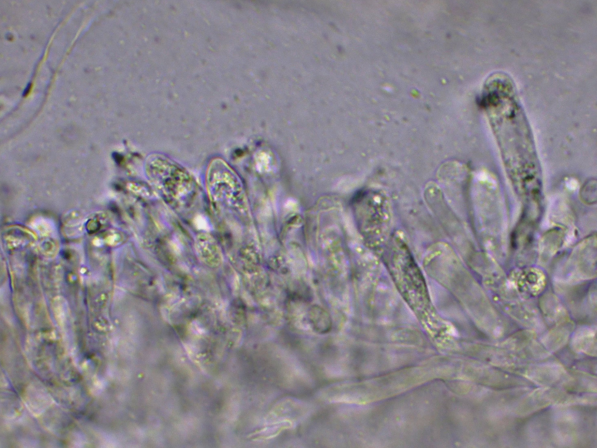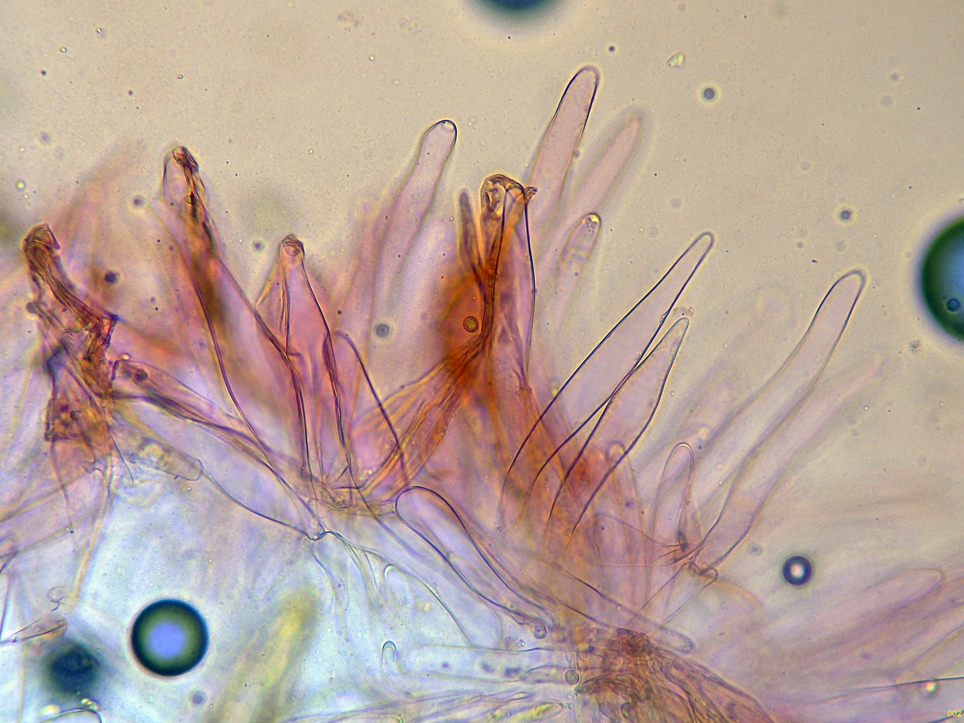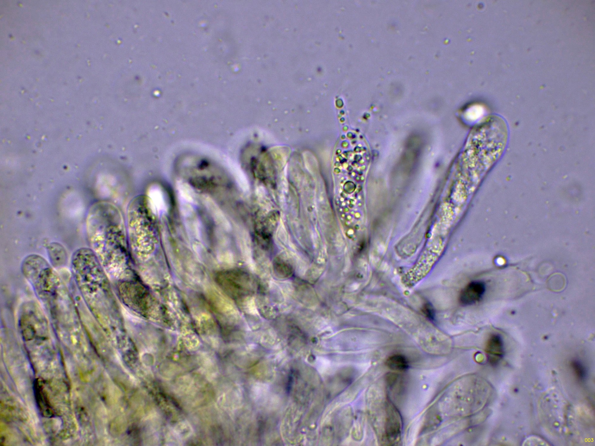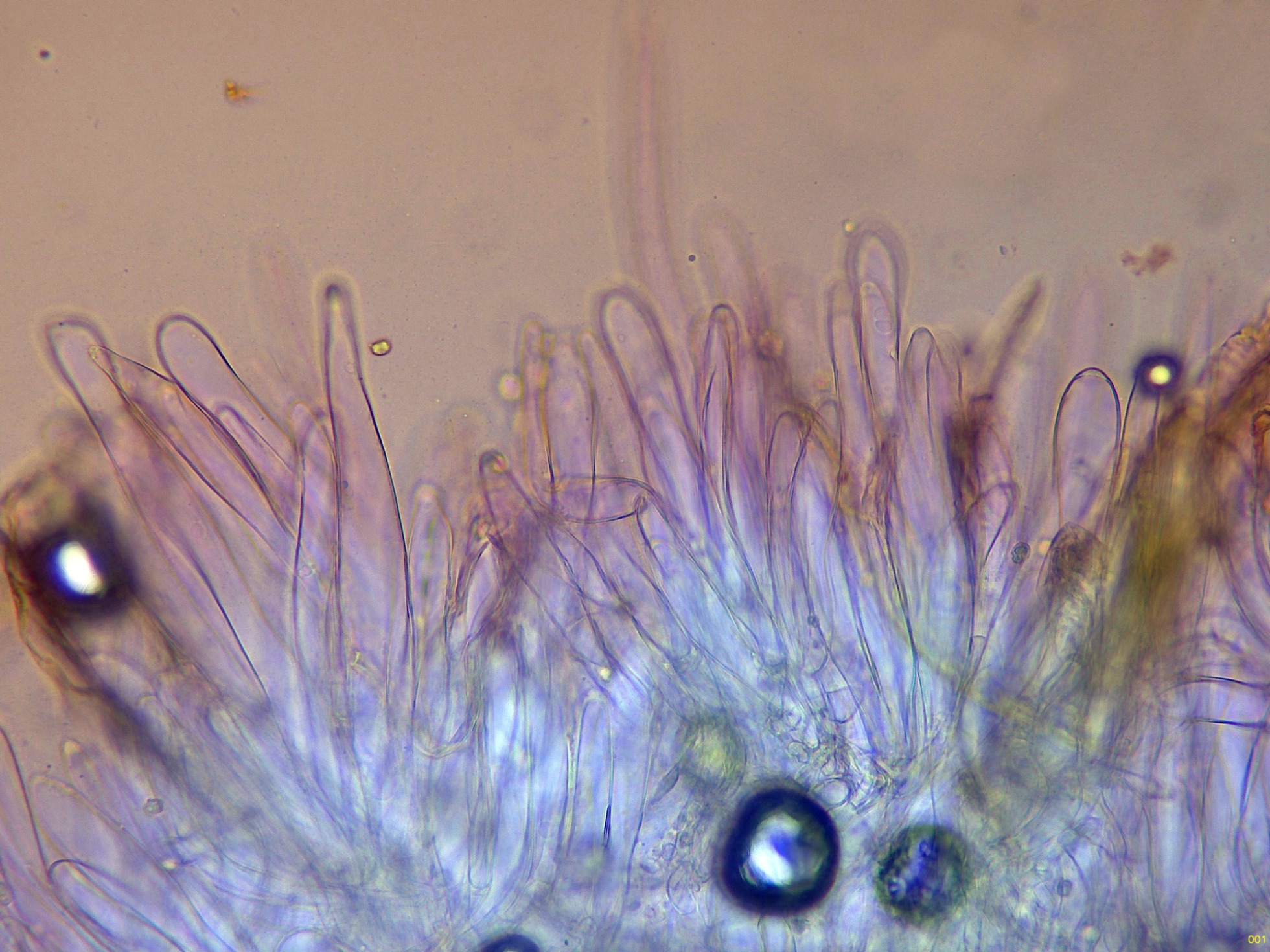 Para terminar con las microscopías, uno que aunque parecía brotar del suelo, lo hacía sobre un resto de tocón enterrado de pino, ya un poco desmejorada, tenemos la Tricholomopsis rutilans: