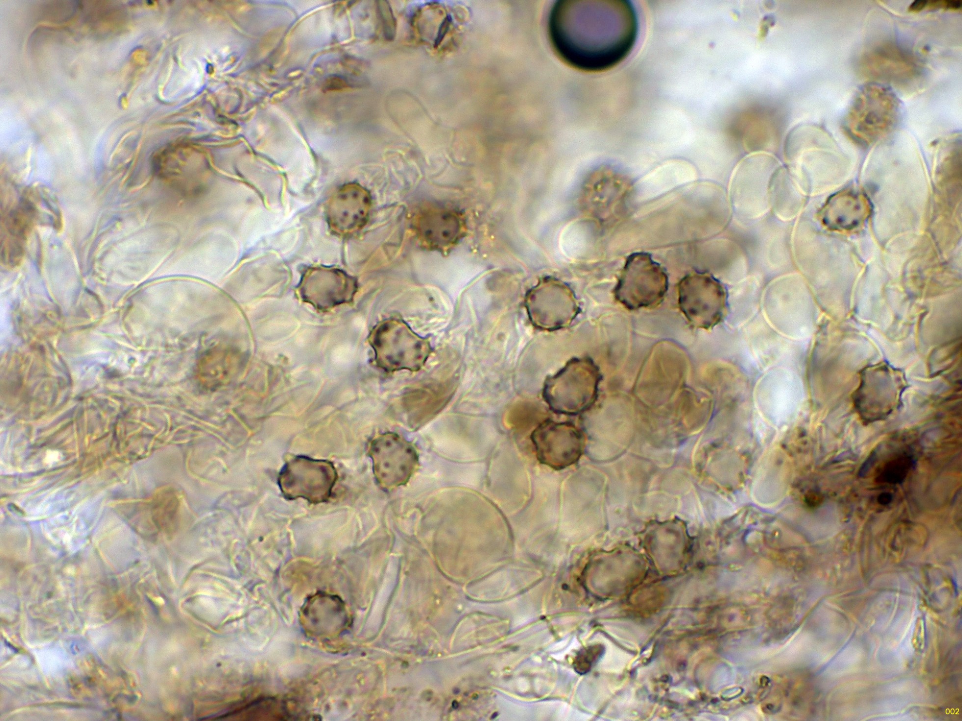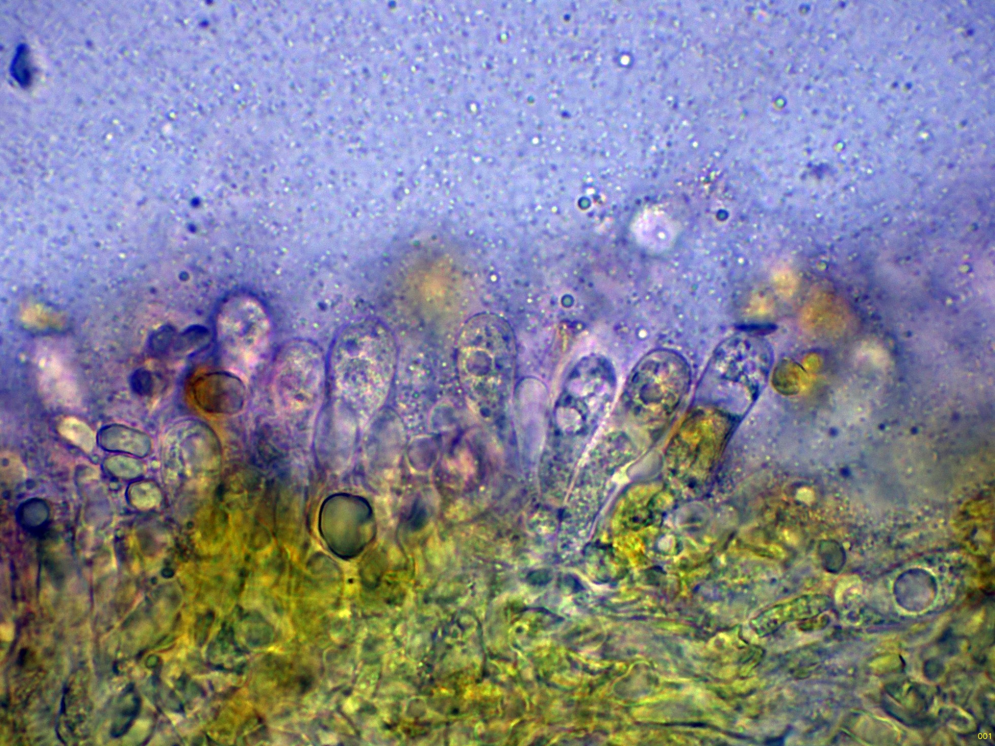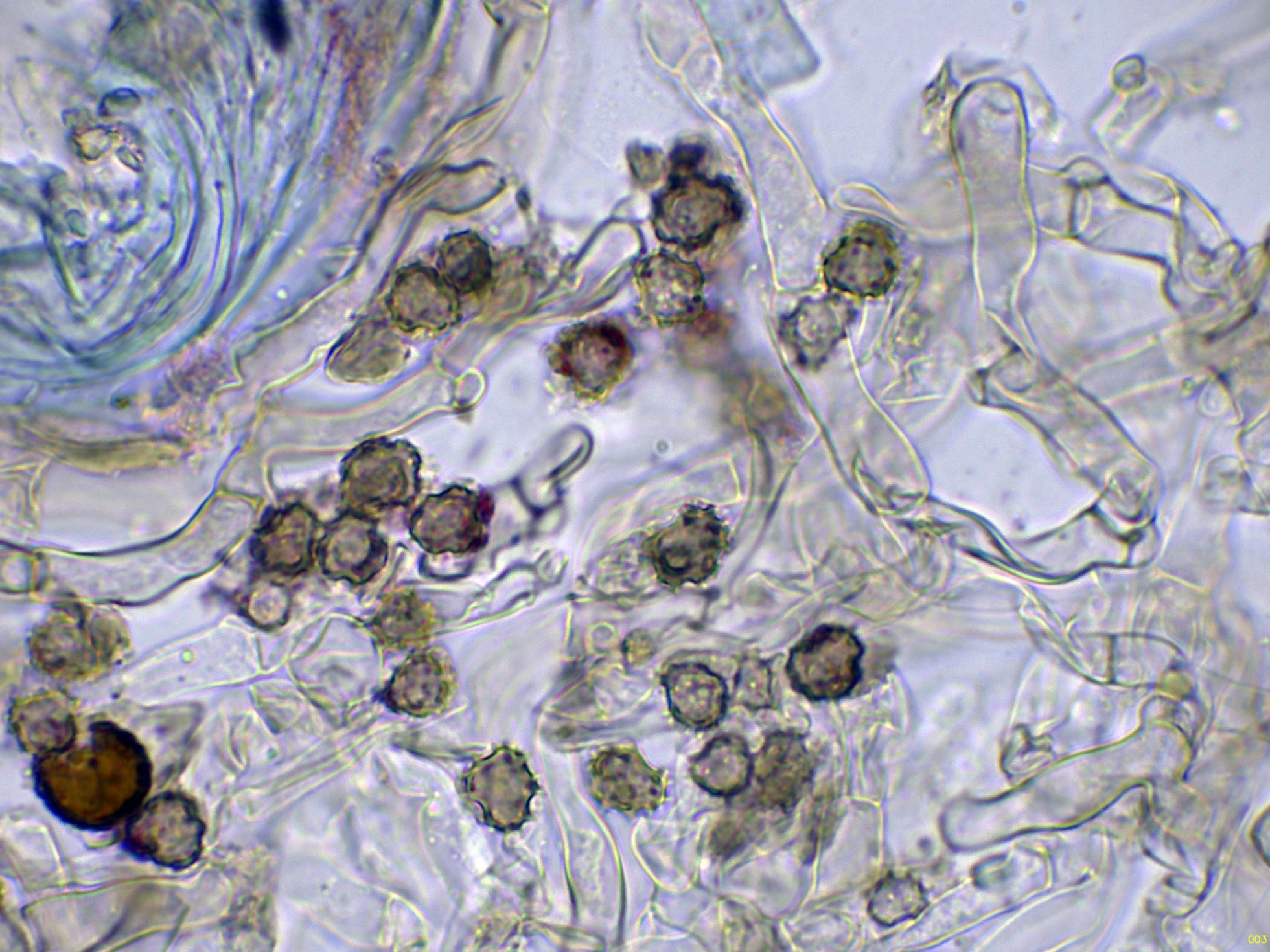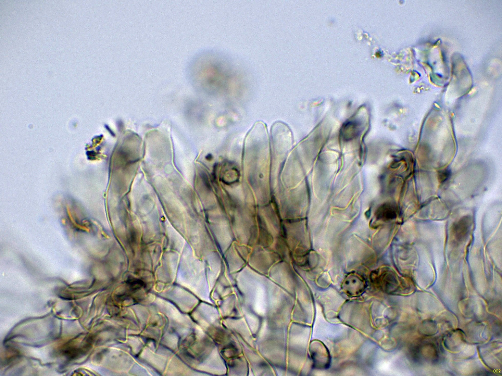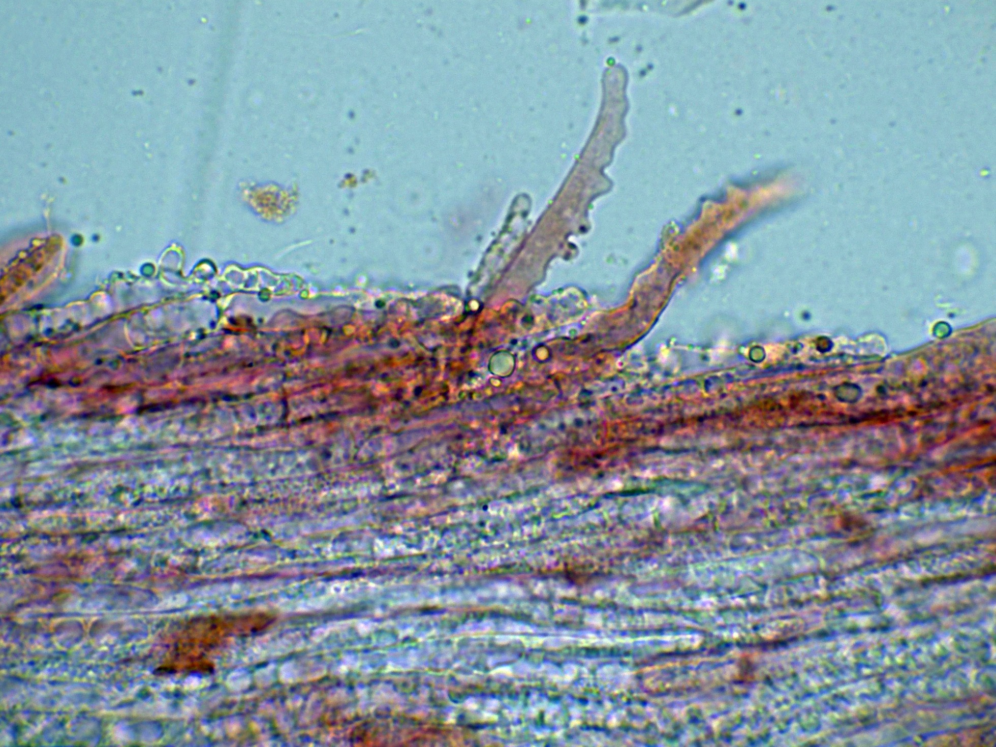 Para terminar con las microscopías, uno que aunque parecía brotar del suelo, lo hacía sobre un resto de tocón enterrado de pino, ya un poco desmejorada, tenemos la Tricholomopsis rutilans: