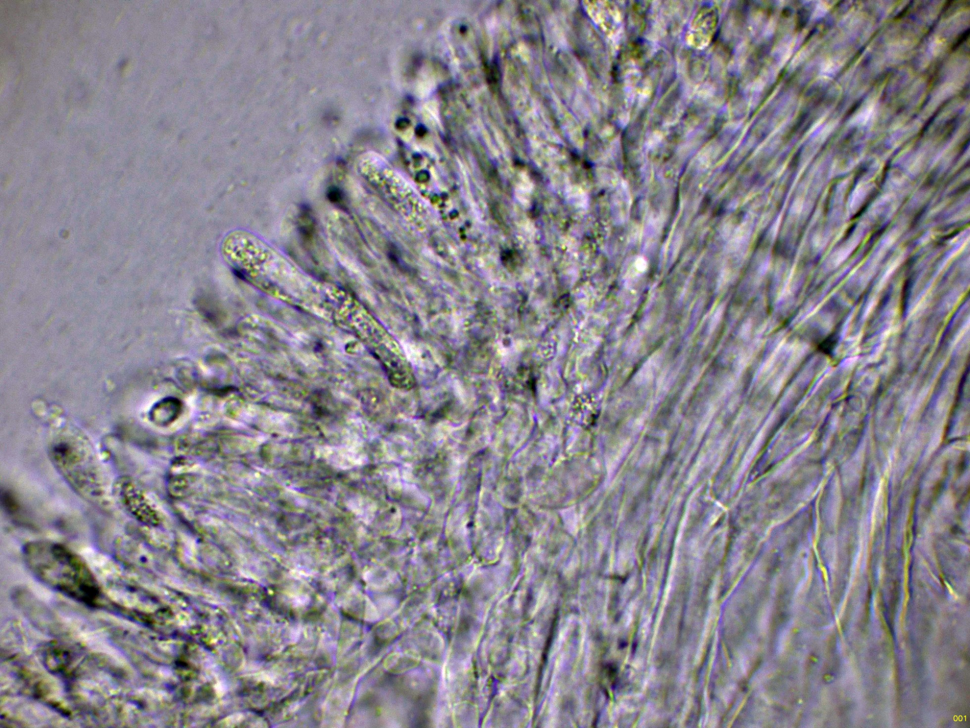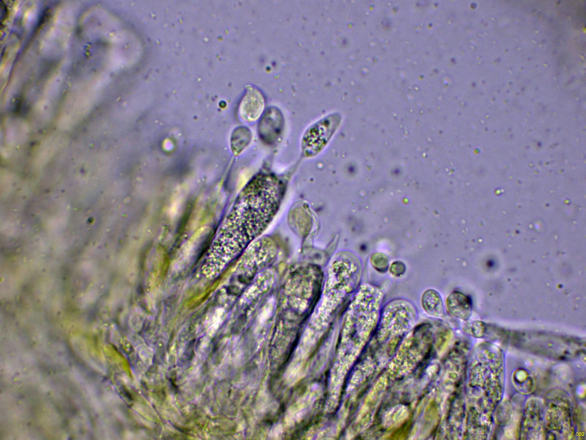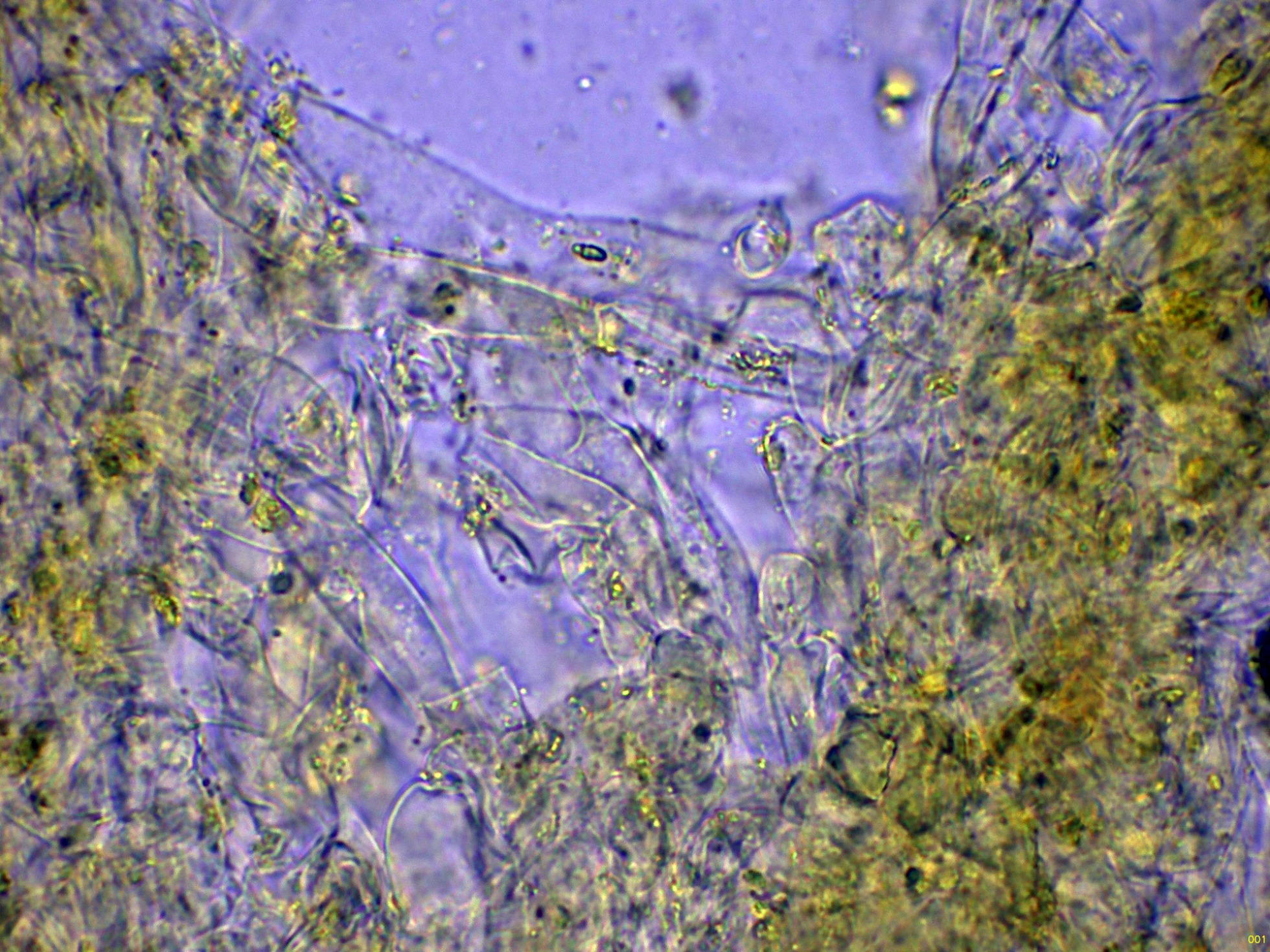 La trama laminar en amoníaco, el Tricholoma lascivum es uno de los pocos Tricholomas que pueden presentar algunas fíbulas: