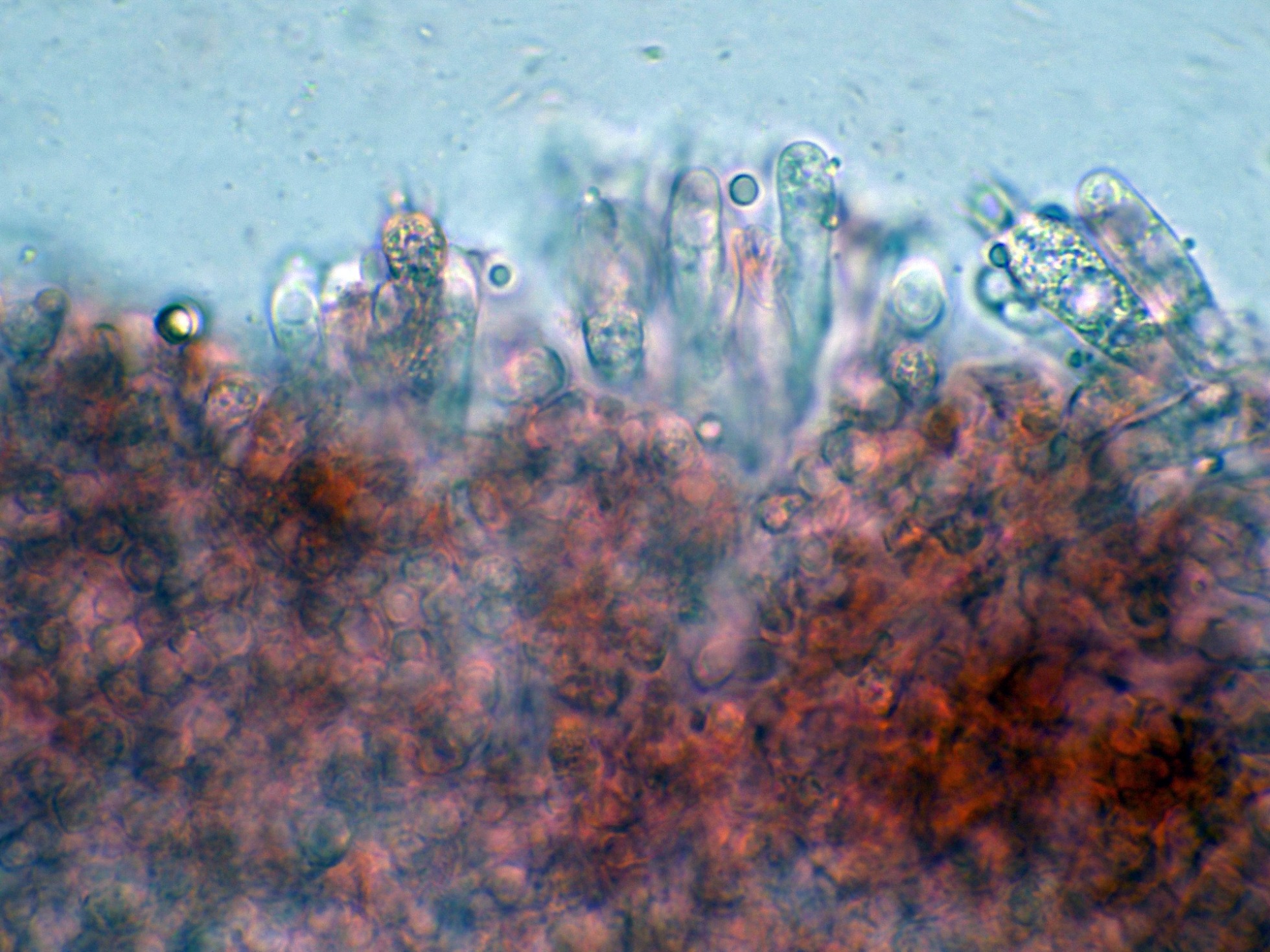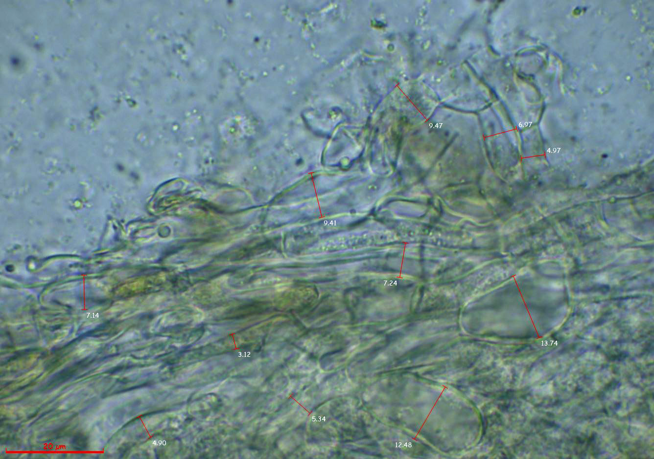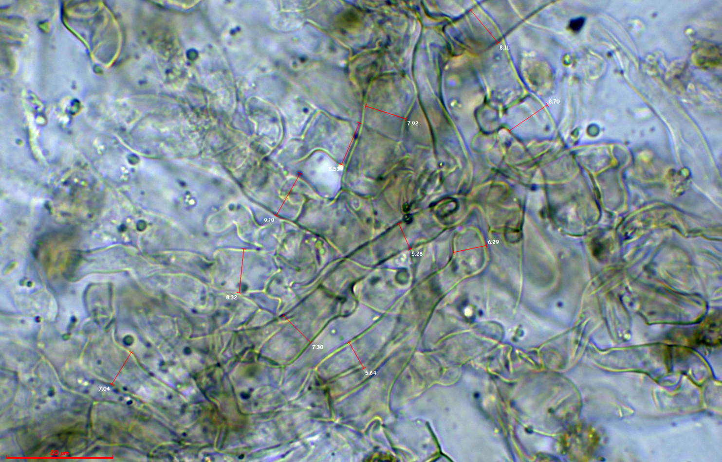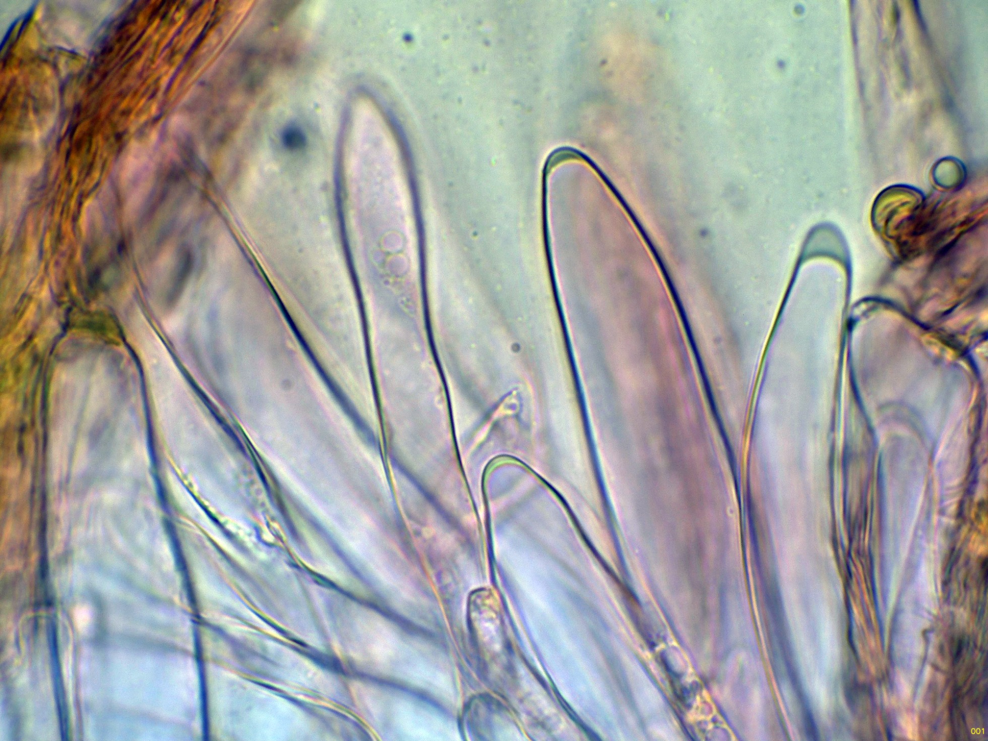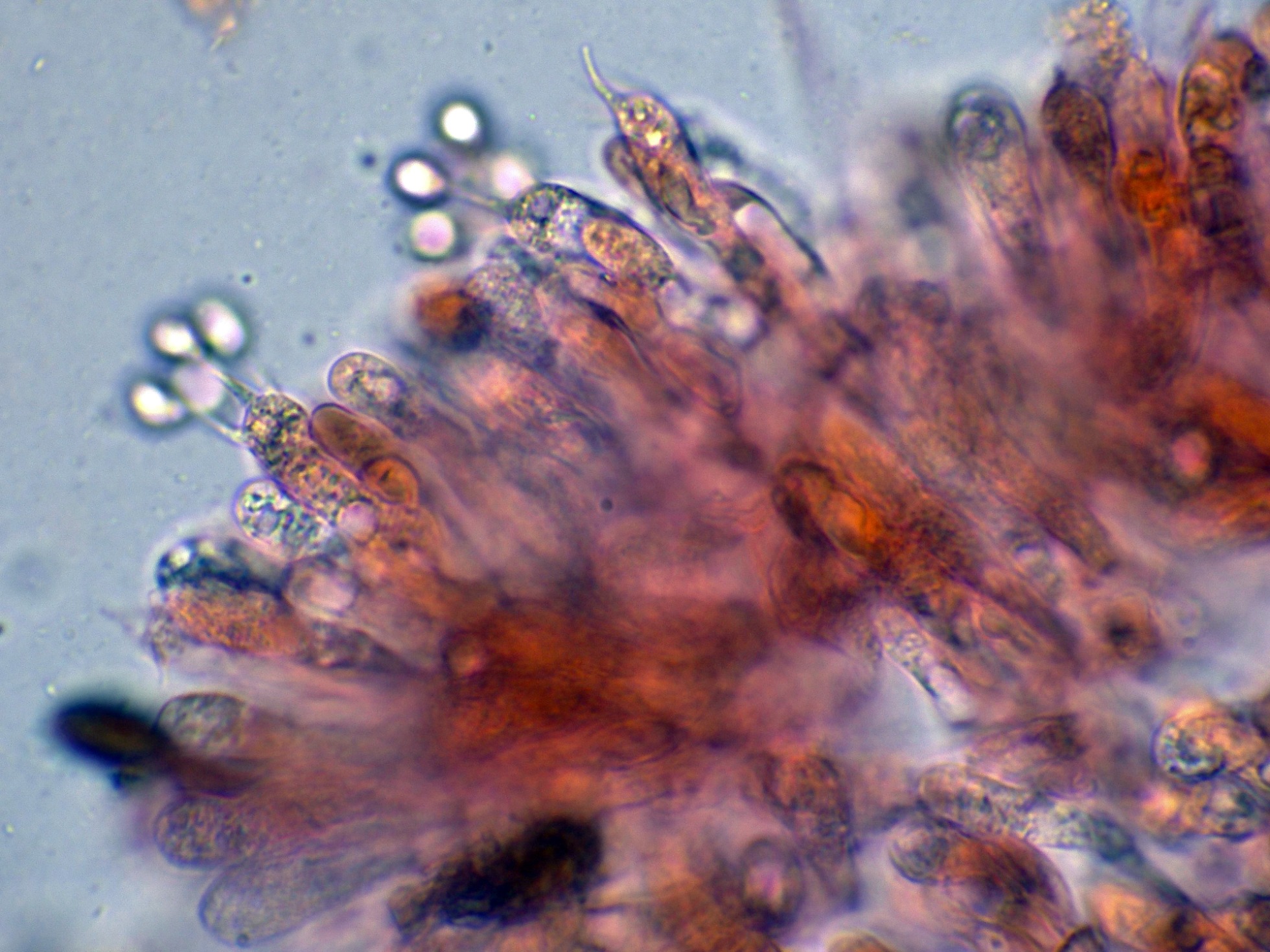 Los basidios de la cara laminar en solución de Rojo Congo, con unas medidas de (34.2) 35.6 - 45.6 (46.9) × (8) 8.5 - 10.5 (10.6) µm.