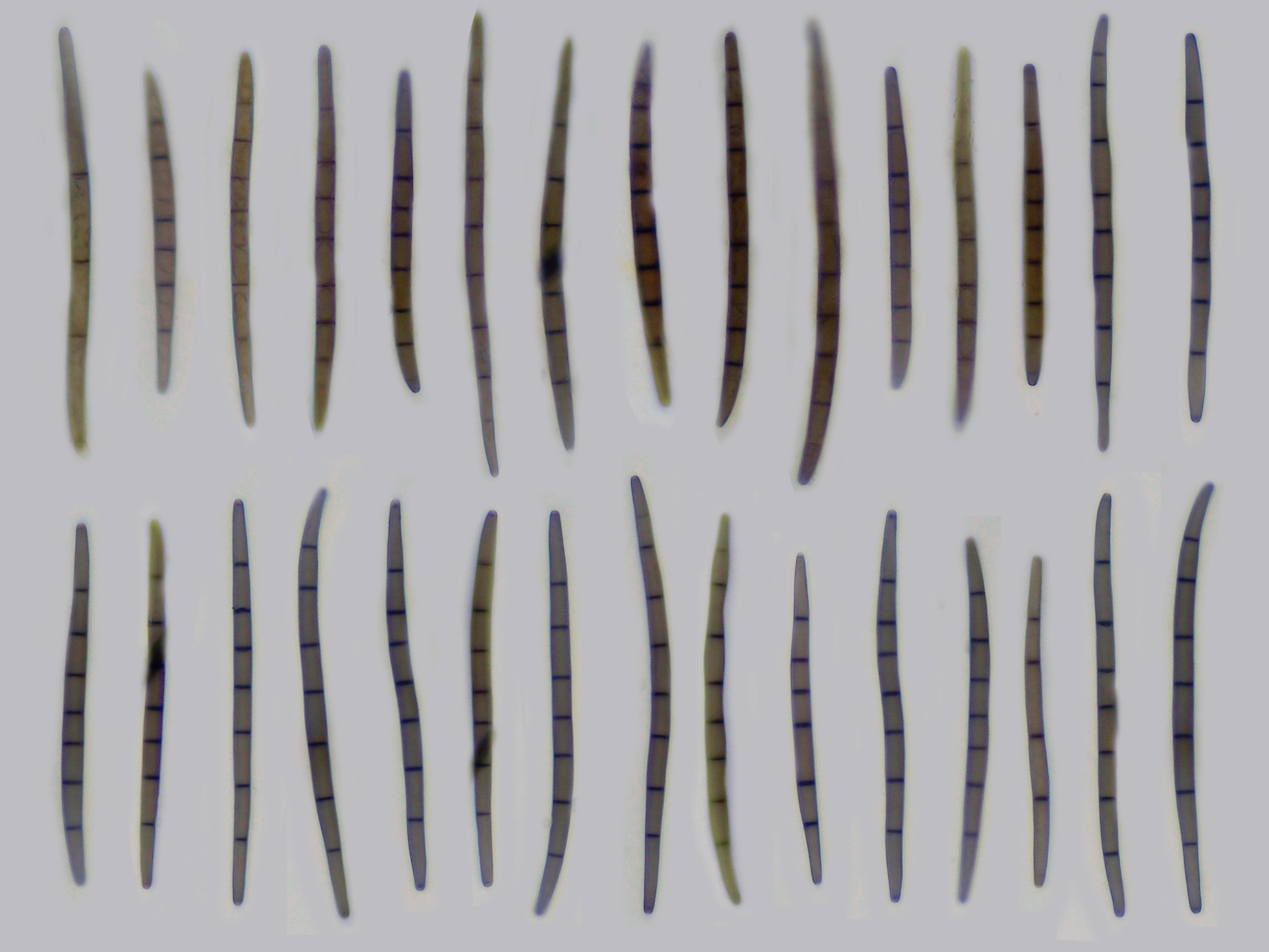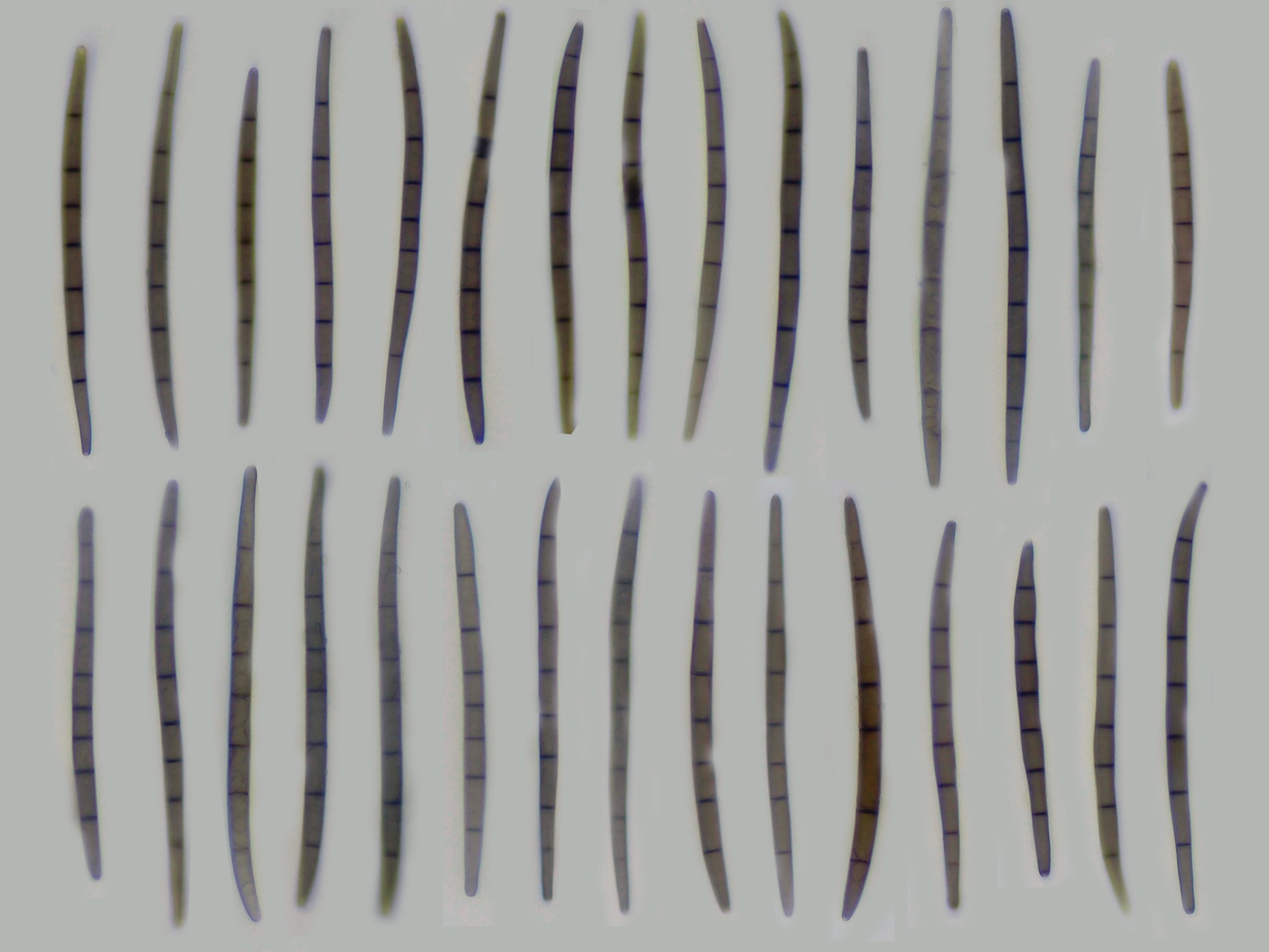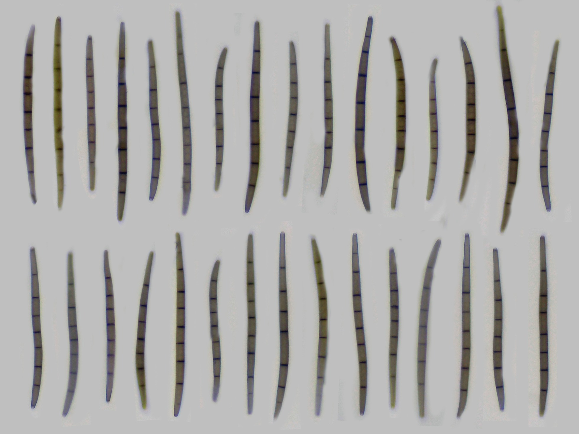 Se indica en la bibliografía que la especie puede llegar a presentar hasta 9 septos, añado una imágen en la parte de arriba con esporas de menos de 7 septos y en la parte de abajo con esporas de 8 a 9 septos: