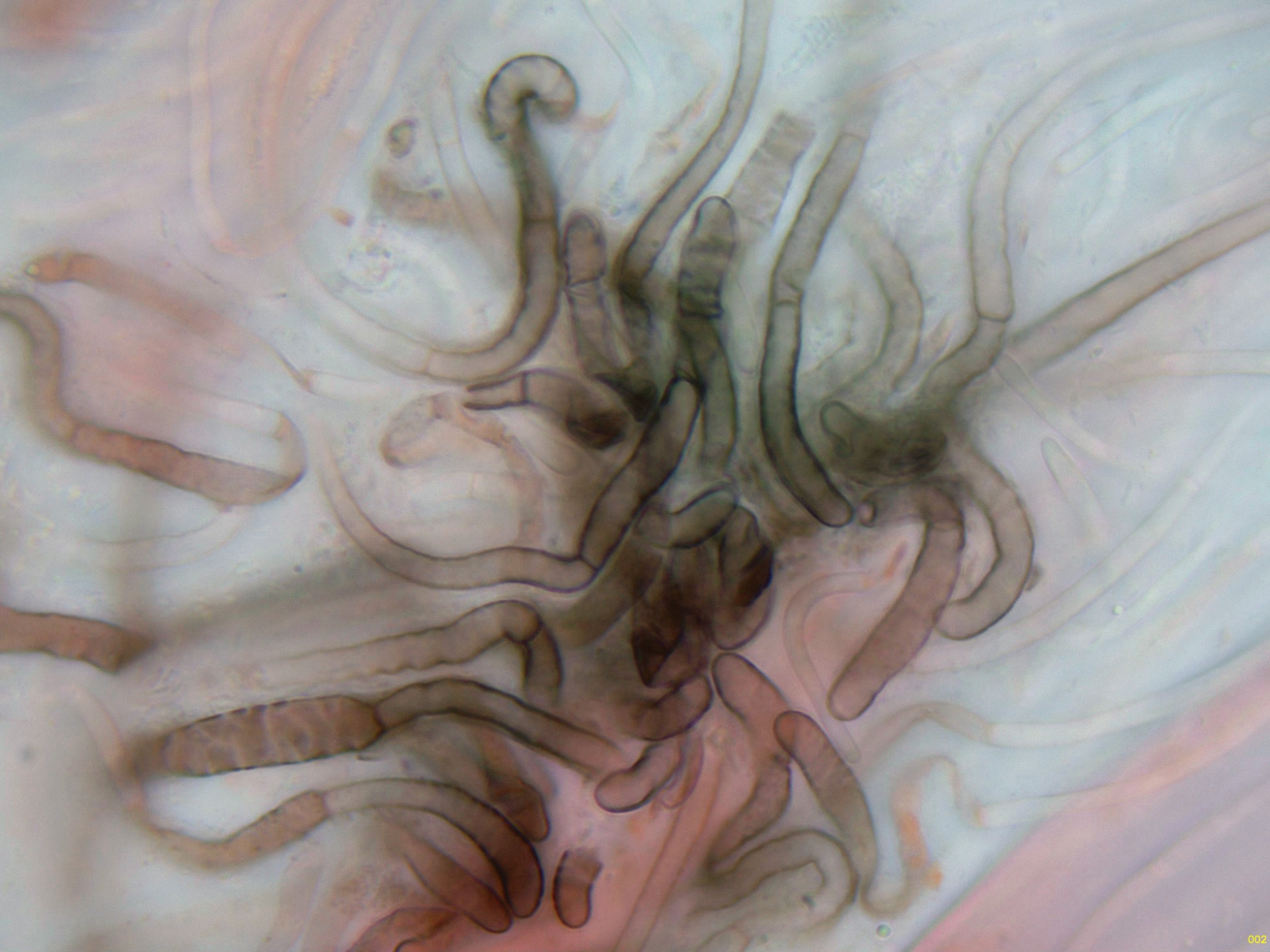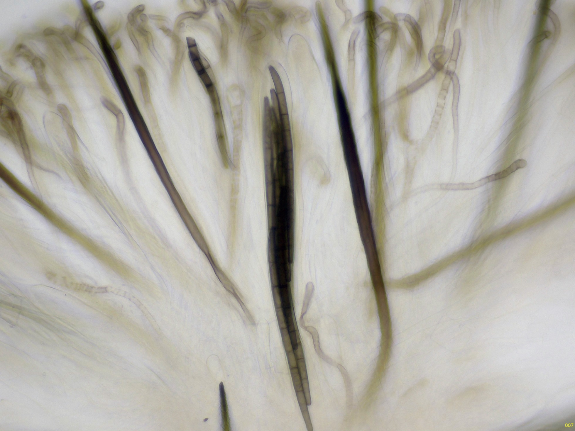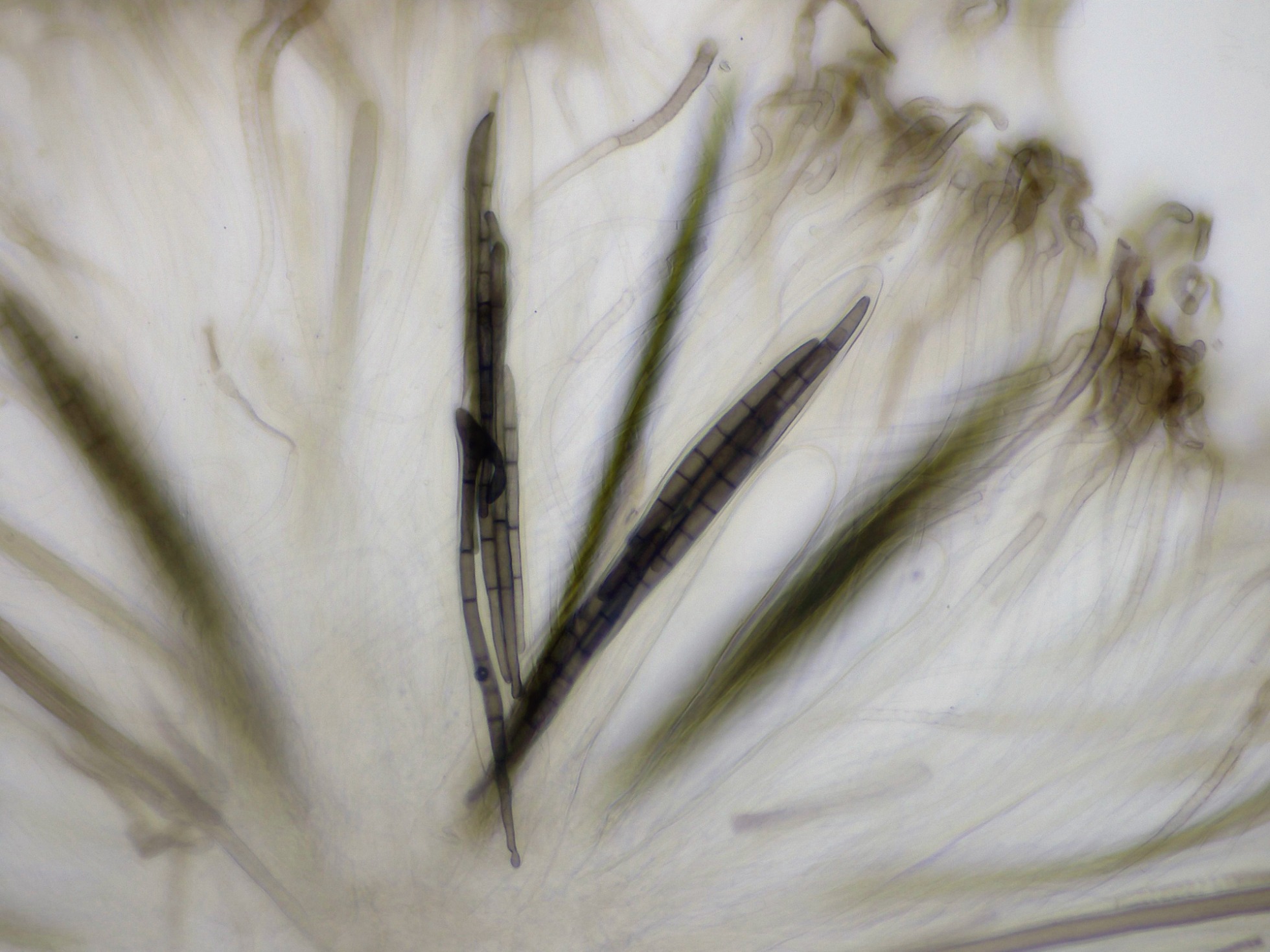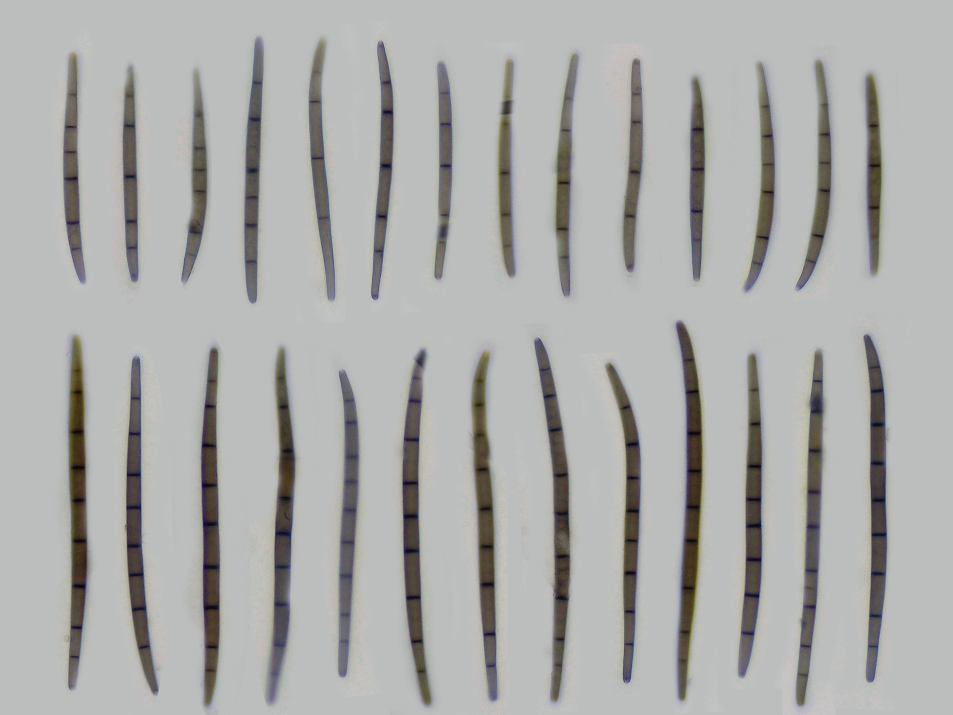 Se indica en la bibliografía que la especie puede llegar a presentar hasta 9 septos, añado una imágen en la parte de arriba con esporas de menos de 7 septos y en la parte de abajo con esporas de 8 a 9 septos: