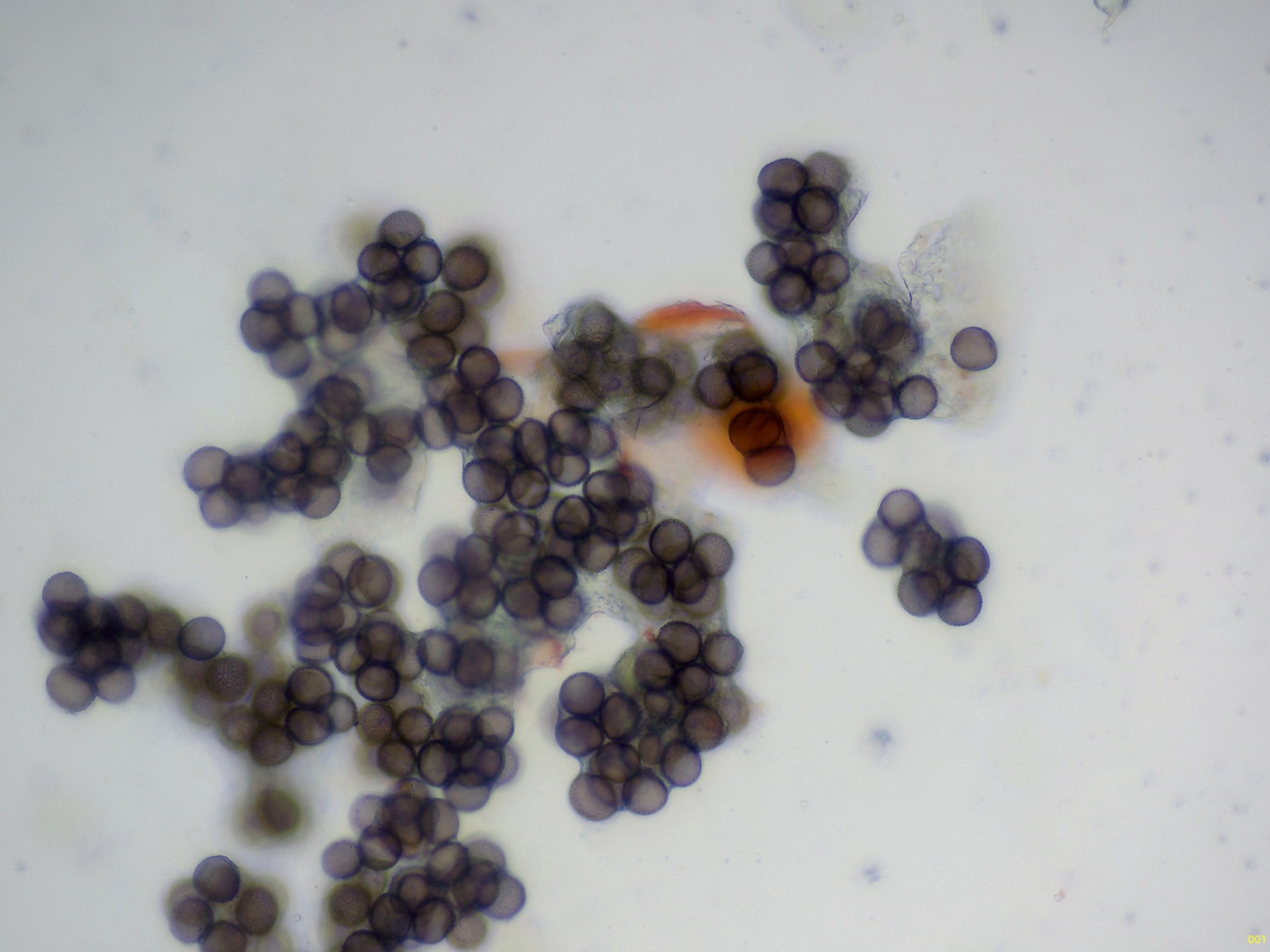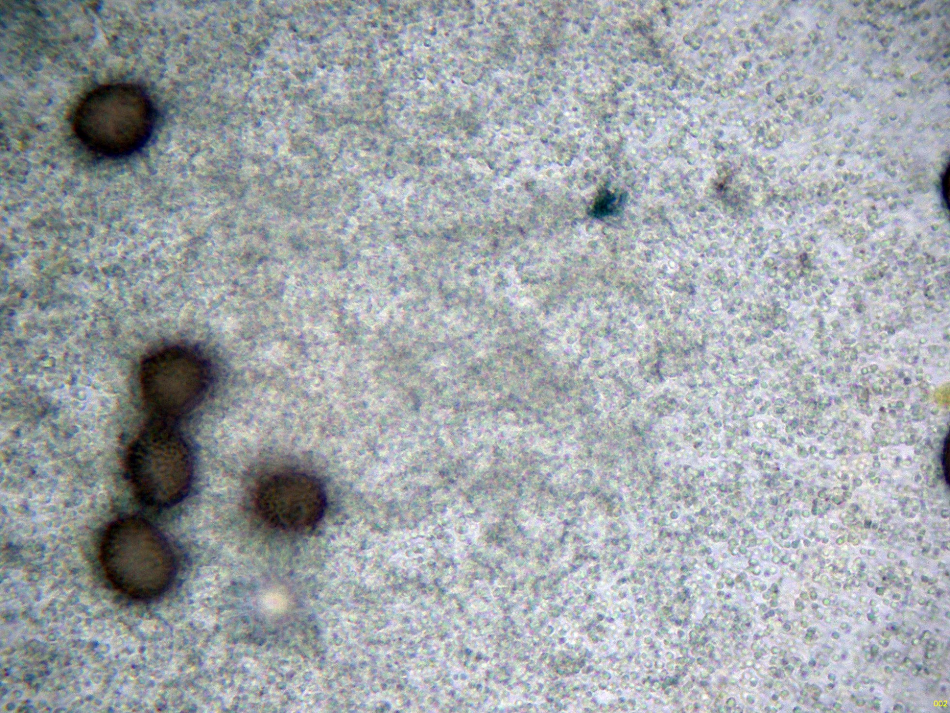 Esporas a 400 aumentos, agrupadas en grupos de entre 4 a 20 esporas: