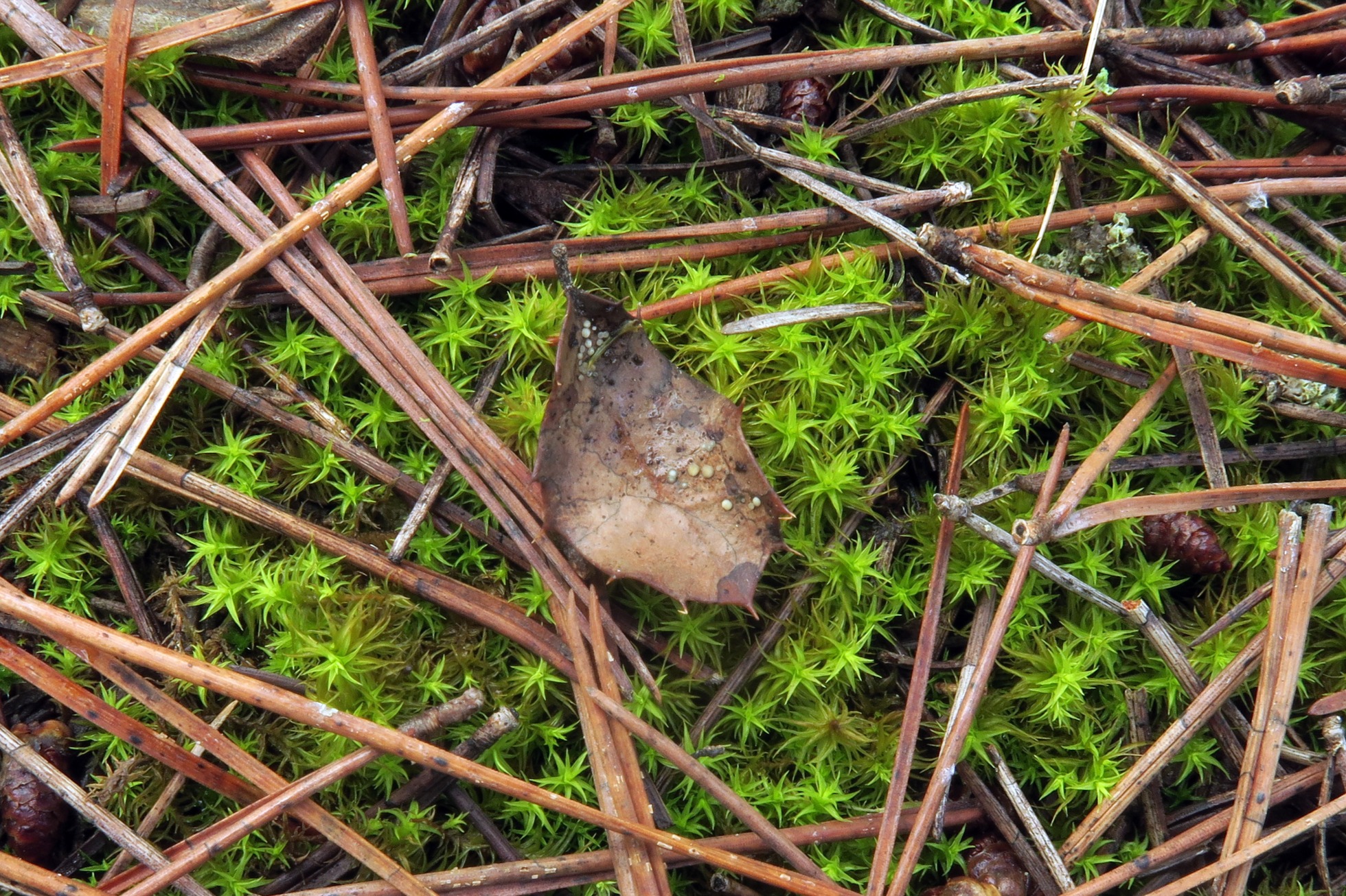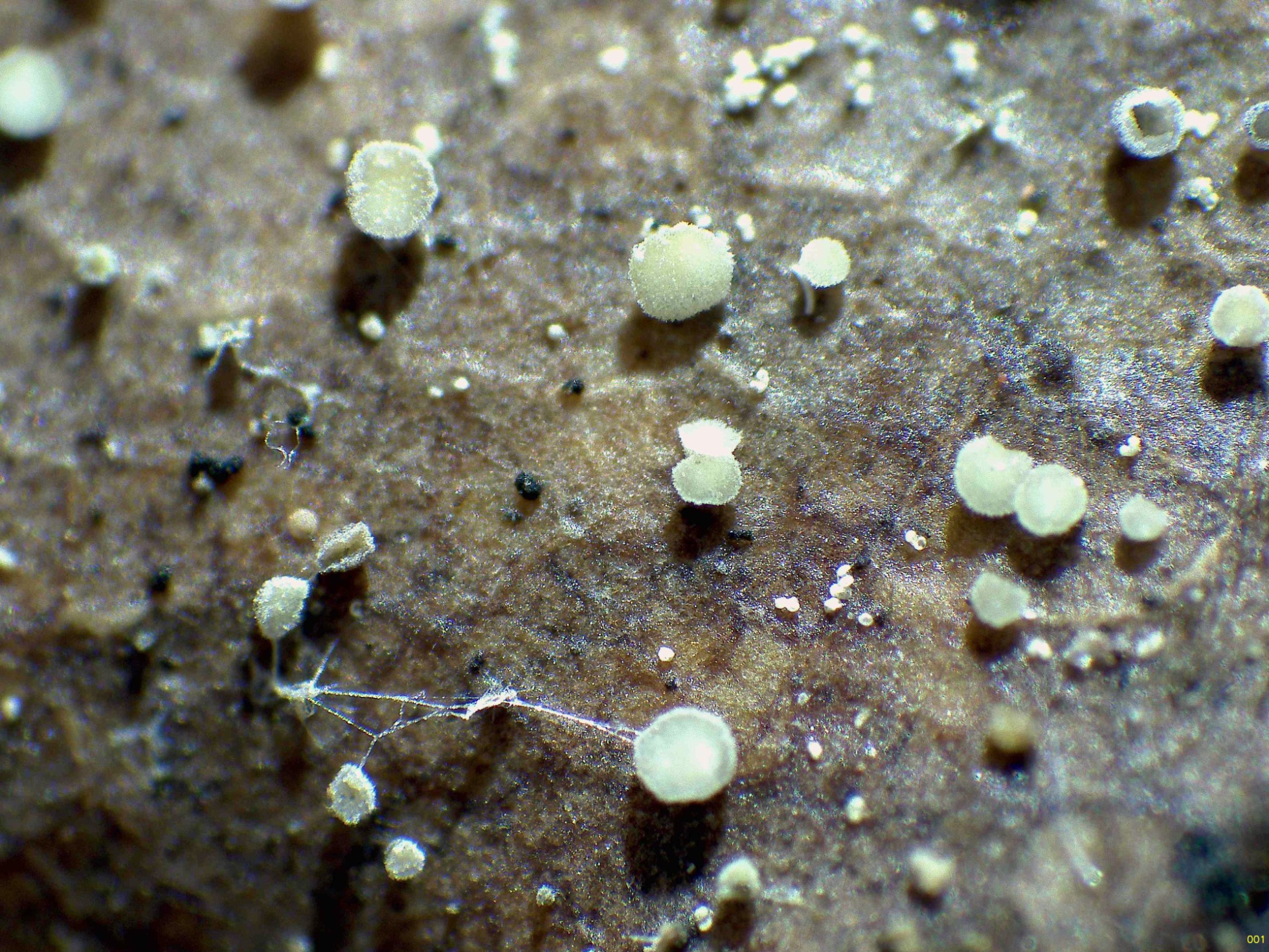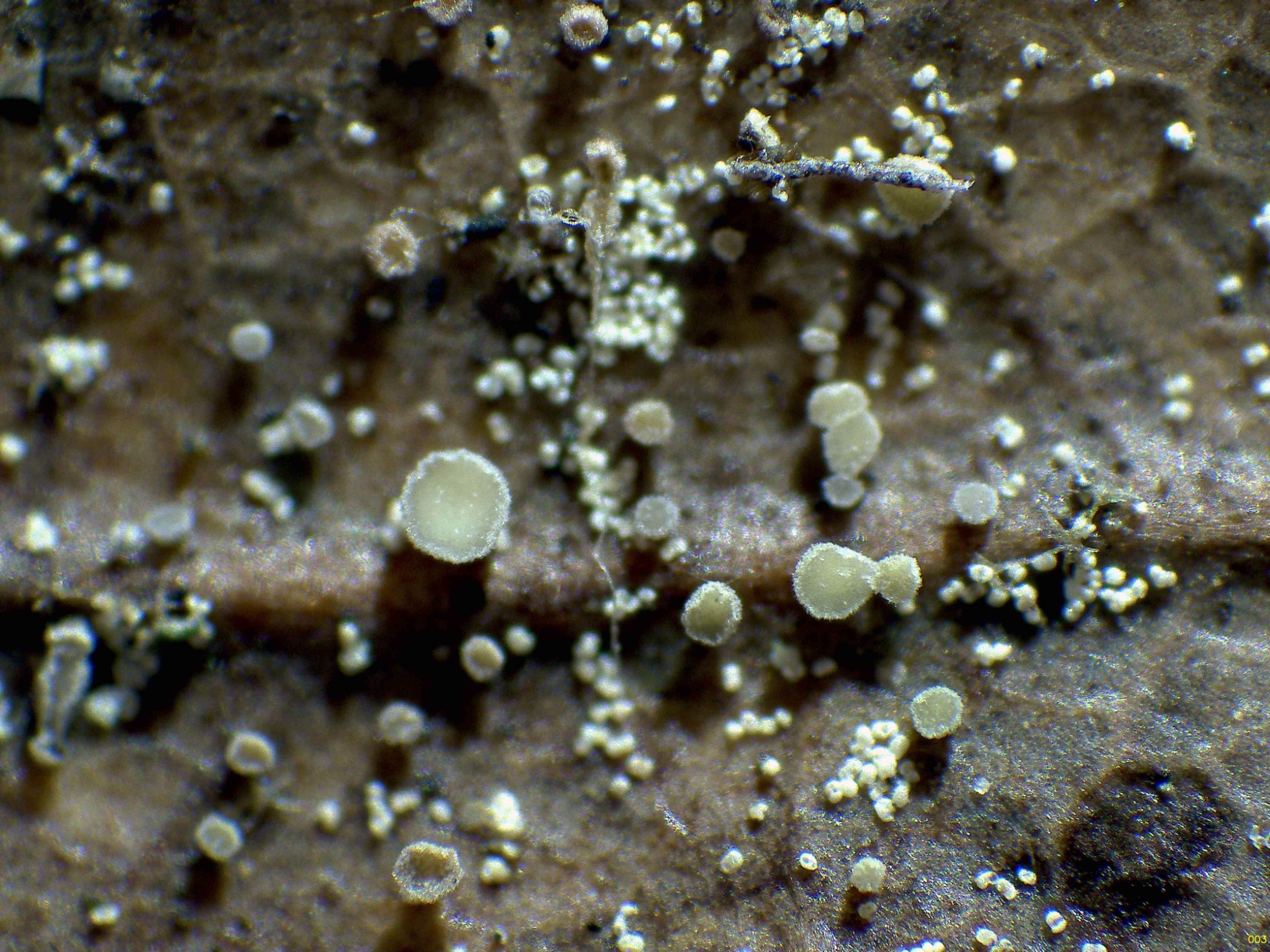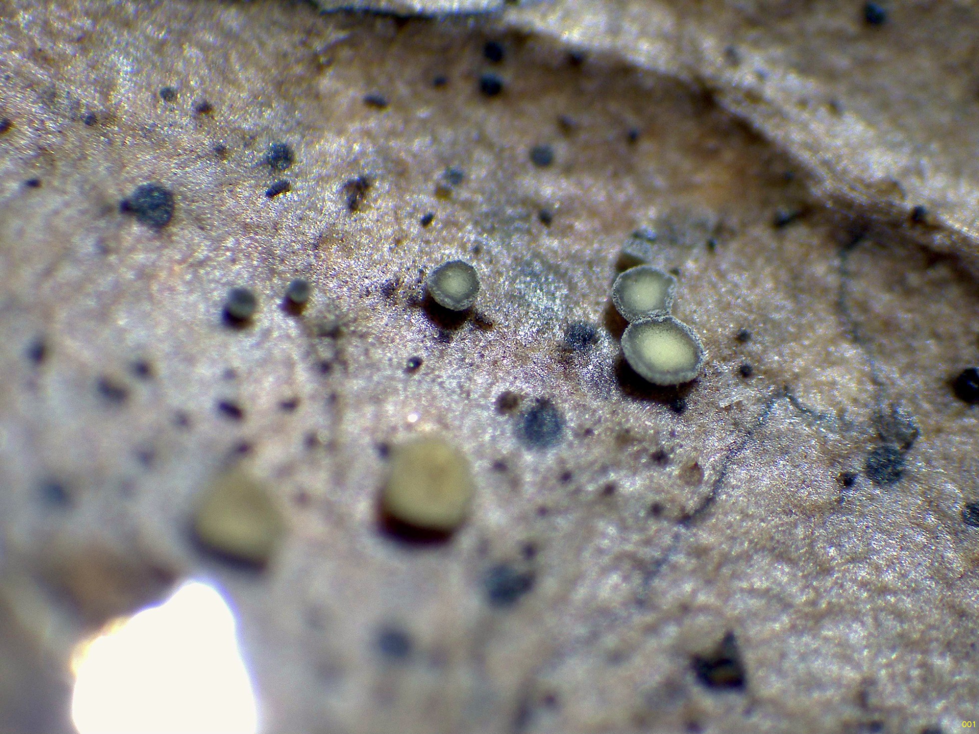 Ascomas muy diminutos, amarillentos, con peciolos muy cortos y rudimentarios, verdosos en ejemplares maduros, que brotan de la superficie de hojas del suelo en descomposición de Quercus rotundifolia.