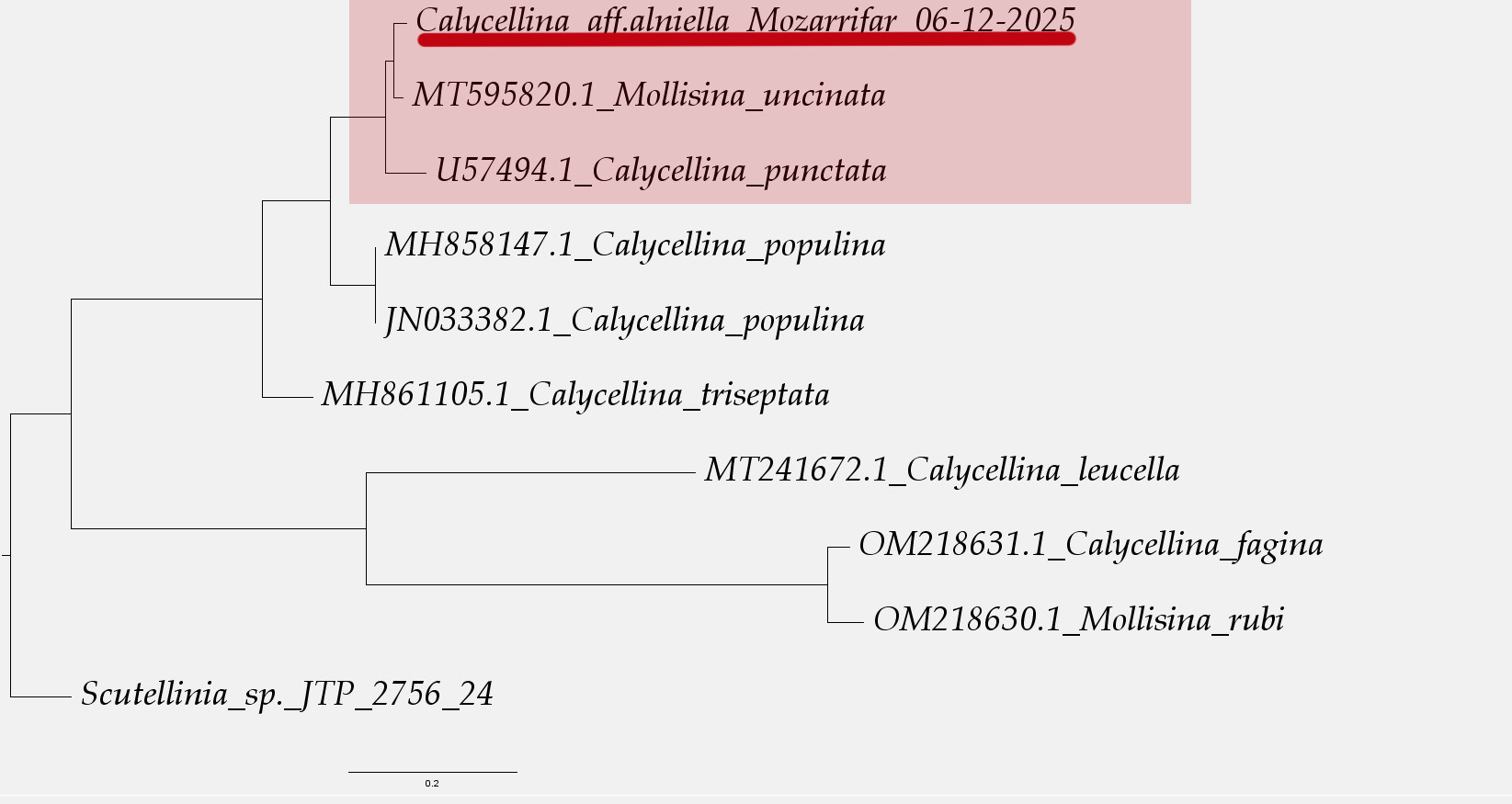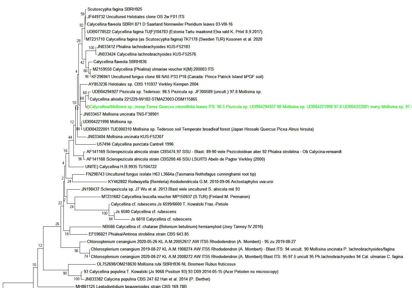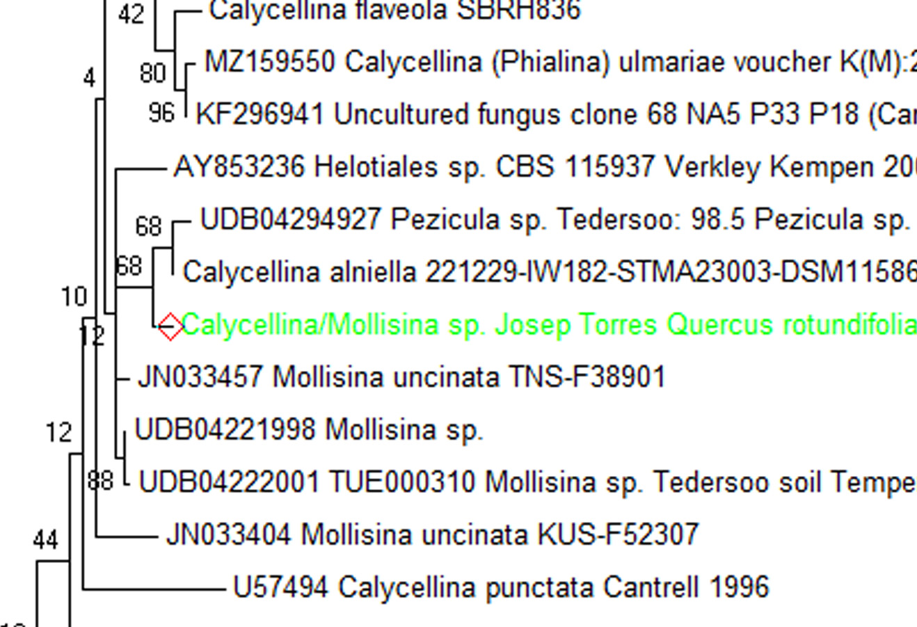 En este estudio el análisis molecular solo sirvió para poder acercar a la especie a un género determinado, como que en el Blast apuntaba a géneros como Calycellina o Mollisina, es por lo que decidí elaborar un árbol filogenético utilizando secuencias de todas las especies de que disponemos de ambos géneros en GenBank, dejo el resultado:
