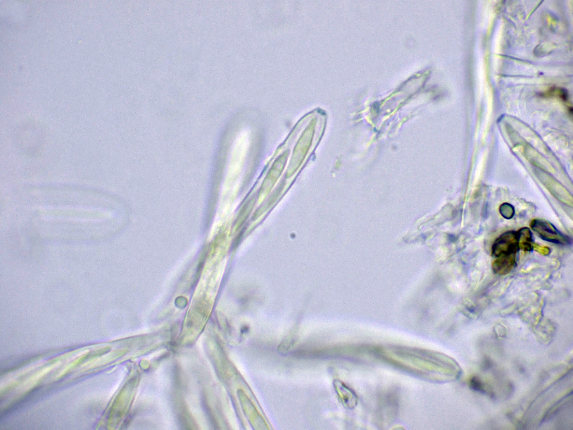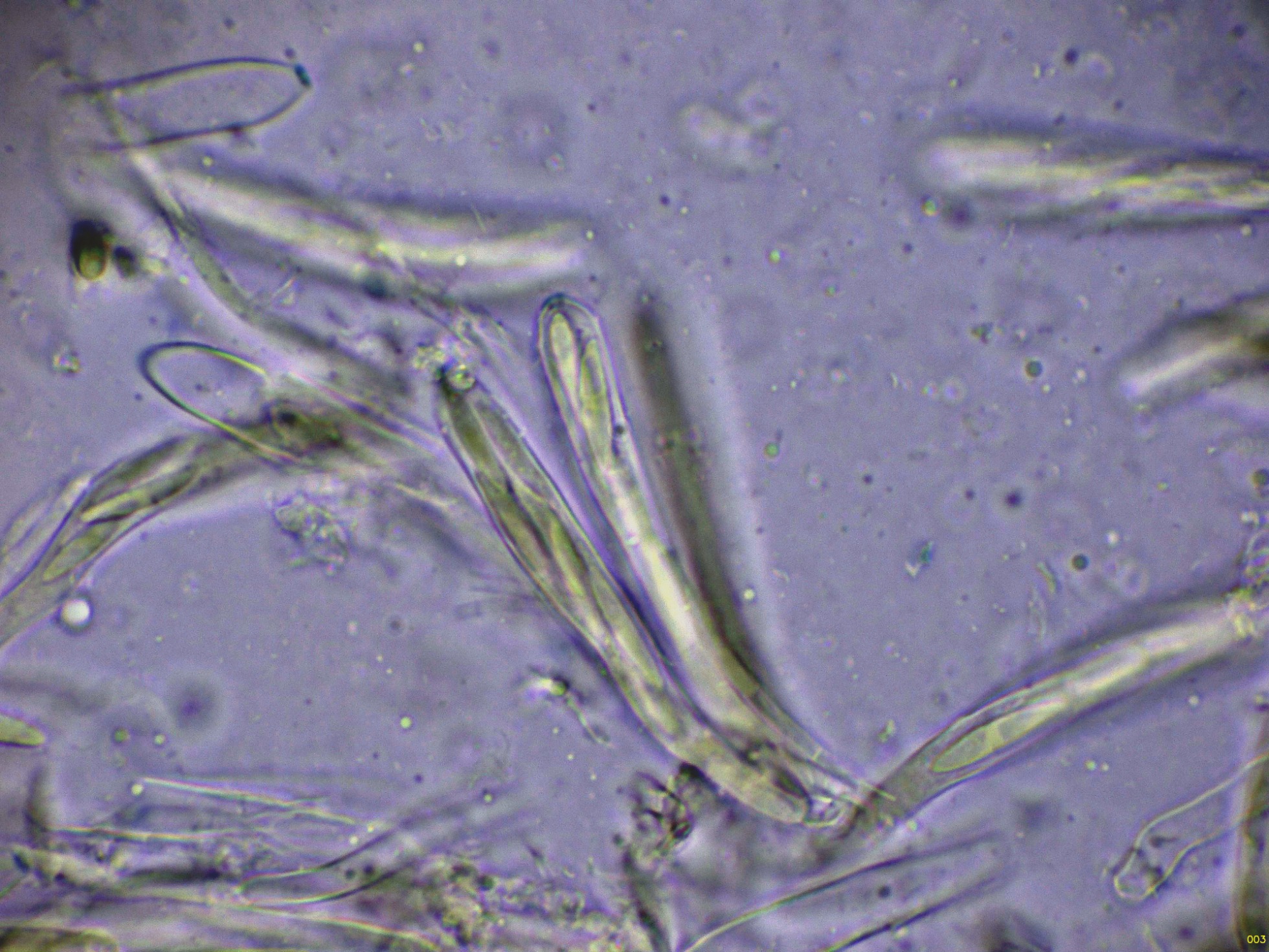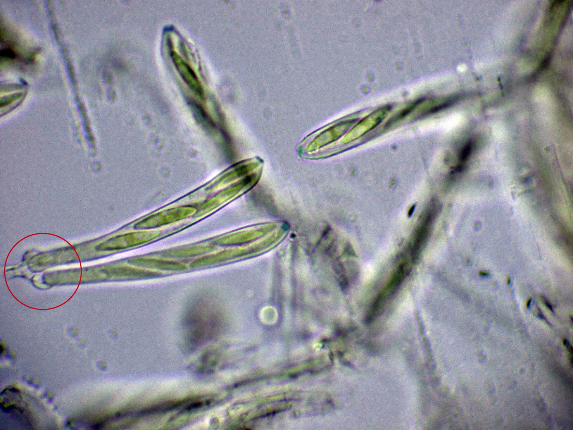 Ascos octosporóricos, con una reacción amiloide de su diminuto aparato apical, y aunque es difícil observarlos en algunos de estos ascos, me pareció ver uncínulos.