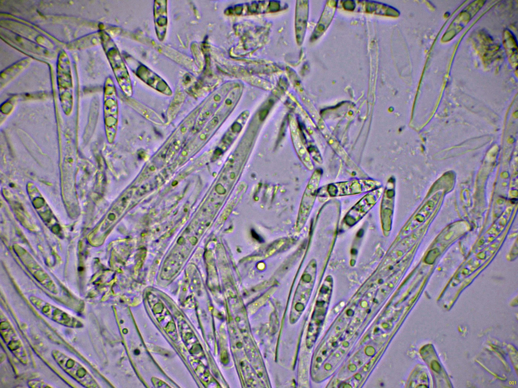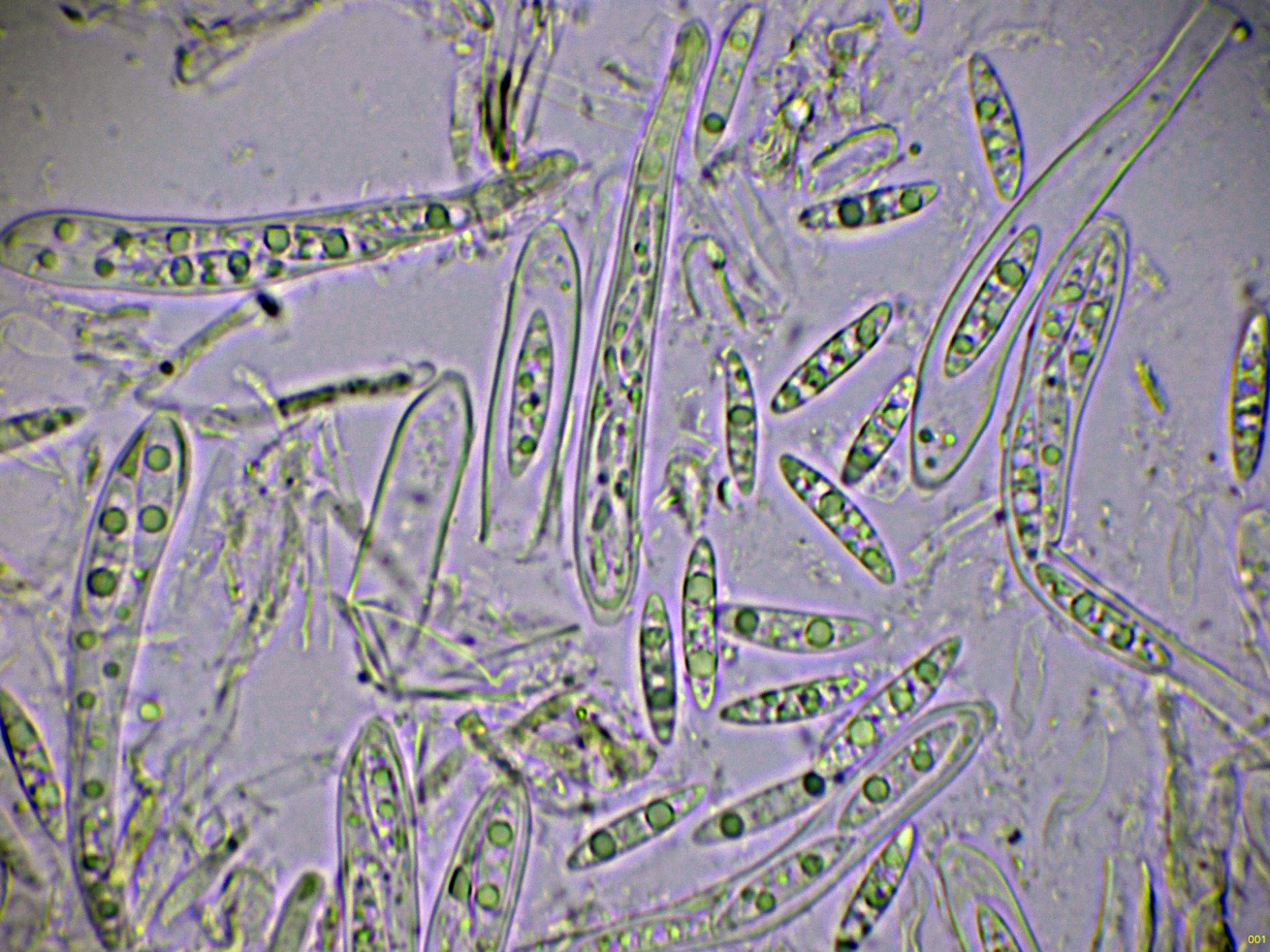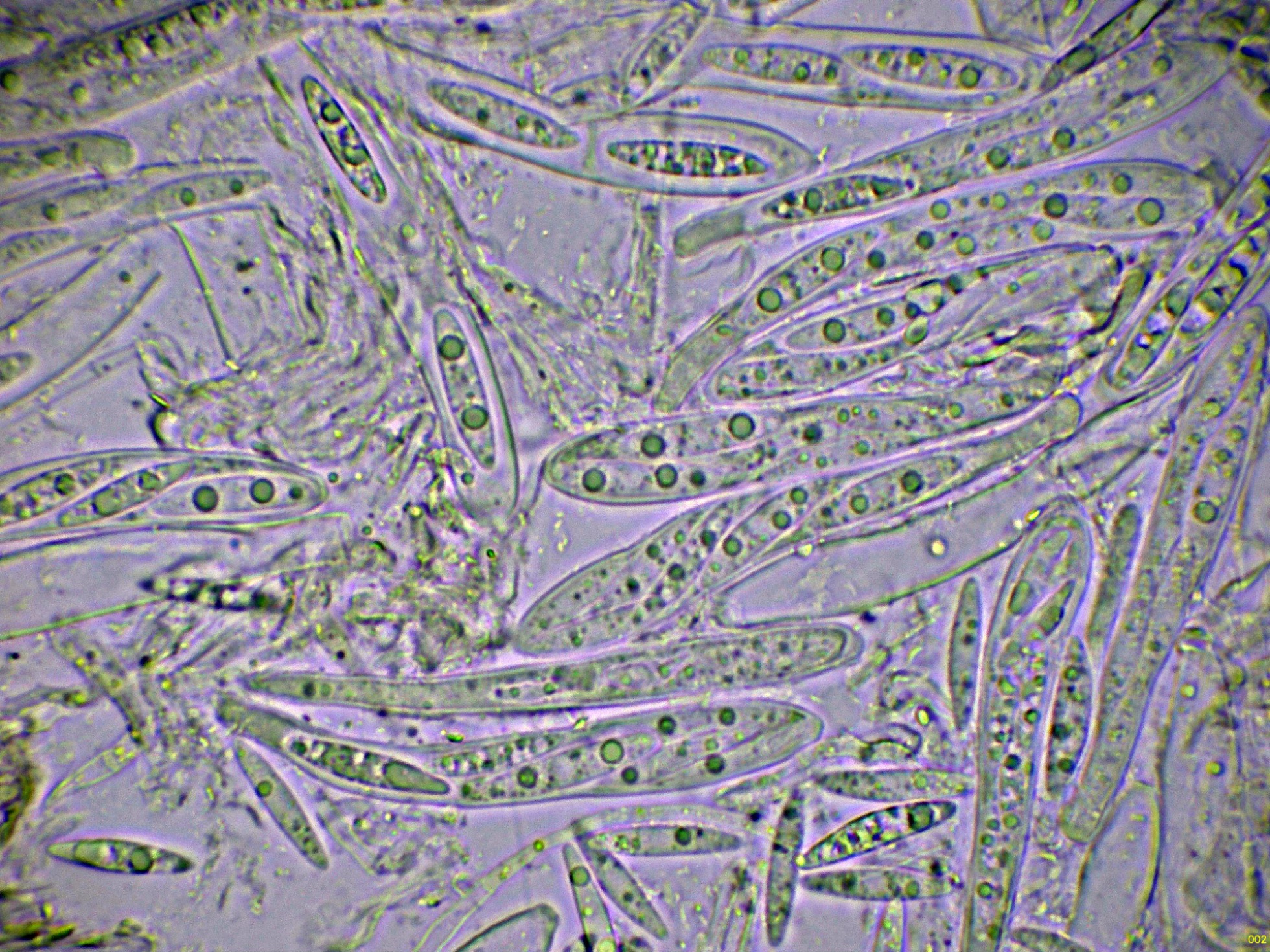 Ascosporas fusiformes con extremos puntiagudos, dos o tres gotas lipídicas grandes y varias más pequeñas dispersas, con unas medidas de estas ascosporas libres en agua de: