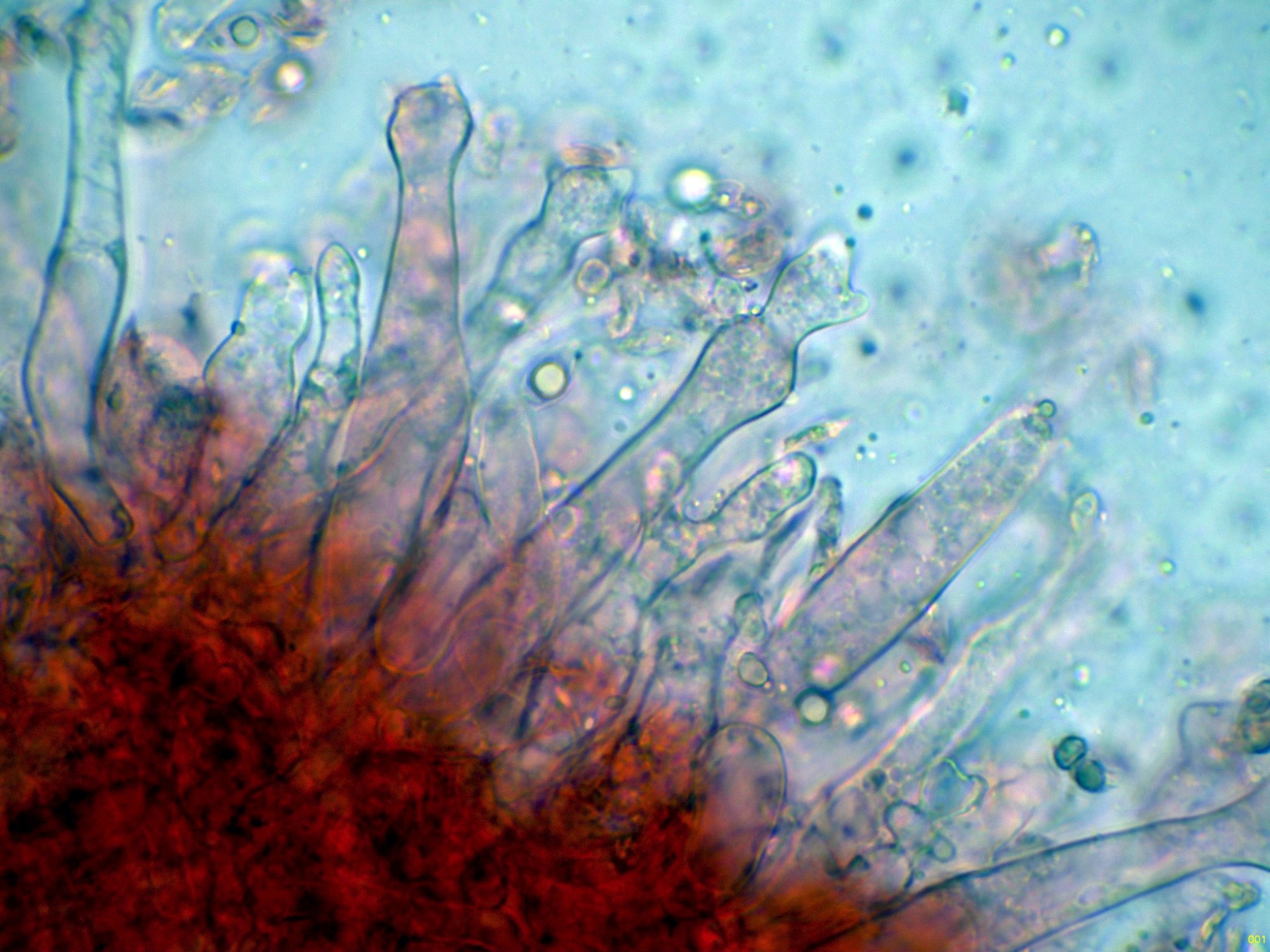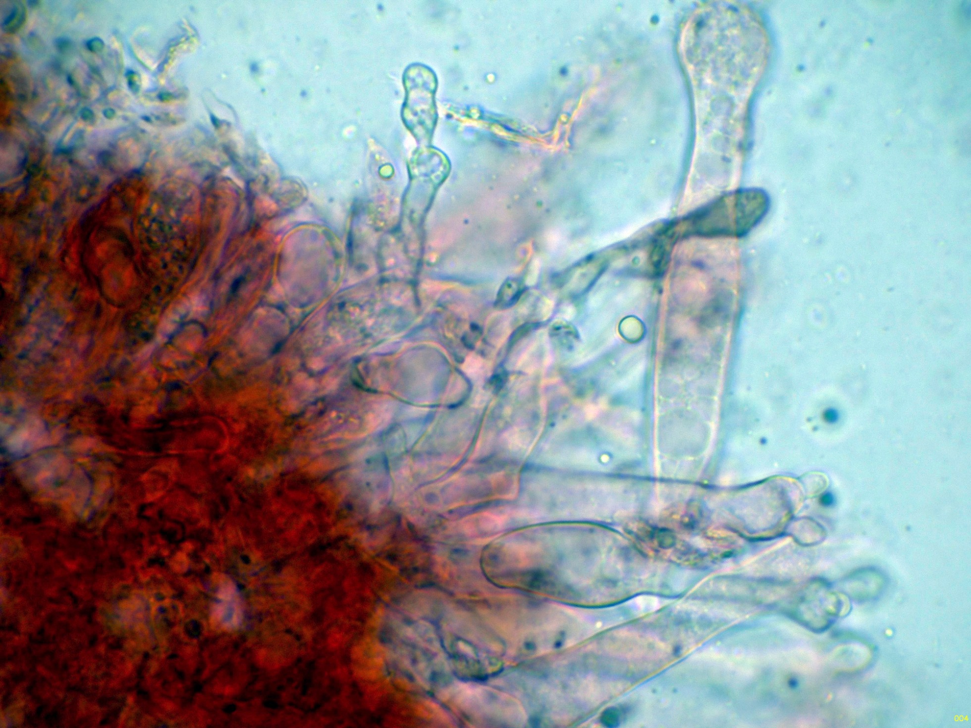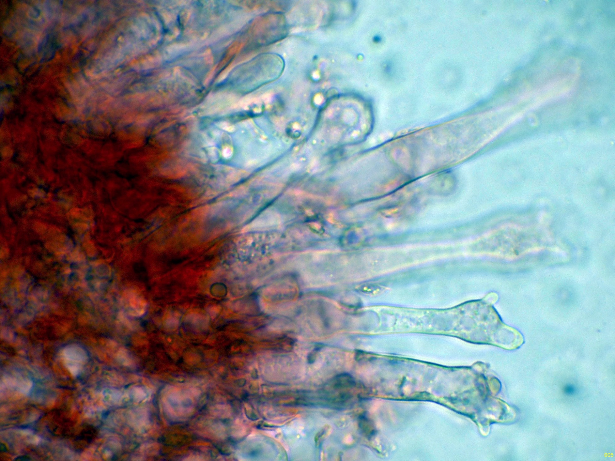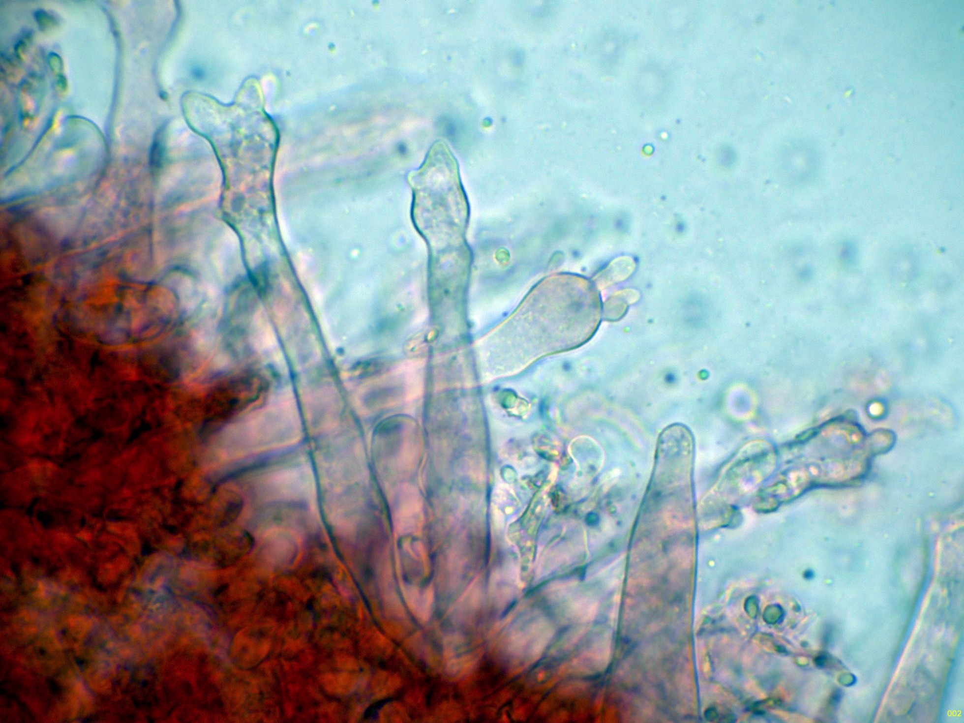 Los queilocistidios, cilíndricos, sinuosos, muchos de ellos incluso capitados y con digitaciones gruesas abundantes.