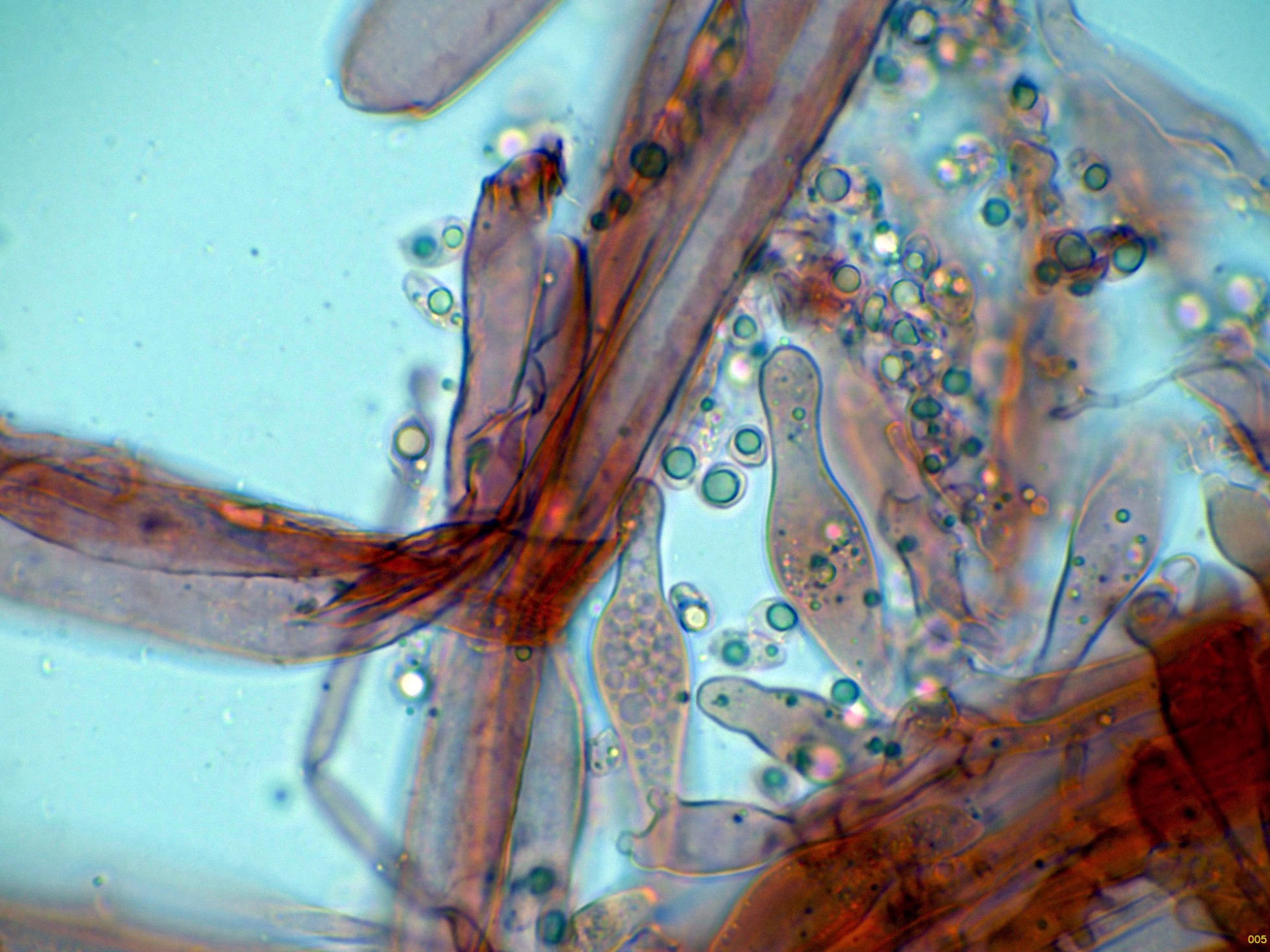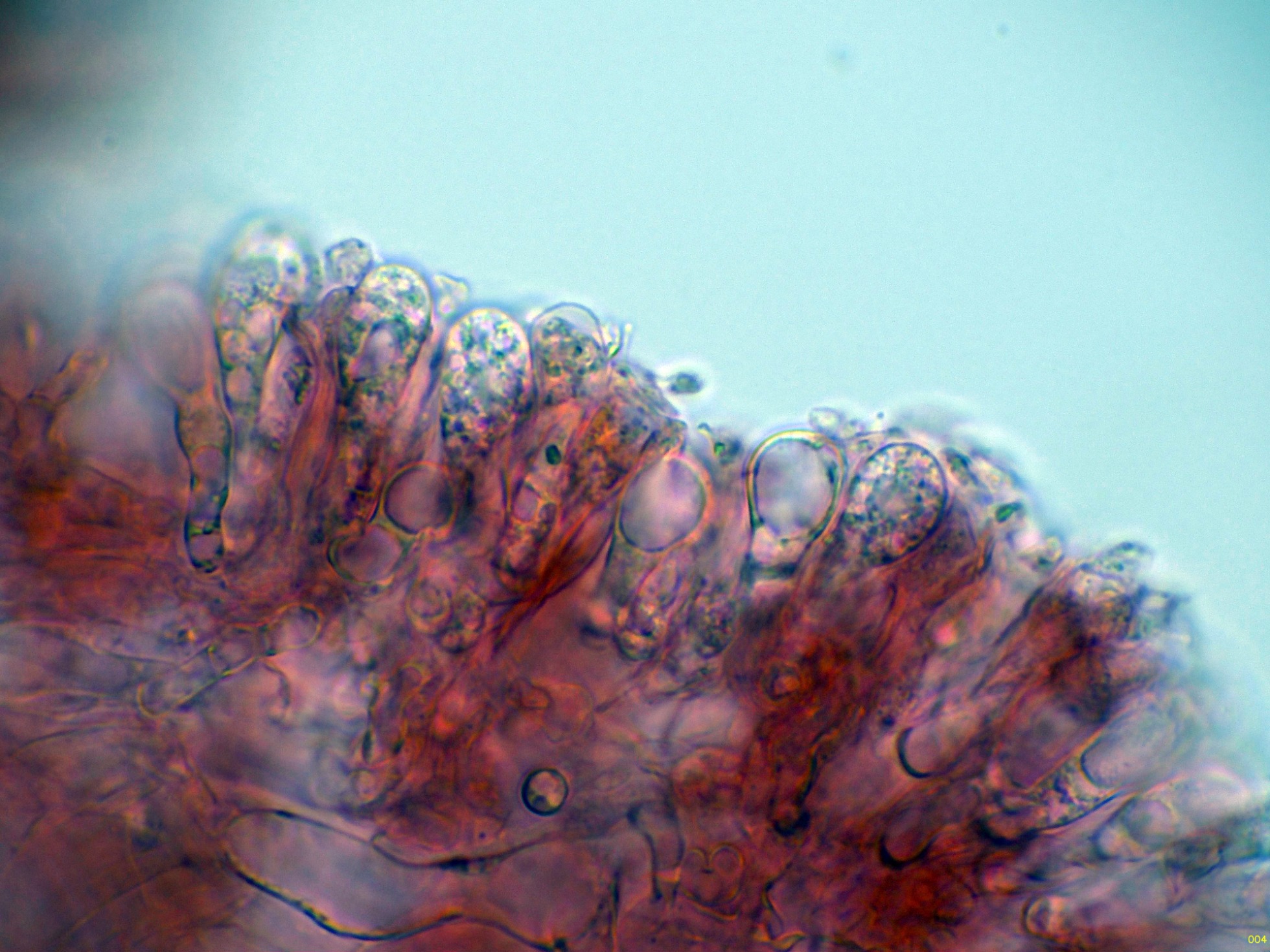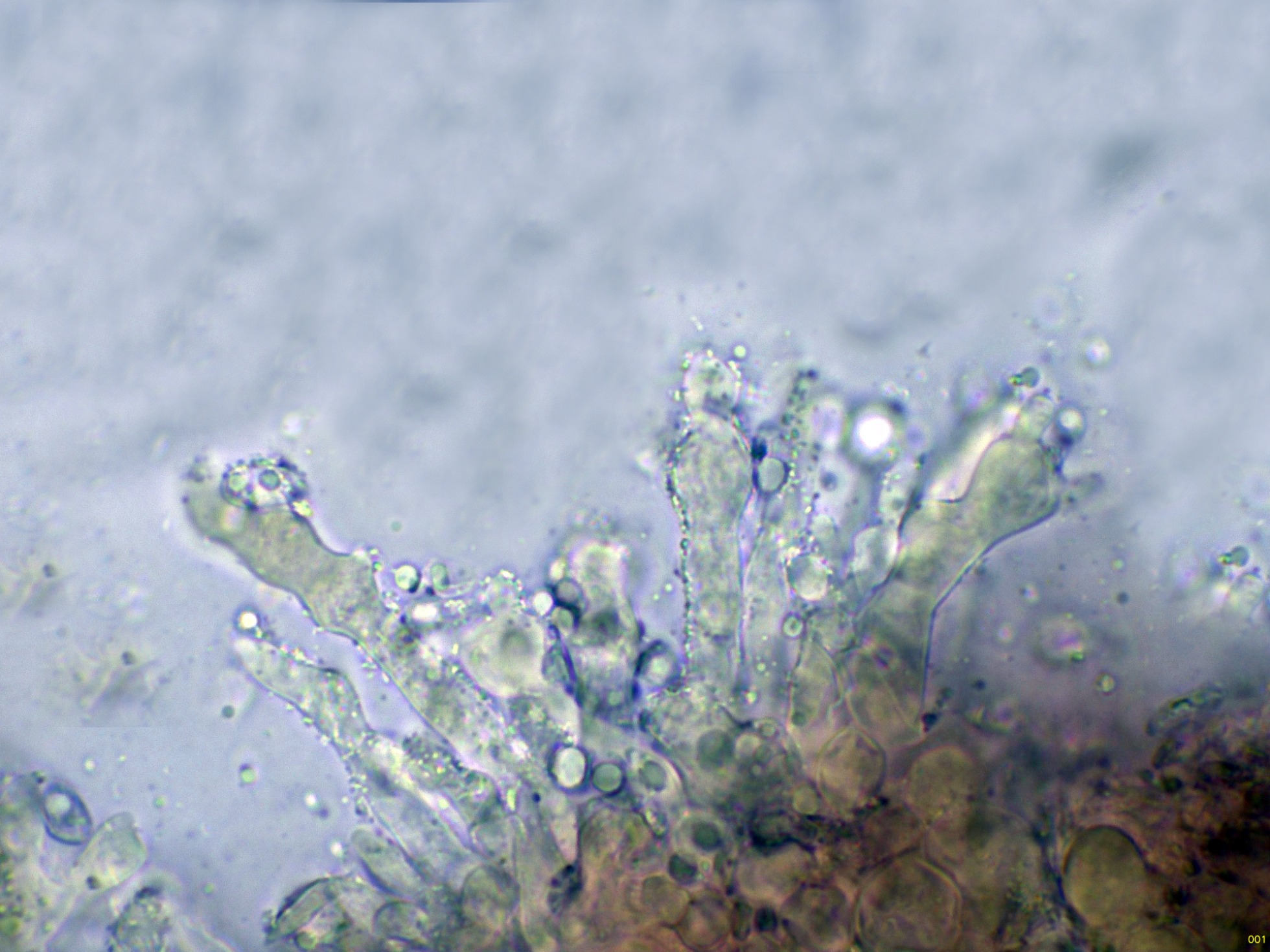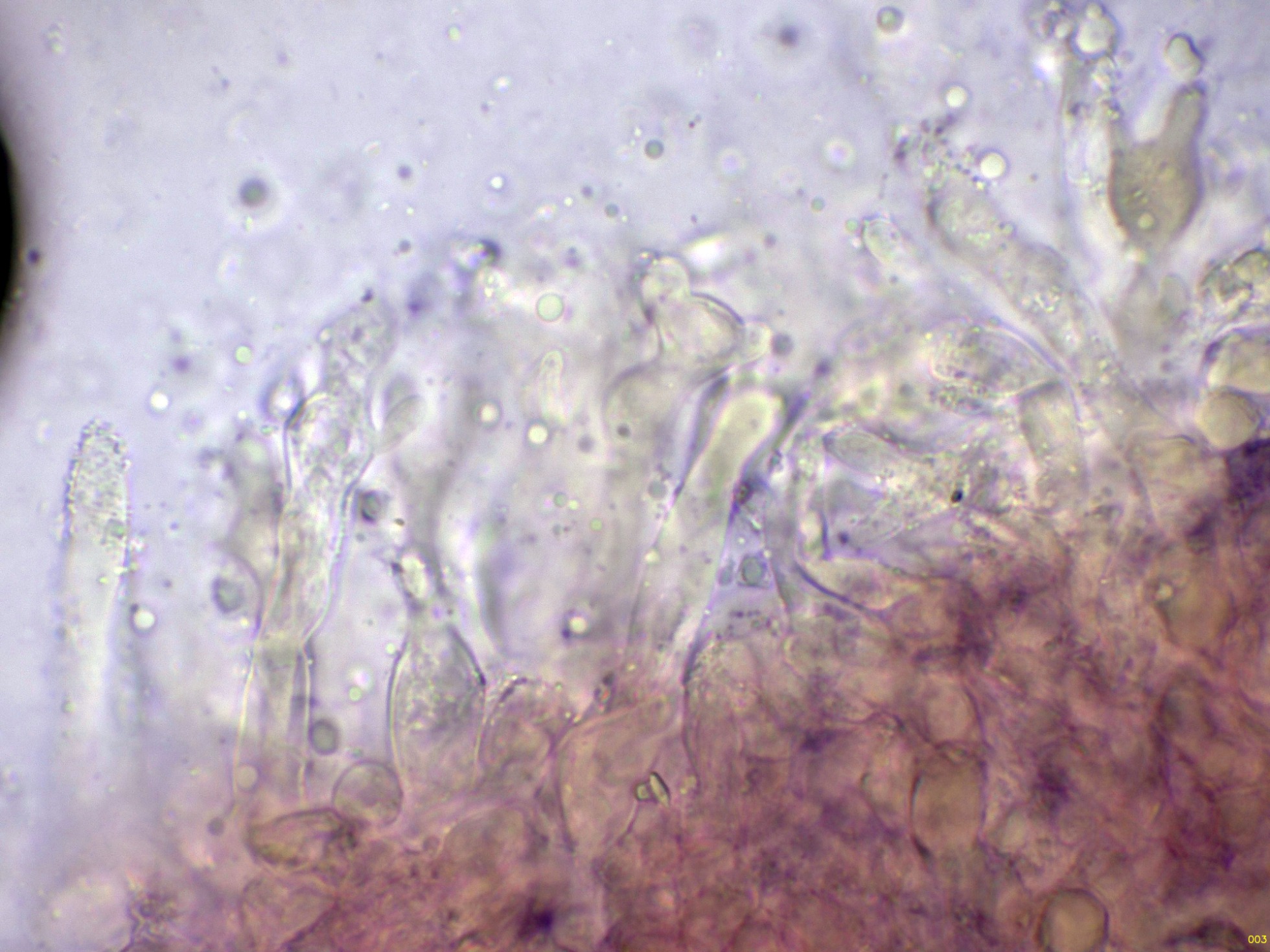 Los queilocistidios, cilíndricos, sinuosos, muchos de ellos incluso capitados y con digitaciones gruesas abundantes.