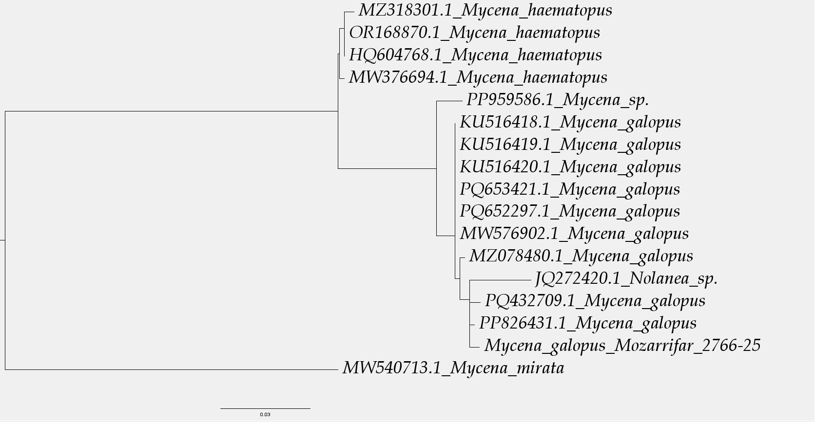 Vemos mi especie alineada perfectamente dentro del Clado de lo que molecularmente podemos considerar como Mycena galopus.