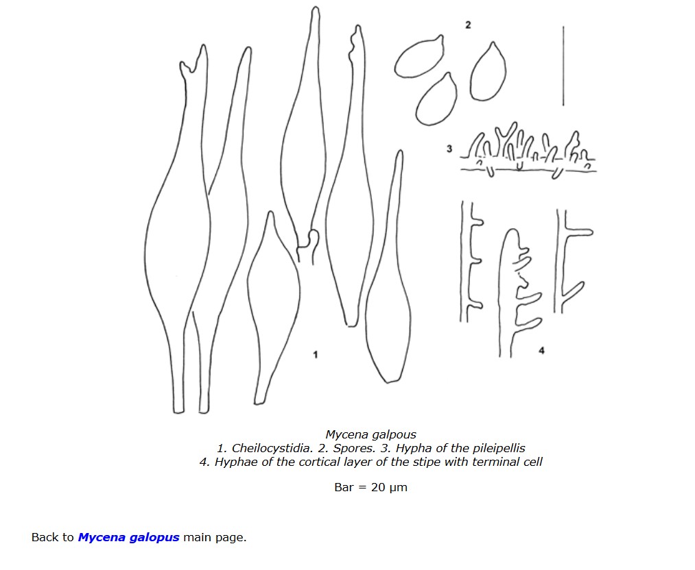 Aronsen cita unas medidas para las esporas de la Mycena galopus de 10-14 x 5-6 µm, Q 1.9-2.6, Qav~2.1, unas medidas considerablemente por encima de las de mi estudio, al igual que el cociente Q, en mi caso de Qe=1.7 y según Aronsen de Qe=2.1, además la morfología de los queilocistidios los describe como "fusiformes, pero también claviformes u obovoides, simples o furcados", nada que ver con mis imágenes, tampoco encajan las imágenes de la pileipellis que Aronsen la describe con "hifas de 1 a 3,5 µm de ancho, ramificadas, cubiertas de escasa a densamente con excrecencias de 2 a 4,5 micras, nada que ver con el presente estudio.