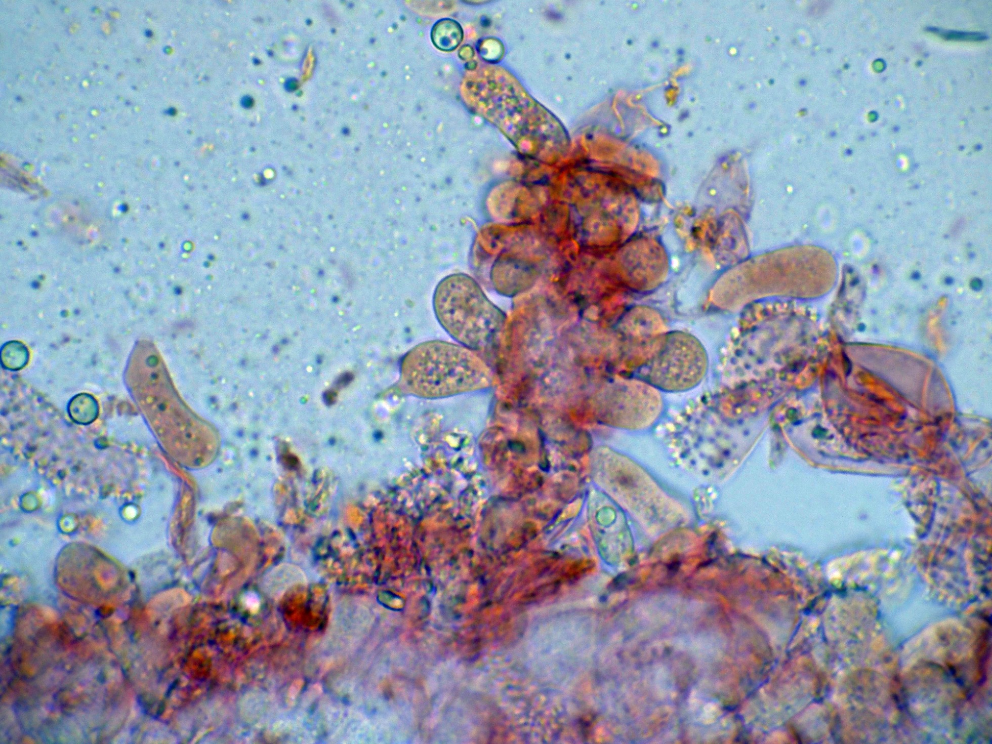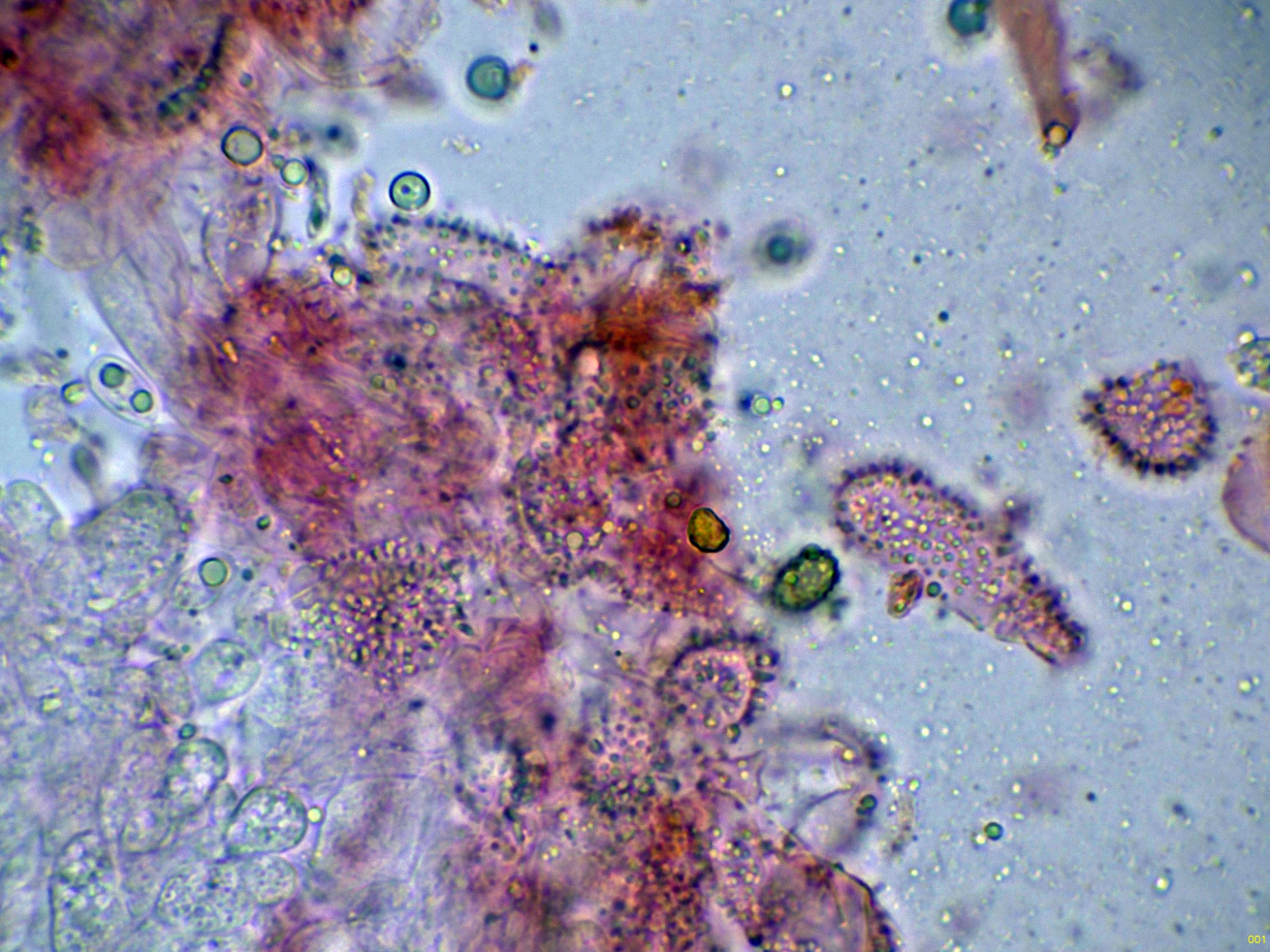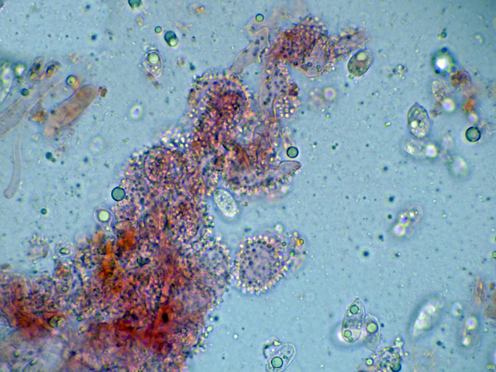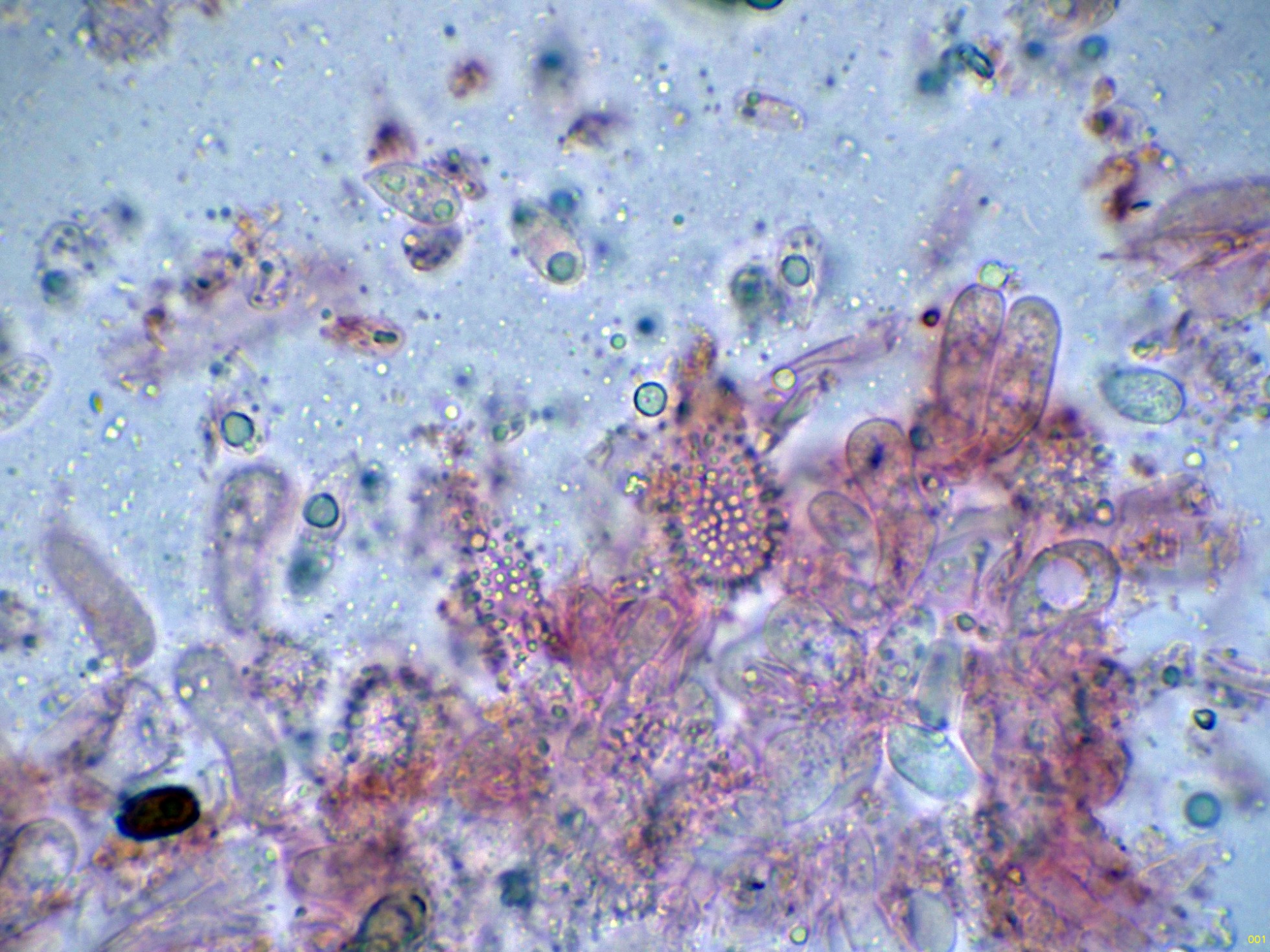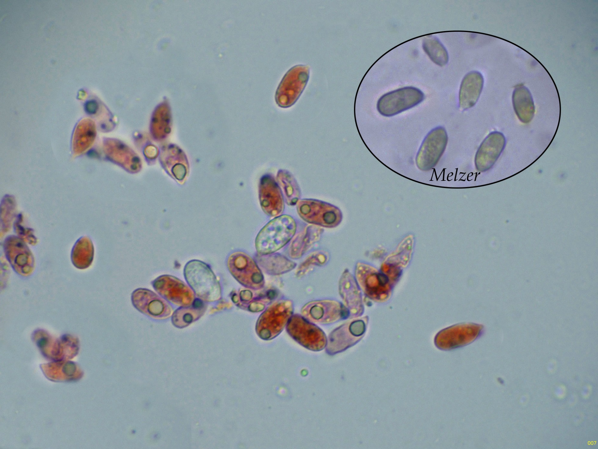 Unas esporas libres en el mismo medio, y en la miniatura superior derecha en Reactivo de Melzer, con reacción amiloide: