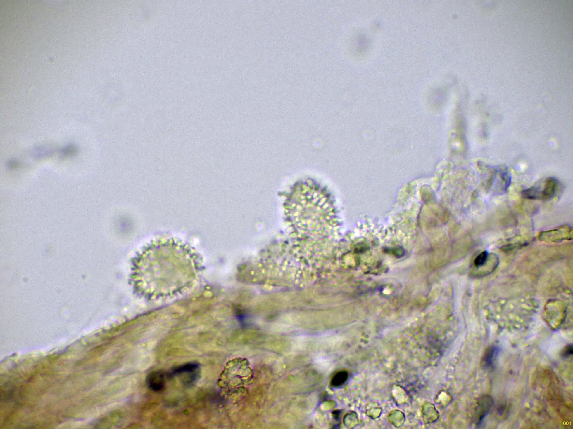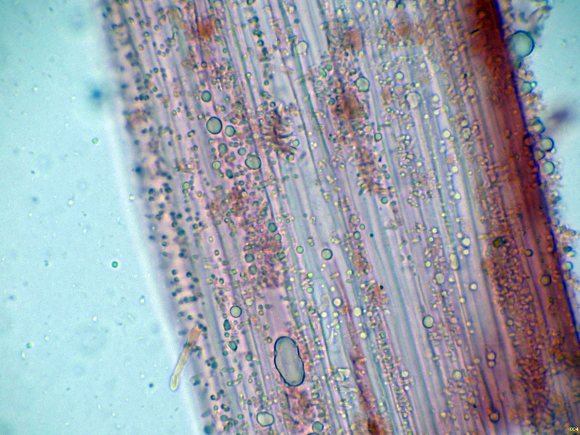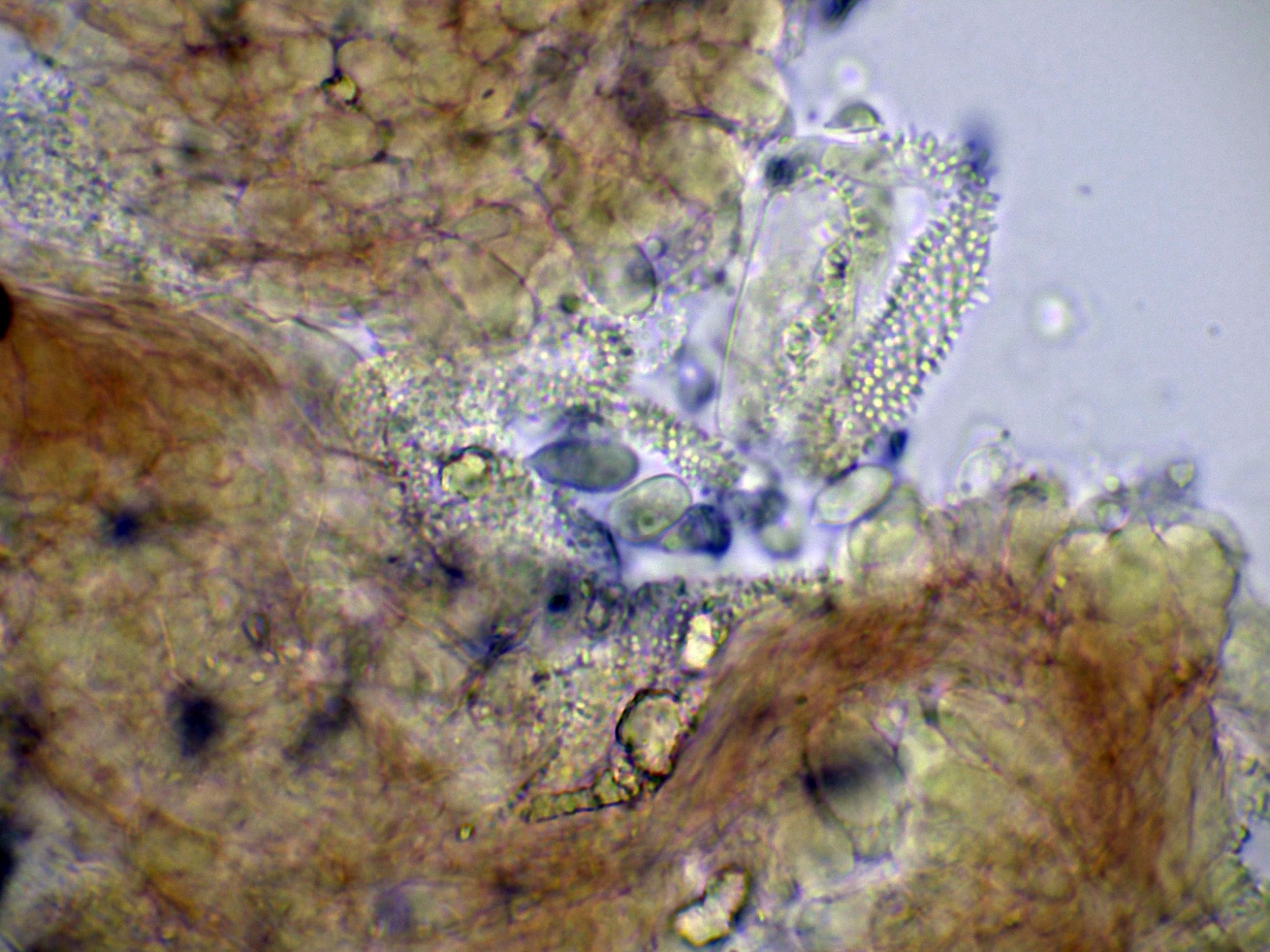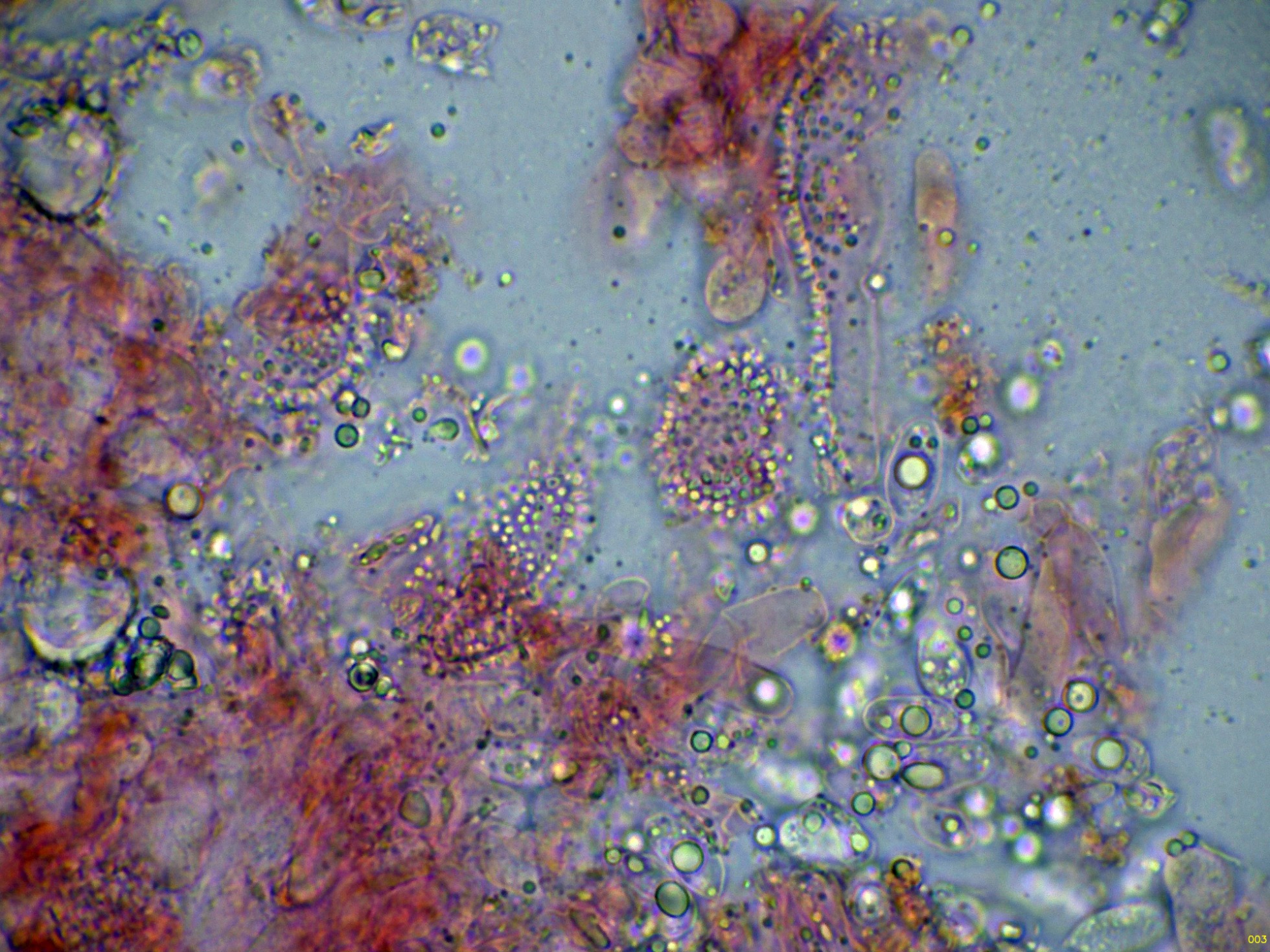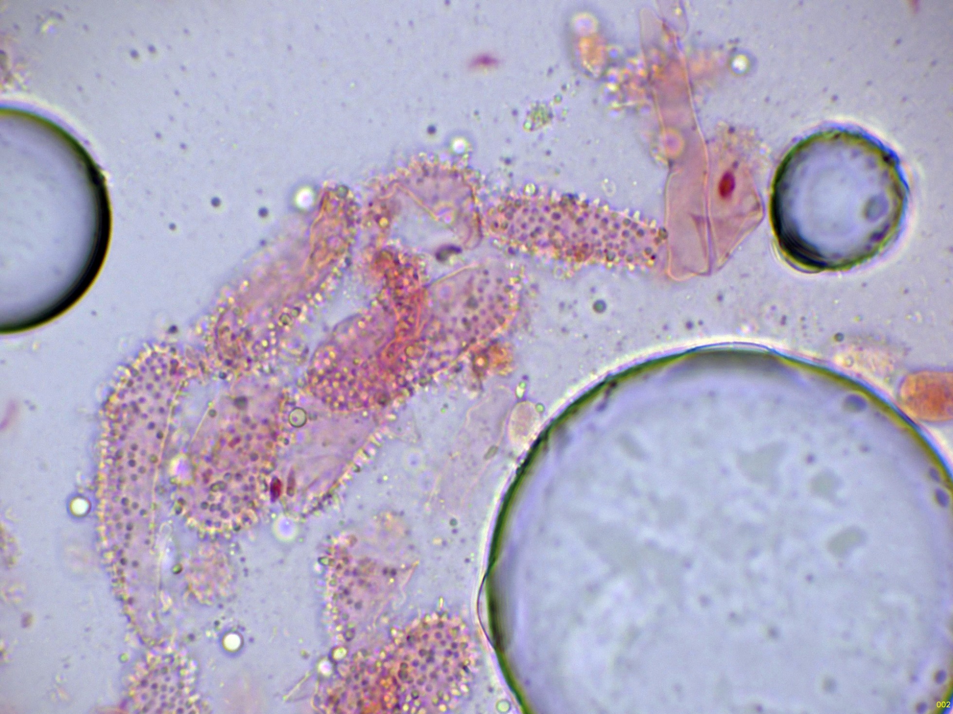 Unas esporas libres en el mismo medio, y en la miniatura superior derecha en Reactivo de Melzer, con reacción amiloide: