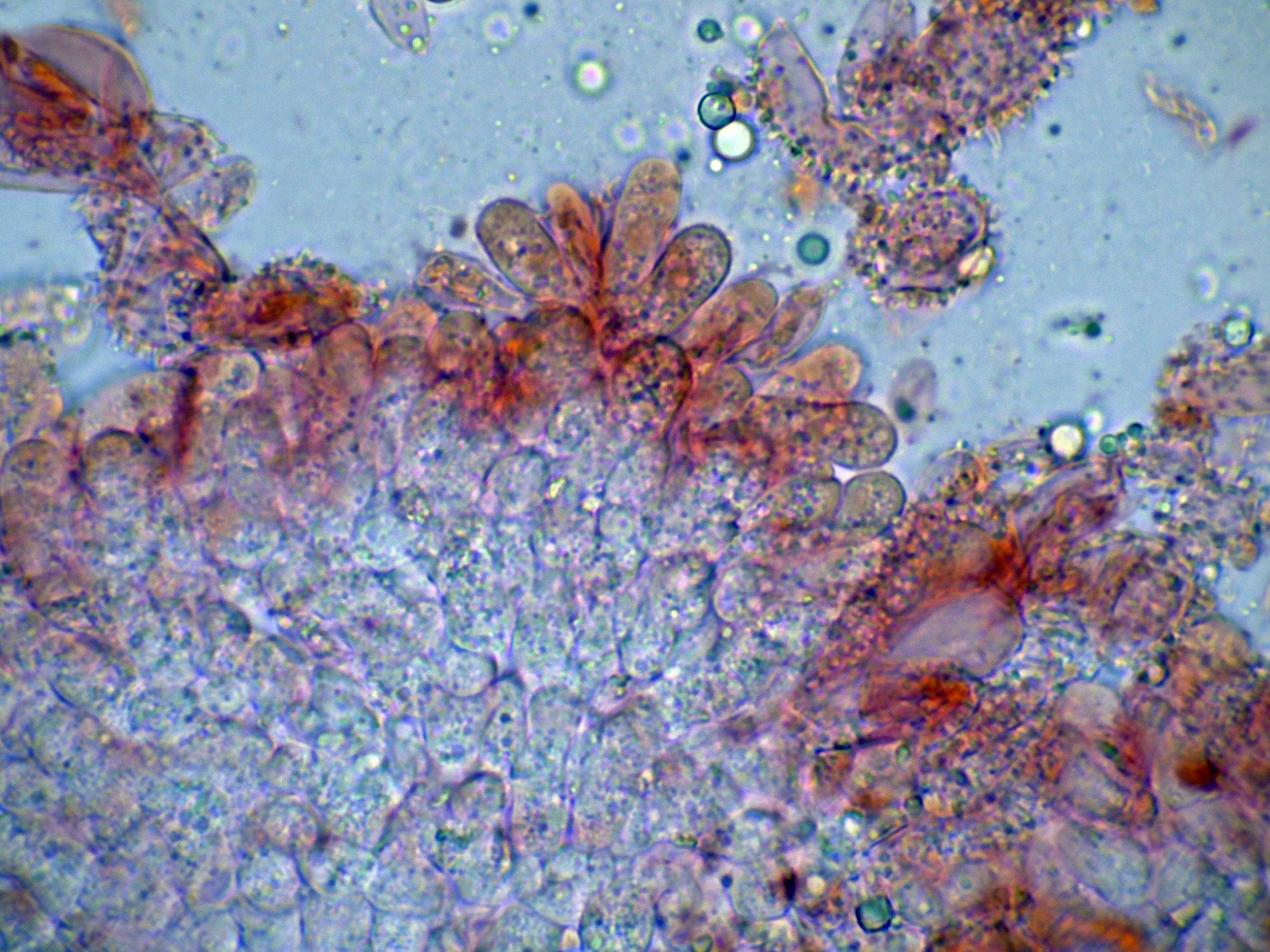 Basidios de 15-18 x 8-10 µm, ampliamente claviformes, con 2 o 4 esporas. Esporas (de 4 esporas): 9-11,8 x 3,5-5 µm, Q = 1,9-2,4 o (de 2 esporas): 10-13,5 x 3,5-5 µm, Q = 2,2-3,2, Qav ≈ 2,6, alargadas y con forma de pepita, a veces casi cilíndricas, lisas y amiloides. Queilocistidios de 15-27 x 8-15,5 µm, claviformes, obpiriformes, subcilíndricos a subglobosos, cubiertos de numerosas verrugas o excrecencias cortas de 1-2 µm de longitud, uniformemente espaciadas. Pleurocistidios ausentes. Trama lamelar dextrinoide, vinescente en el reactivo de Melzer. Hifas de la pileipellis de 2,5-20 μm de ancho, densamente cubiertas de verrugas, con celdillas terminales más o menos infladas. Hifas de la capa cortical del estípite de 1,8-5 µm de ancho, cubiertas de excrecencias cilíndricas de 1-5 µm de largo. Caulocistidios de 5-16 µm de ancho, claviformes, cubiertos de excrecencias cilíndricas estrechas. Conexiones de pinza presentes en todos los tejidos en la forma de 4 esporas; ausentes en la forma de 2 esporas.