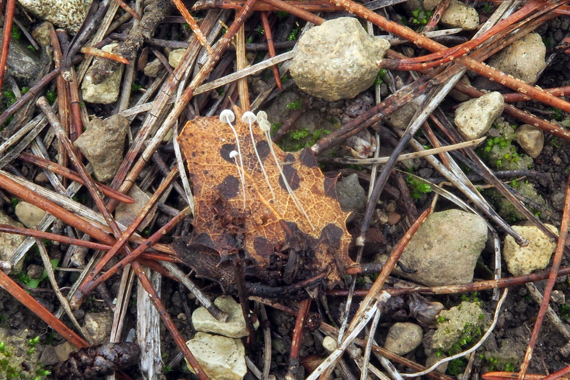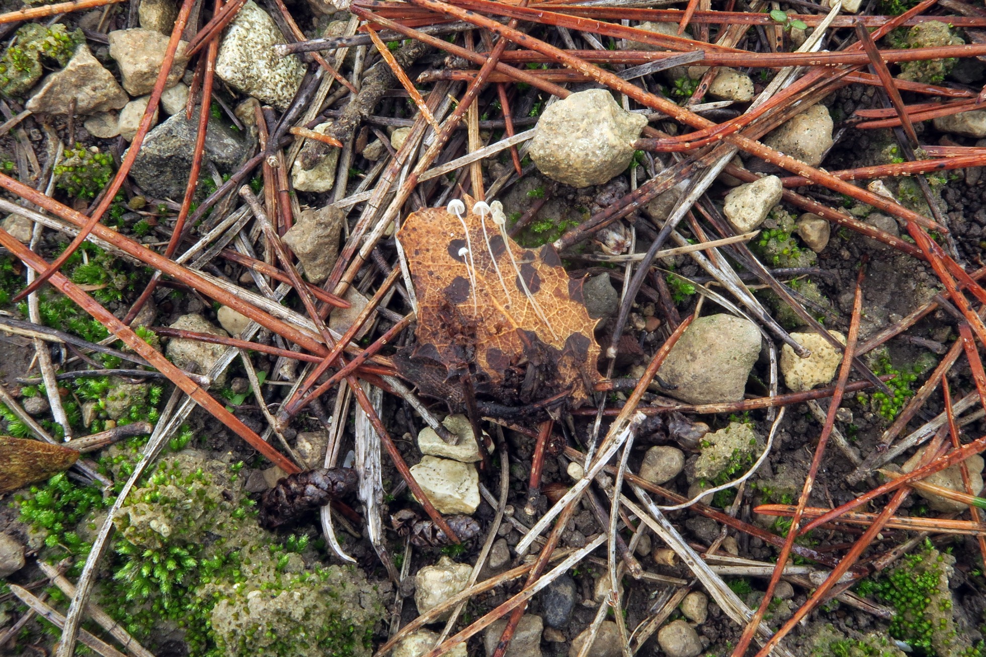 Una diminuta Mycena, localizada el 6 de diciembre pasado, brotando sobre hojas en descomposición de Quercus rotundifolia.