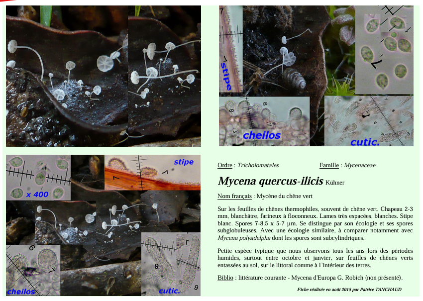 En la ficha se indica asimismo unas medidas muy parecidas a las del documento de Kühner, con unas medidas para las esporas de la Mycena quercus-ilicis de 7-8.5 x 5-7 µm., muy concordantes con las indicadas por Kühner, y además en la ficha se indica claramente que esta se distingue por sus esporas subglobosas, y como posibles confusiones a comparar con la muy parecida Mycena polyadelpha, con esporas subcilíndricas.