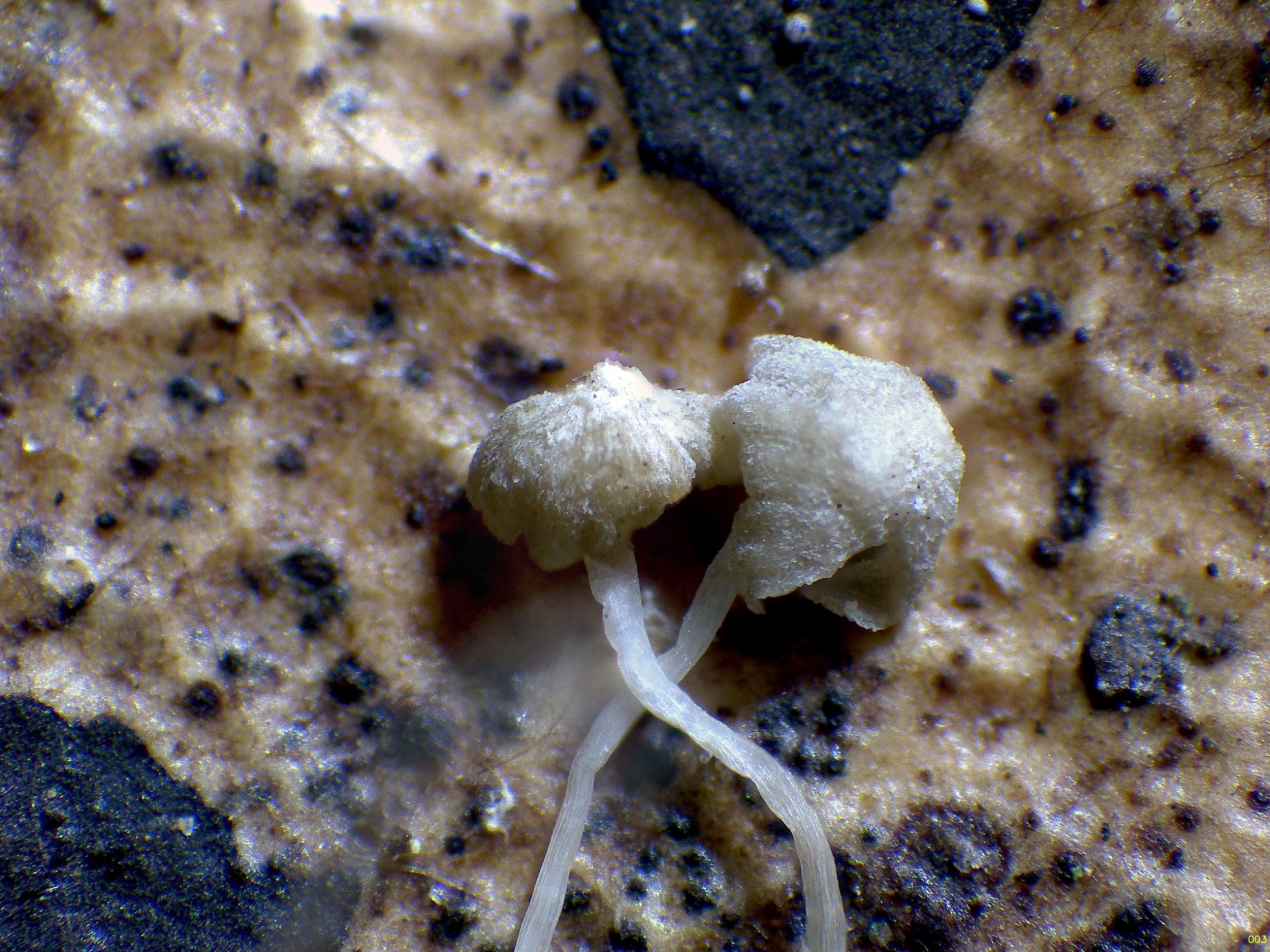 Finales de otoño.Píleo de 0,5-2,5 (-4) mm de ancho, hemisférico, parabólico o convexo, a veces algo deprimido centralmente, sulcado, apenas estriado, pubérulo o pubérulo granular, más o menos glabrescentes, muy delgados, translúcidos en partes, blancos. Láminas (0-)4-8(-11) que alcanzan el estípite, subhorizontales a ligeramente arqueadas, a menudo muy estrechas, ampliamente adnadas pero no siempre alcanzando el estípite, el borde recto a cóncavo, blancas. Estípite de 5-50 x 0,1-0,2 mm, filiforme, flexuoso, igual, pruinoso, glabrescentes en la mayor parte, pero pubérulo en la base, blanco acuoso a blanco, ocasionalmente algo pardusco en la base, insticioso. Olor ninguno.